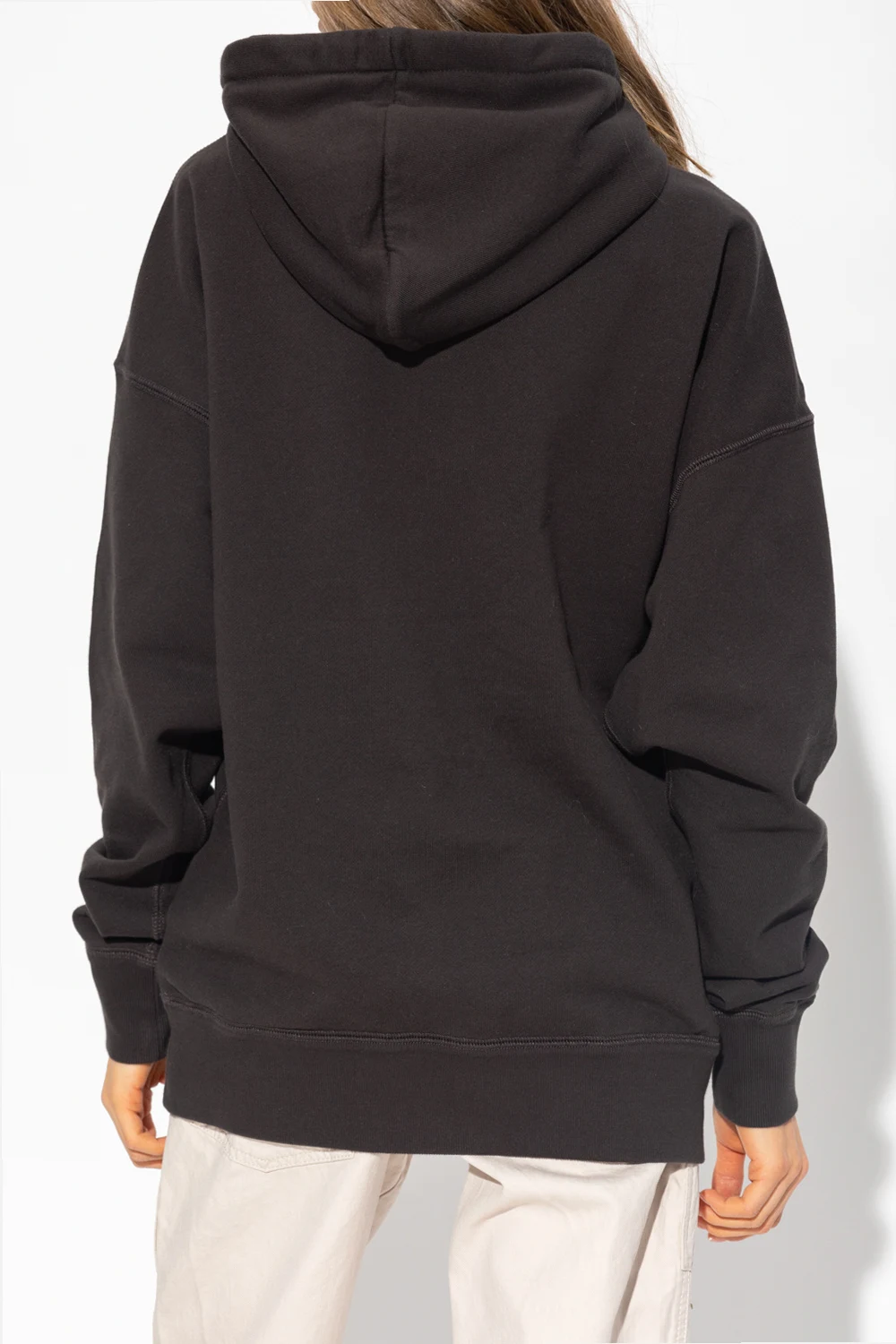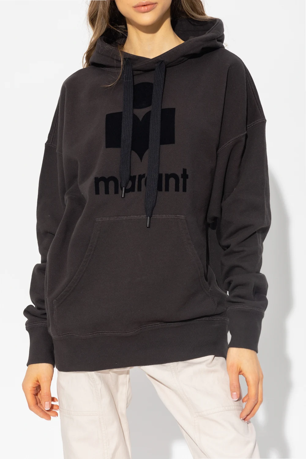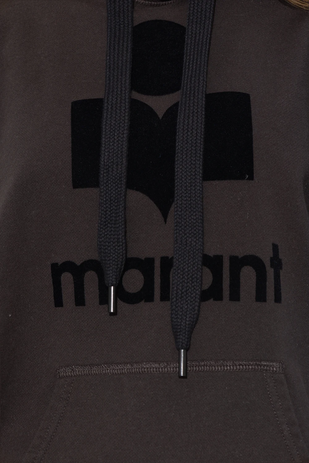 Black ‘Mansel’ hoodie from Marant Etoile. Crafted from cotton, this garment features a logo pattern with a velvet finish, drawstring hood, slip pocket and ribbed trims at the hem and cuffs.