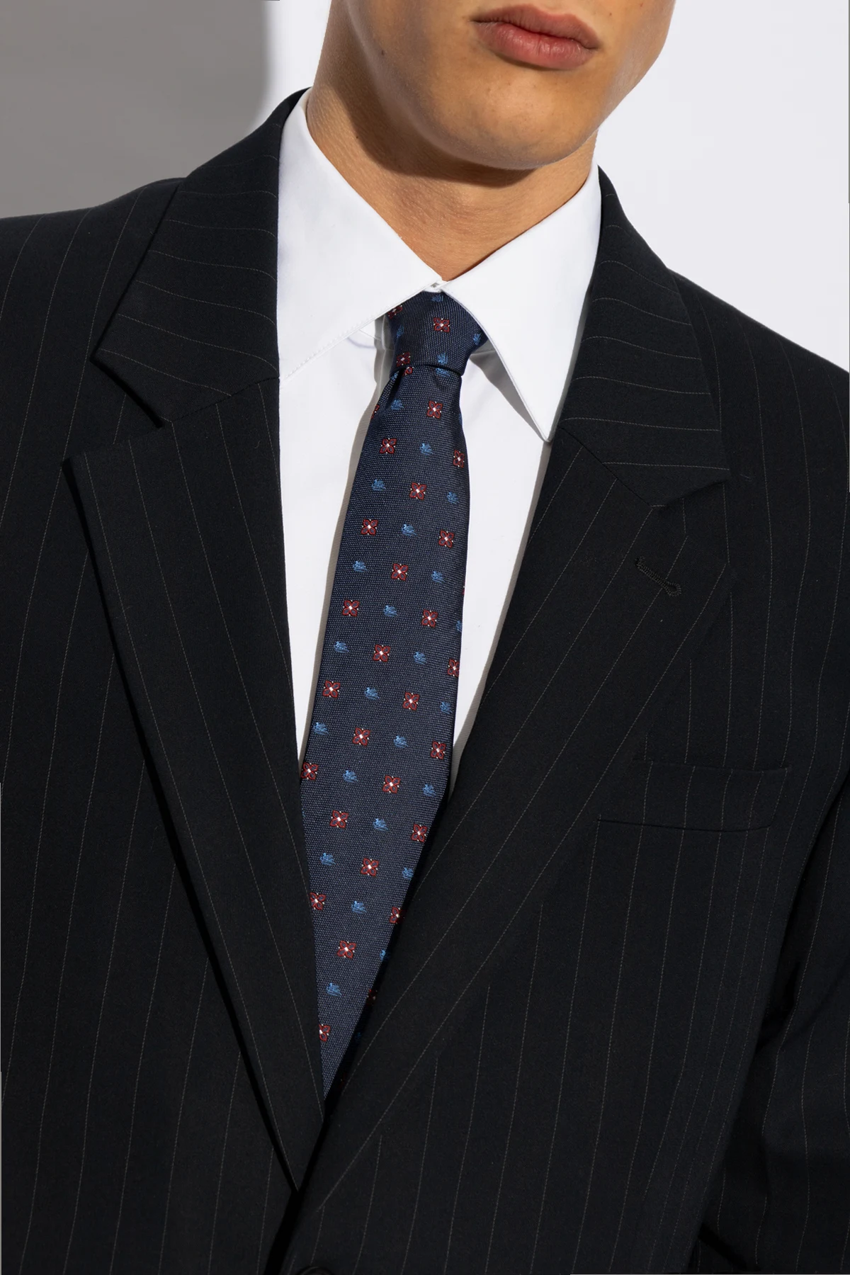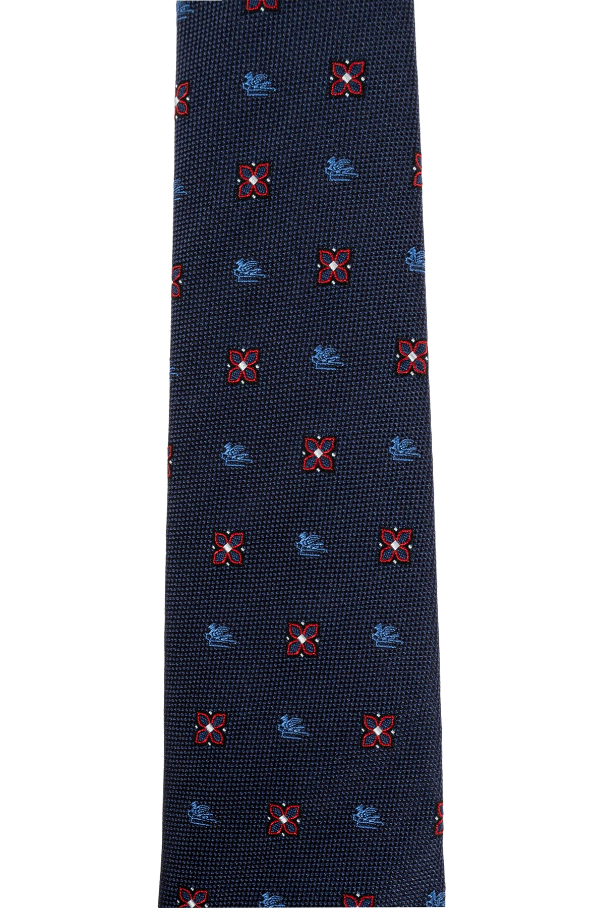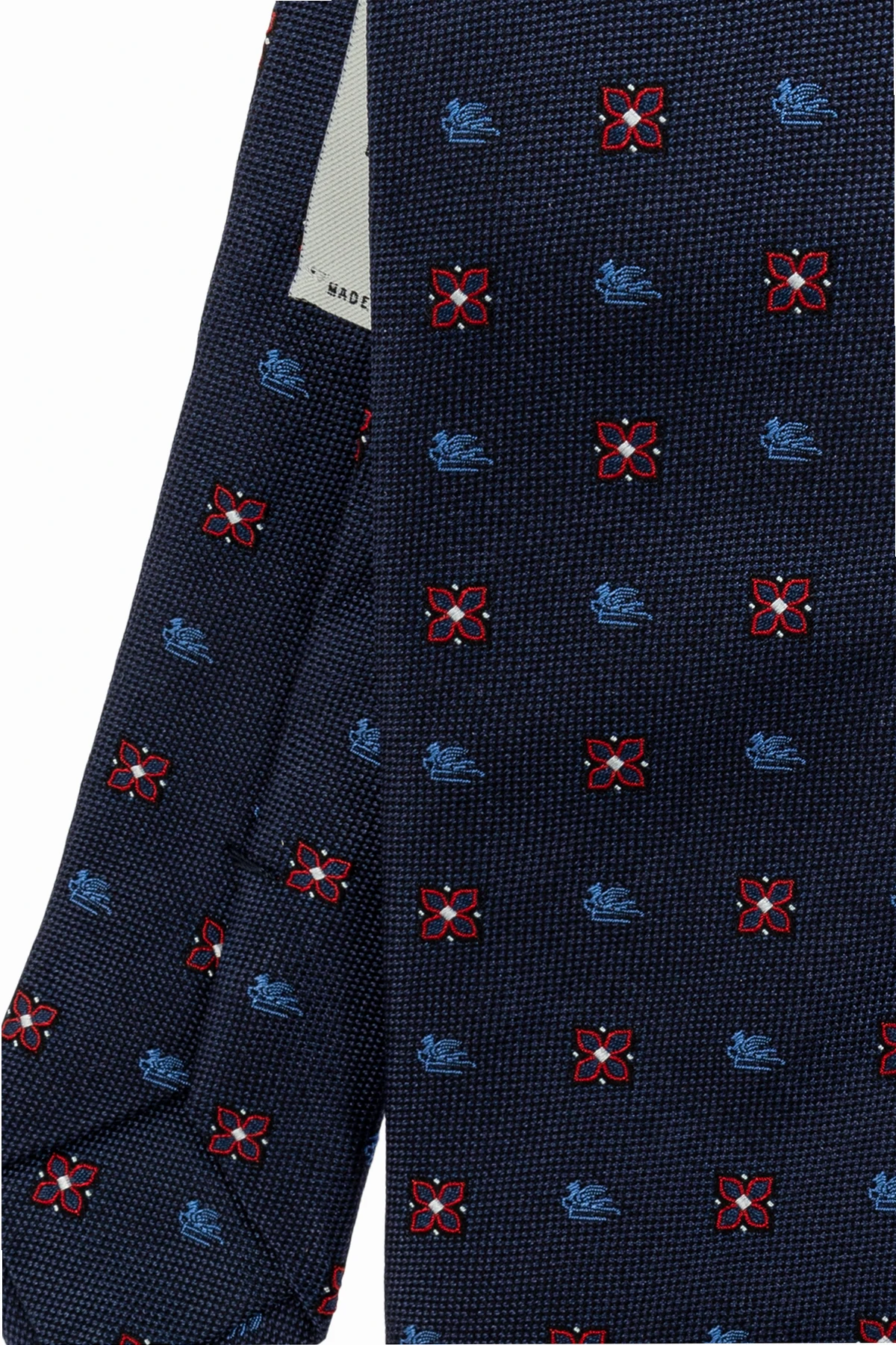 Wir präsentieren die Seidenkrawatte der Marke Etro, die raffinierte Eleganz mit einem Hauch exotischen Charmes vereint. Hergestellt aus 100% Seide, begeistert diese marineblaue Krawatte mit einem subtilen Muster aus roten Blumenmotiven und blauen Elementen, die dezent über die gesamte Fläche verteilt sind.