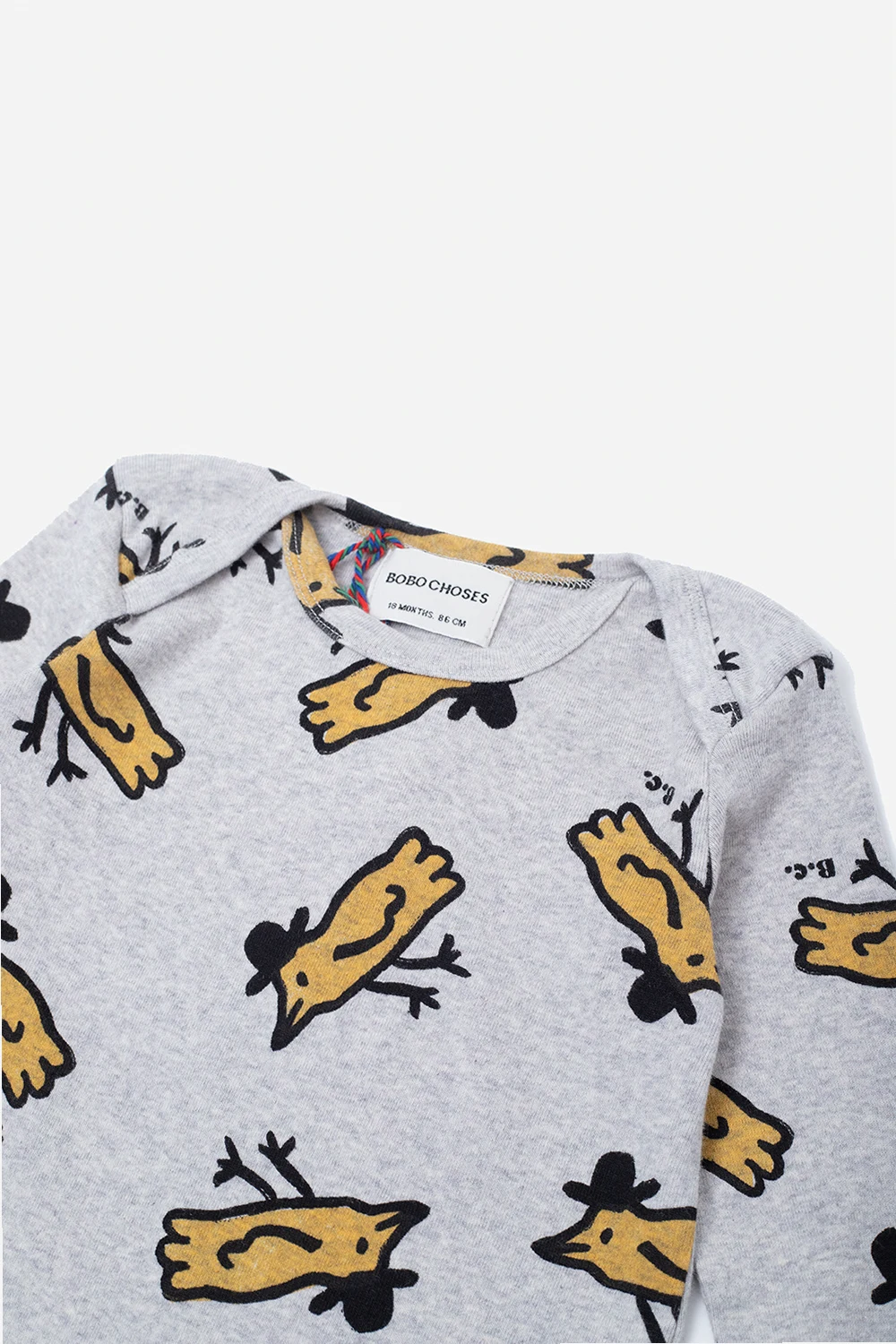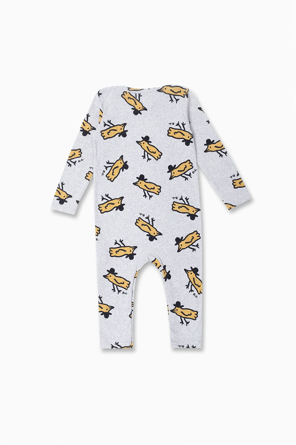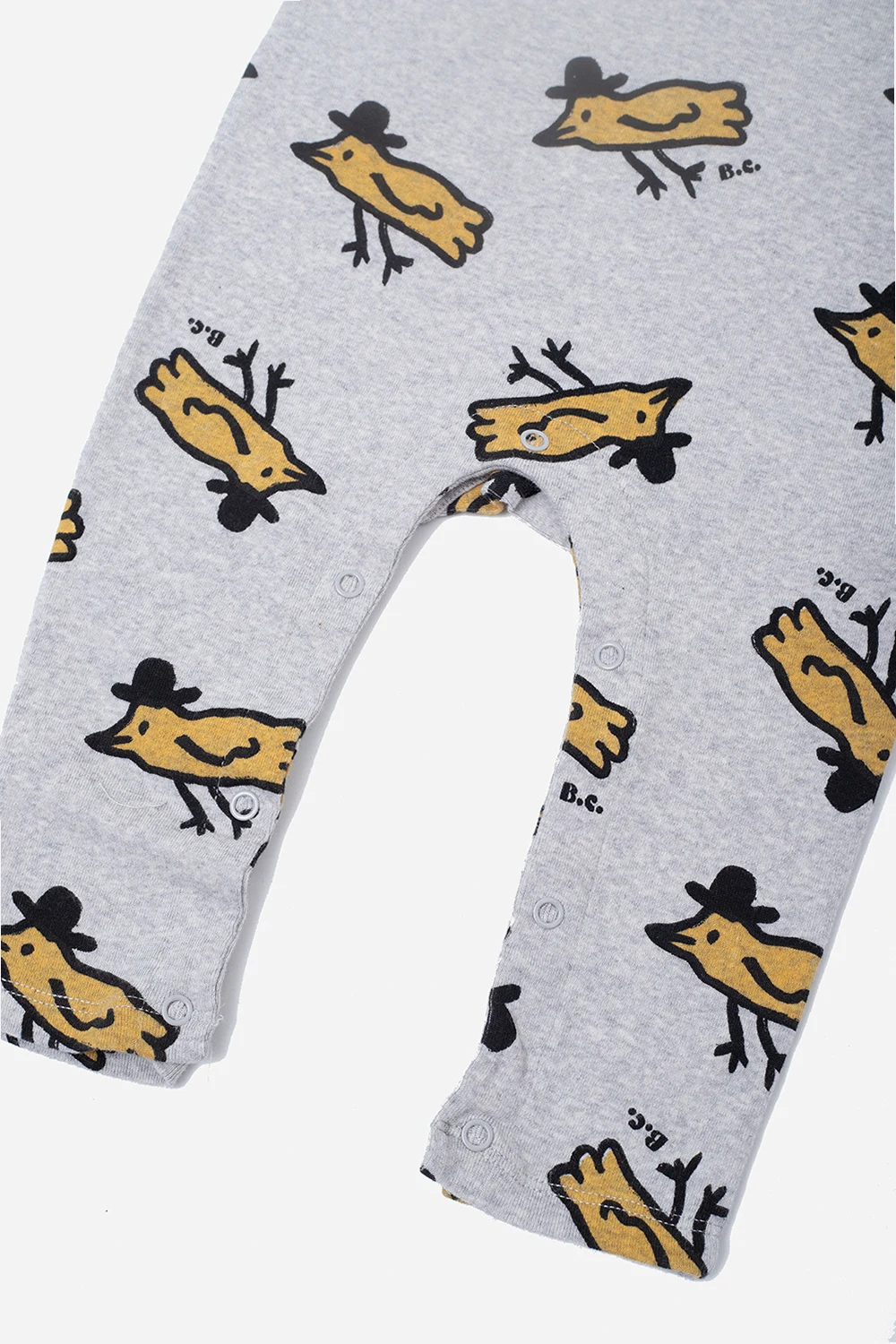 Grey babygrow from Bobo Choses. Crafted from organic cotton, this style showcases a yellow and black ‘Mr. Birdie’ motif, a round neck, long sleeves and snap closures on the bottom.