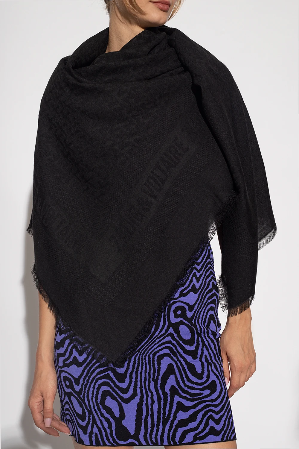 Black ‘Glenn’ shawl from Zadig & Voltaire. Embellished with a logo pattern, this item features raw edges.