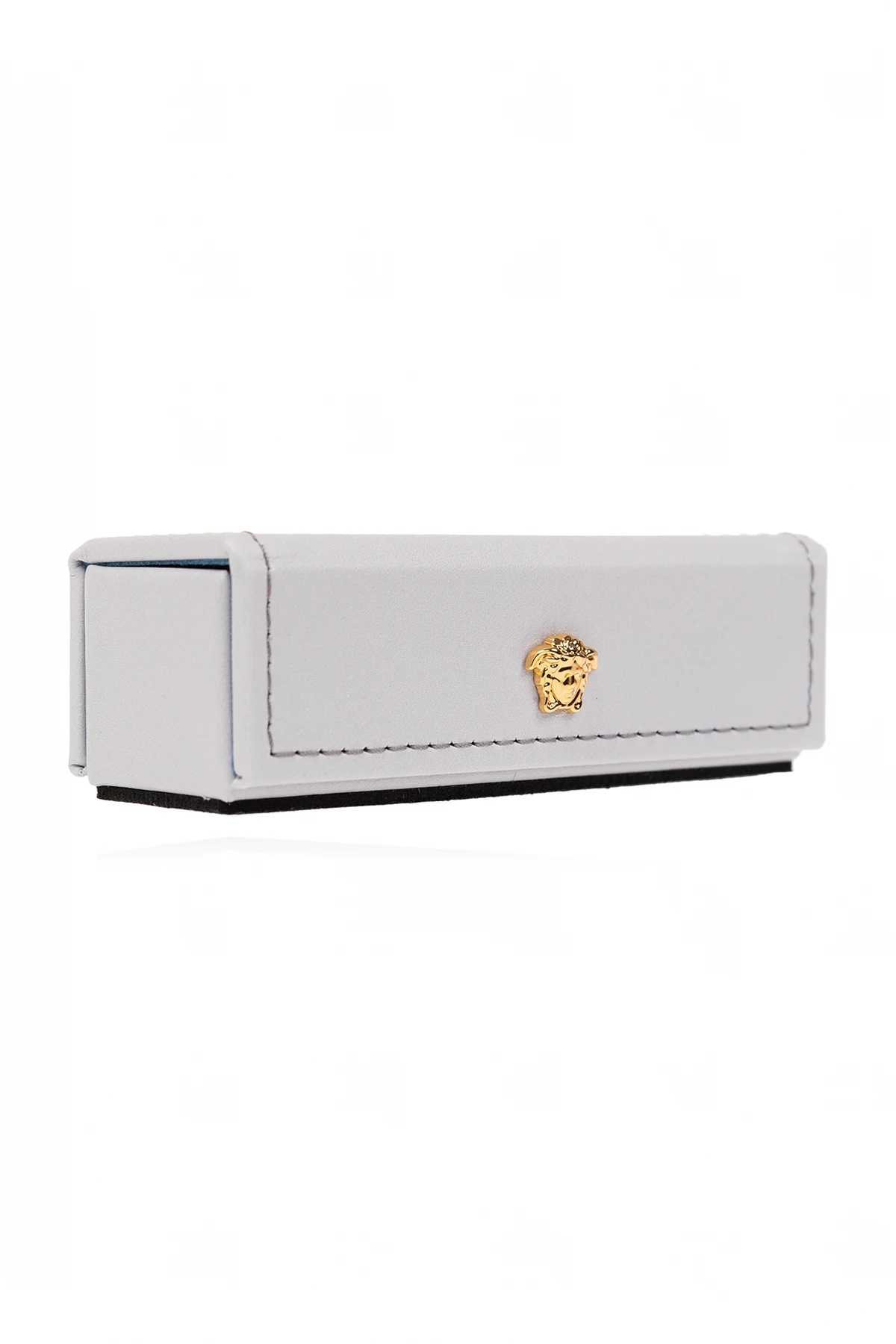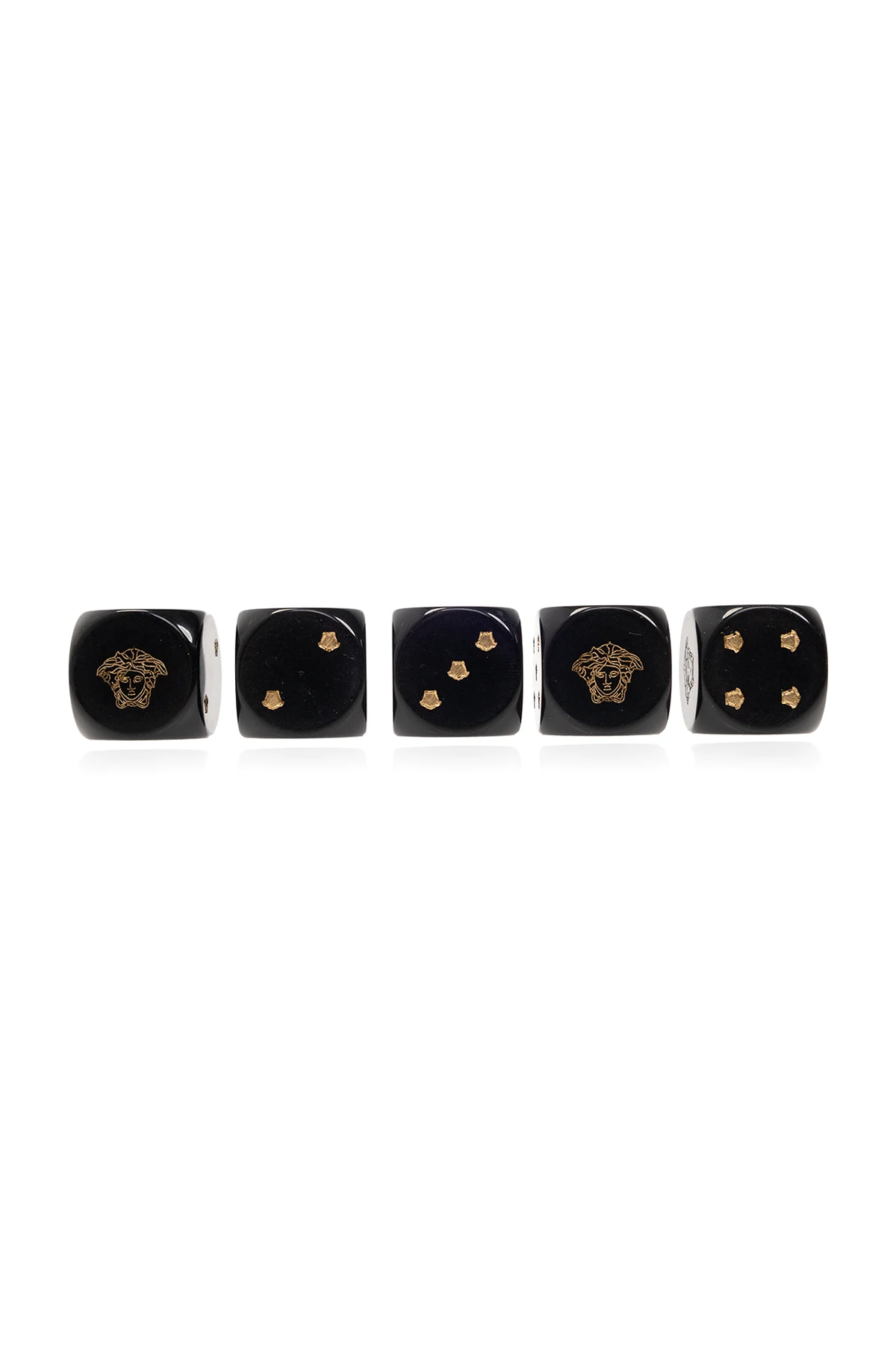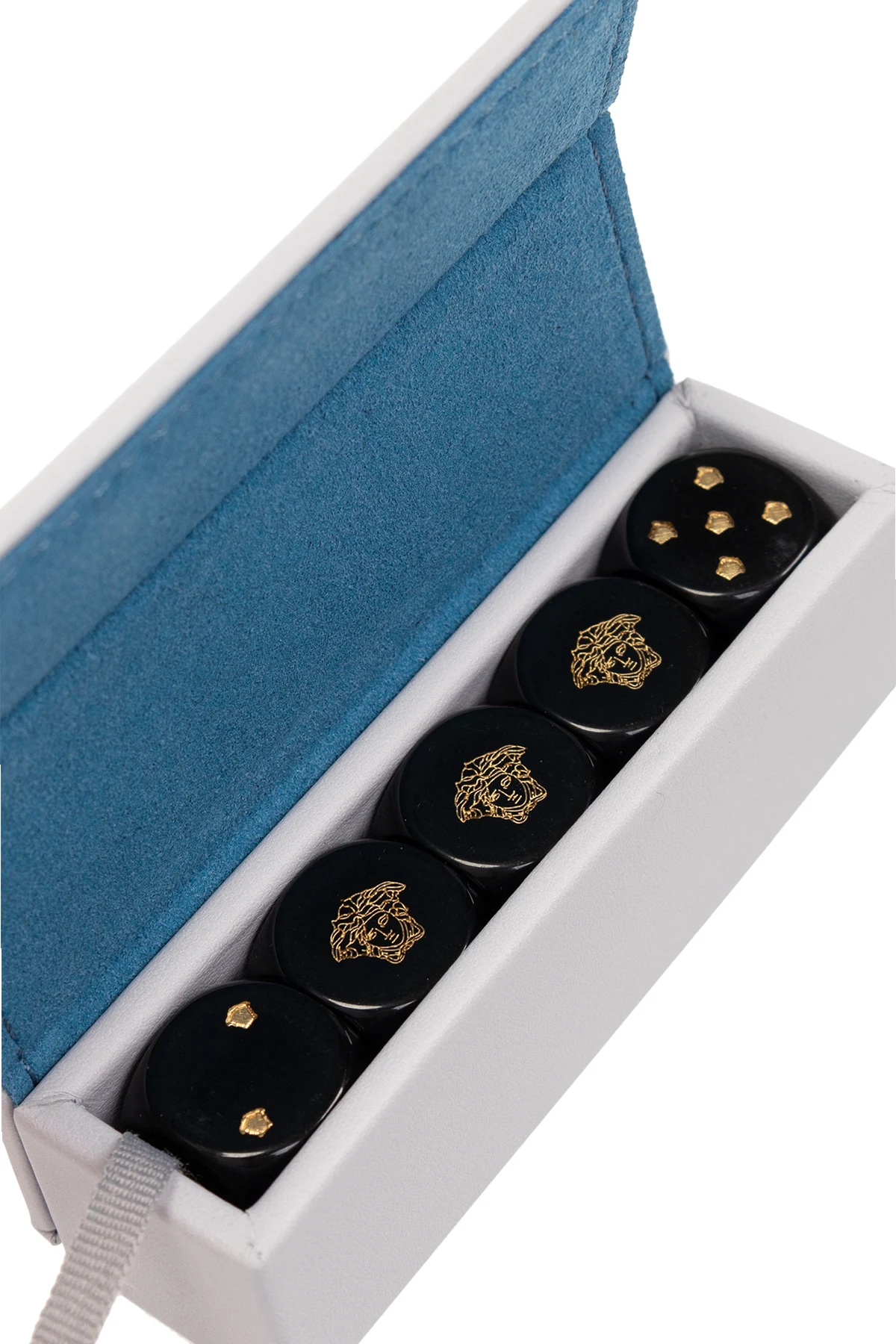 Set of five black dice from Versace Home. It comes in a light grey calf leather case with a magnetic fastener and the brand's signature gold-tone Medusa hardware.