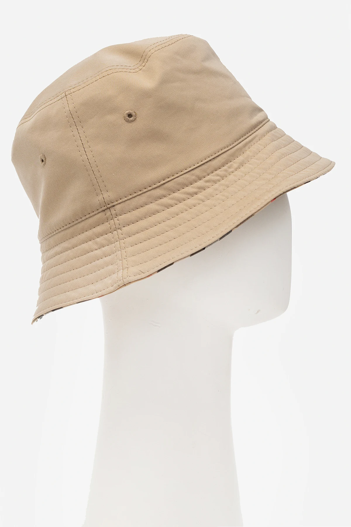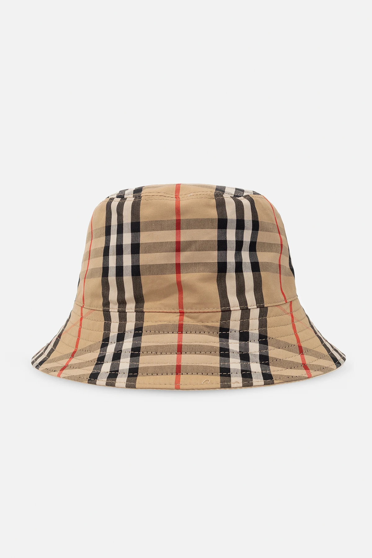 Beige bucket hat from Burberry Kids. Crafted from cotton, this item has lining decorated with the iconic check.