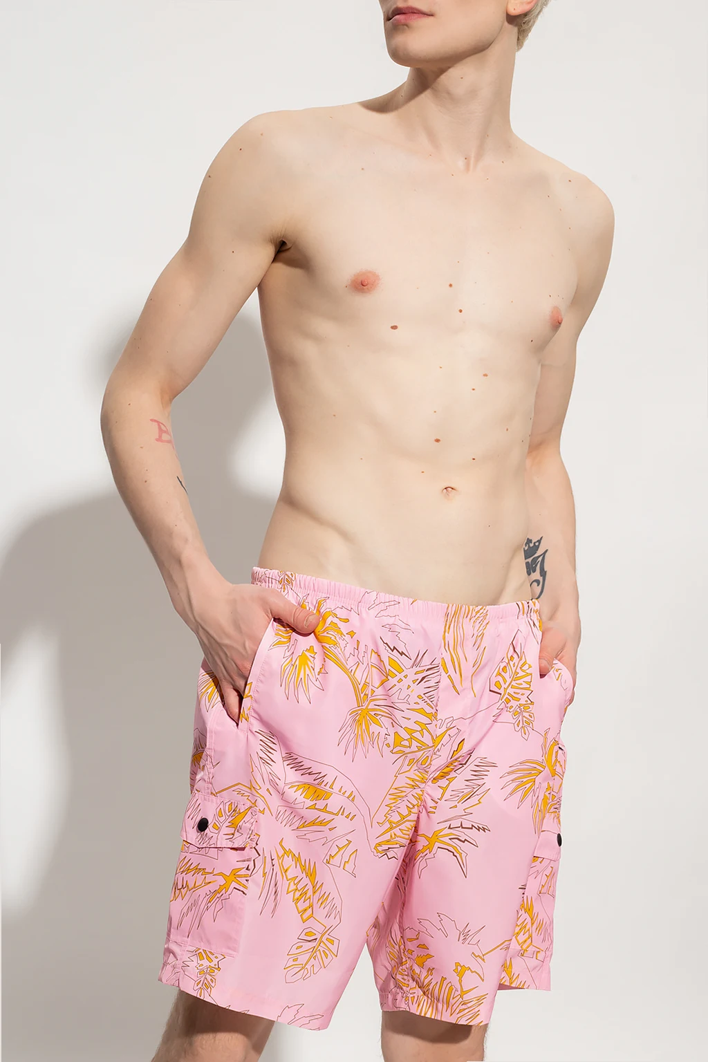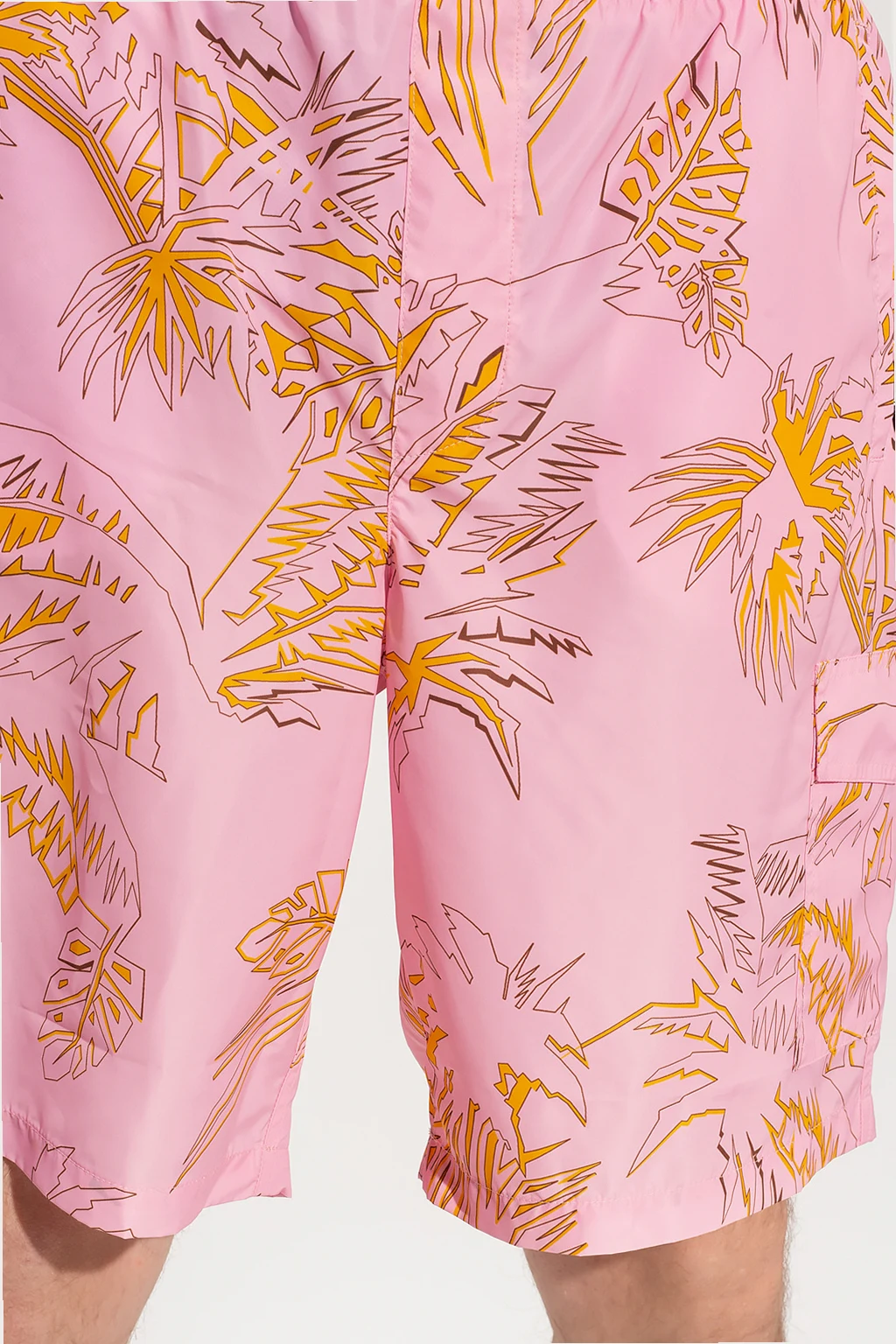 Pink swimming shorts from Palm Angels. Decorated with an orange and brown palm motif, this pair features a drawstring waistband, a logo tag on the side, two slip pockets and two snap-fastened flapped pockets on the front and one velcro-fastened pocket at the back.