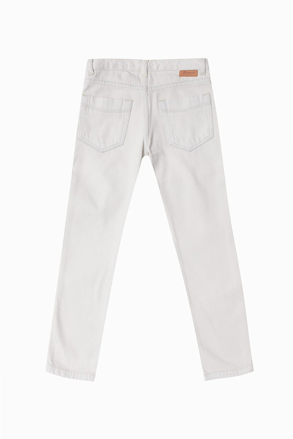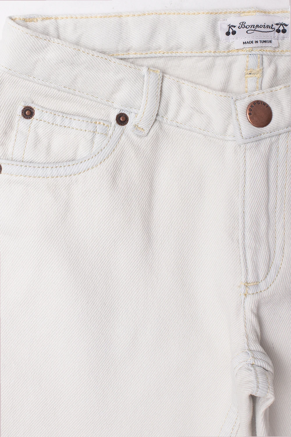 Light grey jeans from Bonpoint. Made of cotton, this pair features a zip fly with a button, classic five pockets, a brown logo patch on the back and long legs.