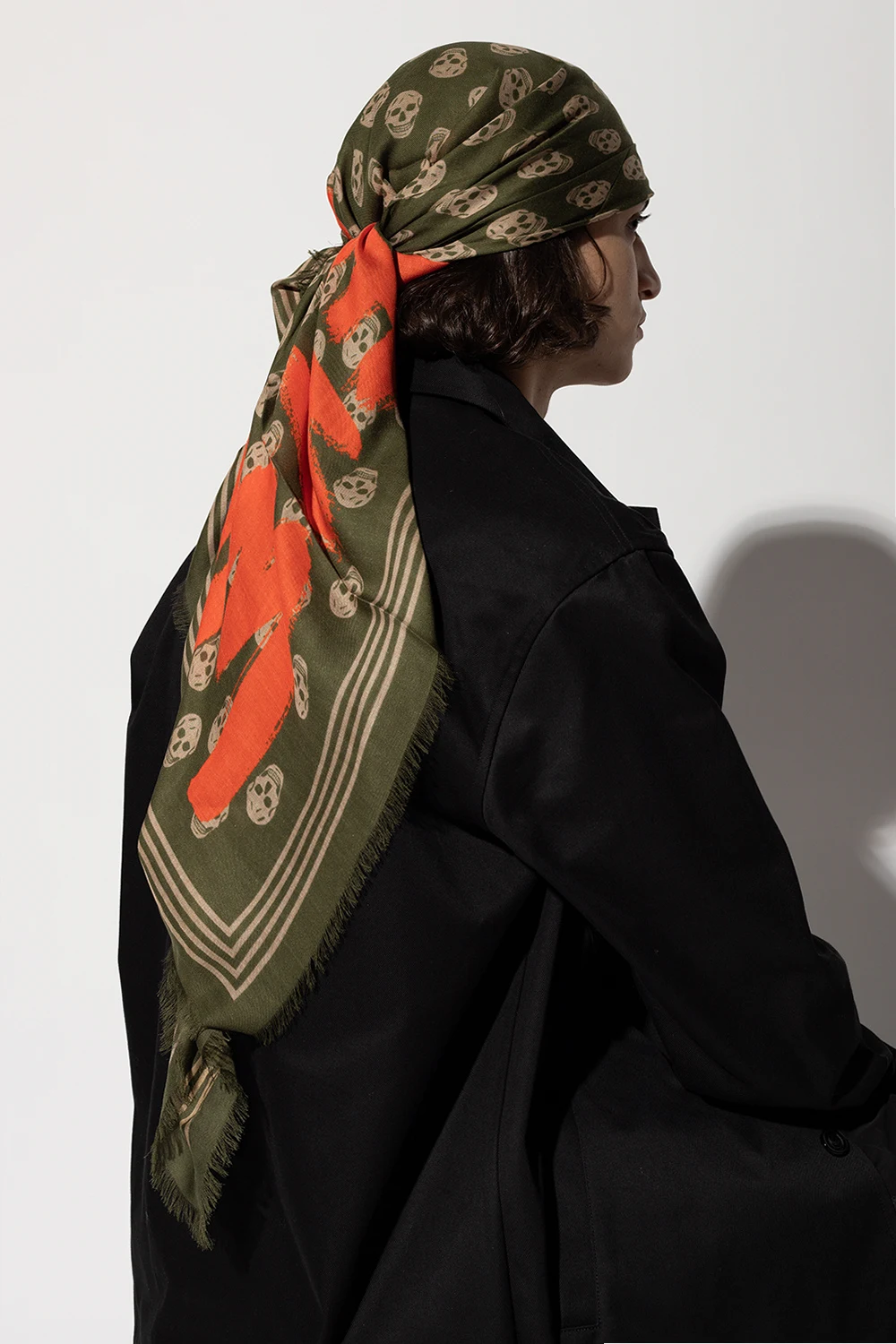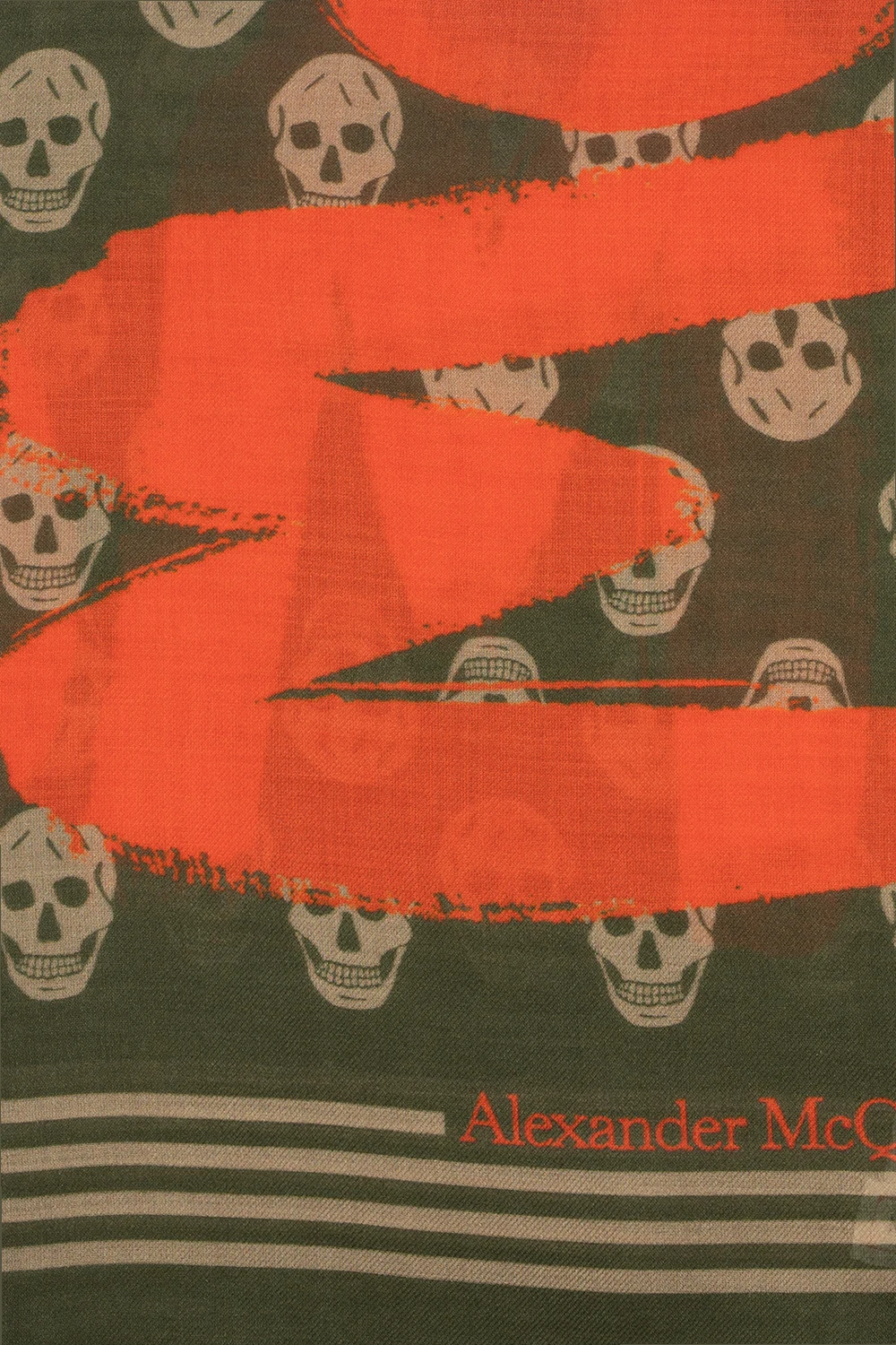 Green, beige and red shawl from Alexander McQueen. Embellished with the brand's logo and the signature motif of the skull, this item features frayed ends.