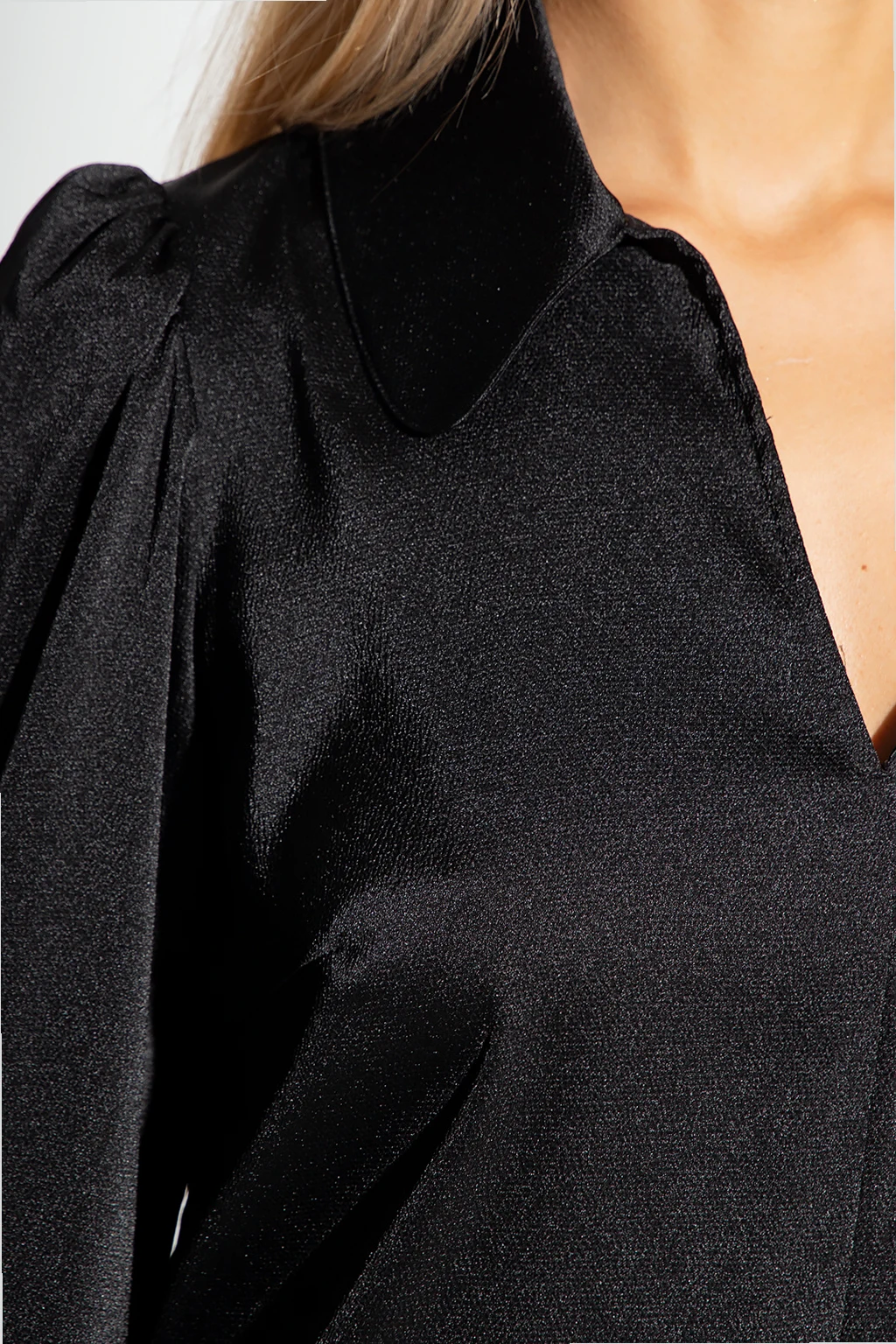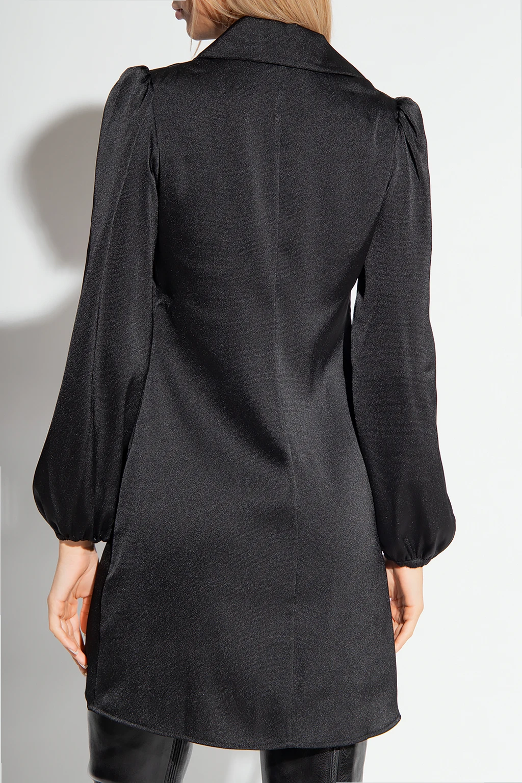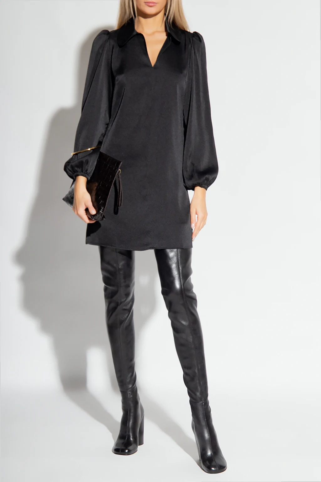 Black ‘Margot’ dress from Samsoe Samsoe. Crafted from a fabric blend including recycled material, this style features a glossy finish, a V-neckline with a collar and long puff sleeves with elasticated cuffs.