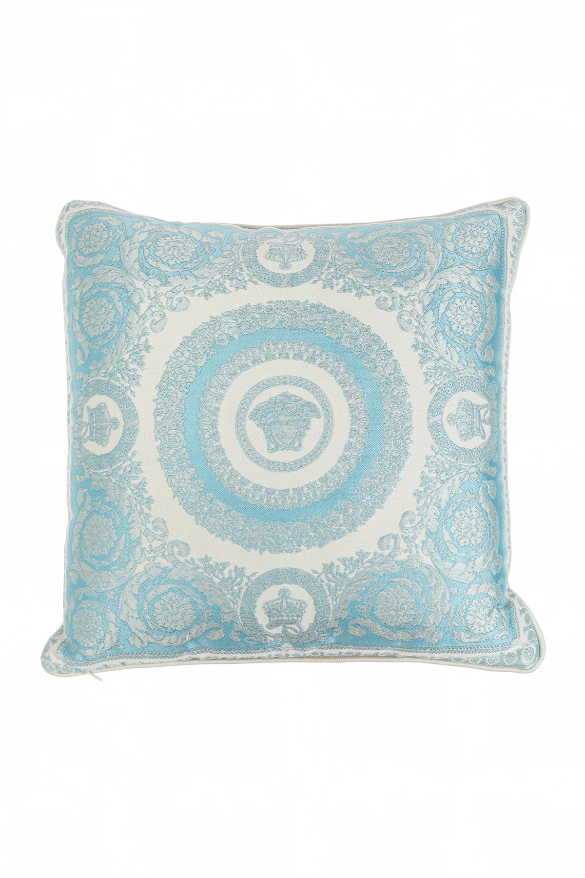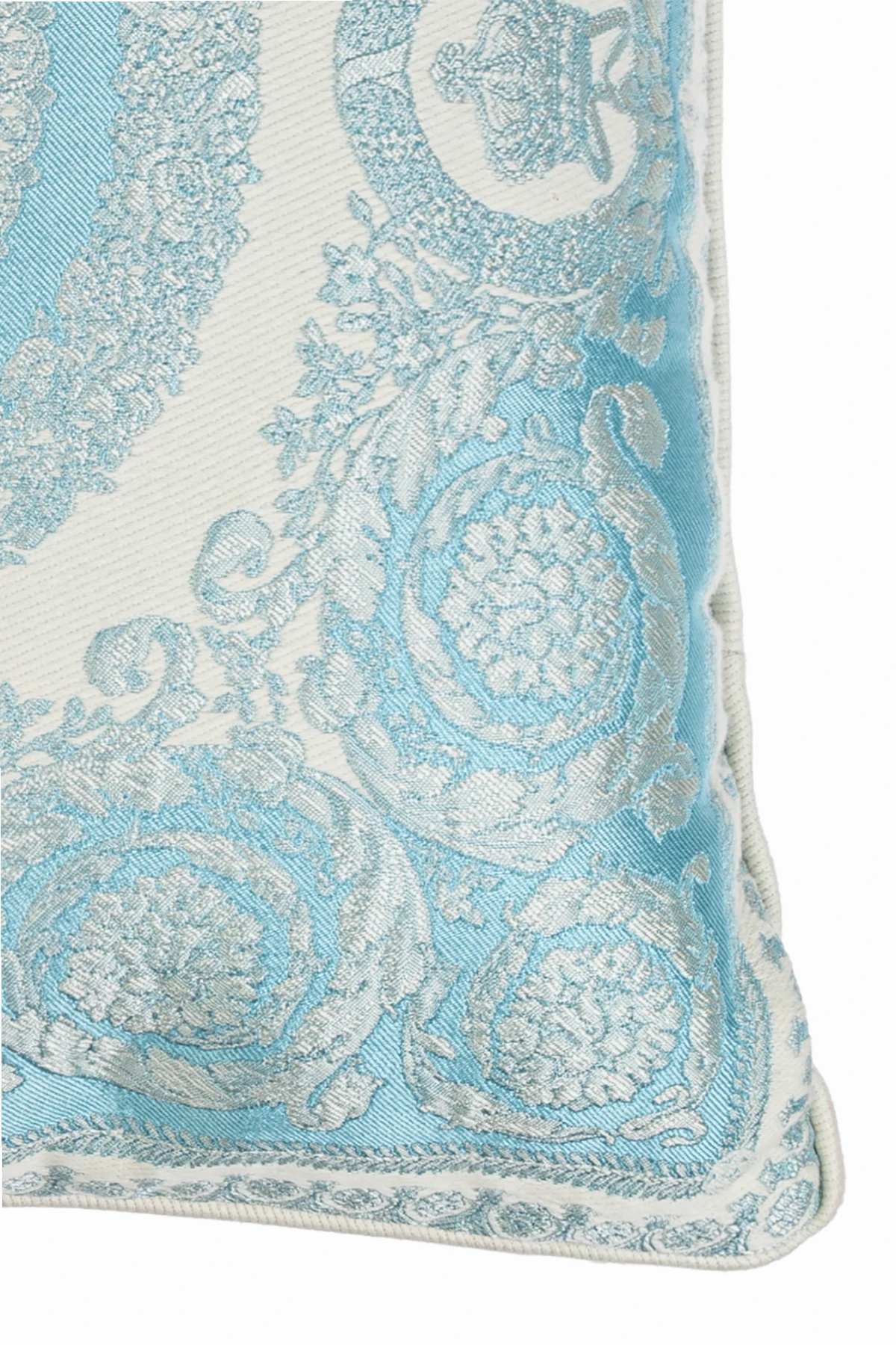 Das Material, aus dem das Kissen gefertigt ist - eine Mischung aus Seide und Baumwolle , garantiert nicht nur visuelle Attraktivität, sondern auch unvergleichliche Weichheit und Komfort bei der Benutzung. Der Reichtum des dekorativen Musters, inspiriert von Rokoko- und Barockstil, gefüllt mit konzentrischen Kreisen, pflanzlichen Ornamenten und floralen Motiven, unterstreicht seinen einzigartigen Charakter. Zusätzliche Eleganz verleiht der dekorative Stich an den Kanten sowie der praktische Reißverschluss, der das Halten des Kissens in perfekter Sauberkeit erleichtert.