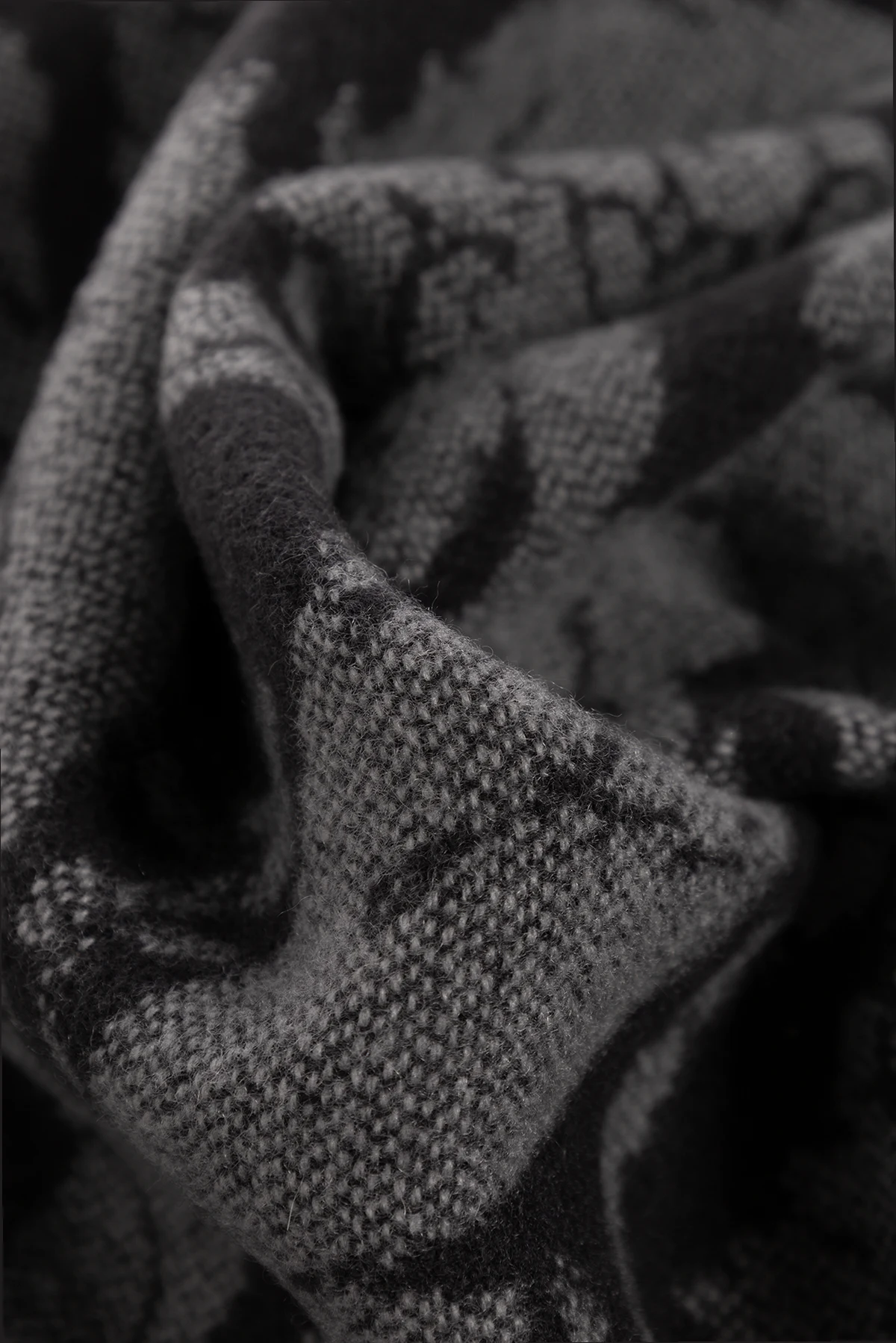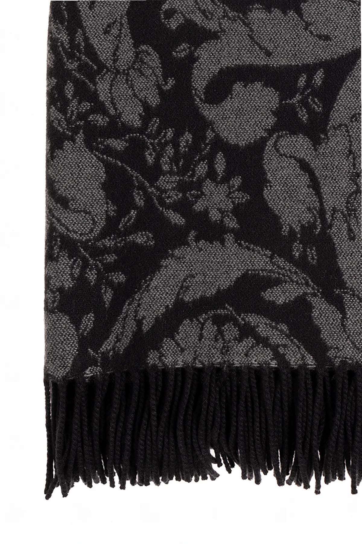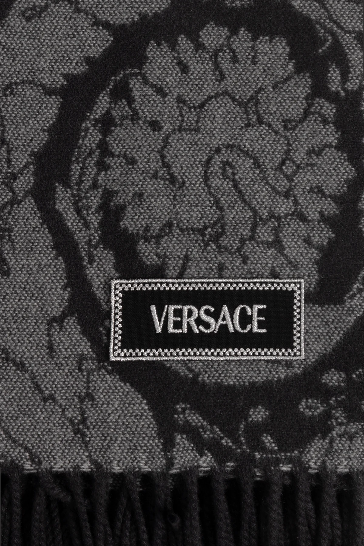 Black and grey blanket from Versace Home. Made of cashmere, this item is embellished with a Barocco pattern and logo patch and features fringed edges.