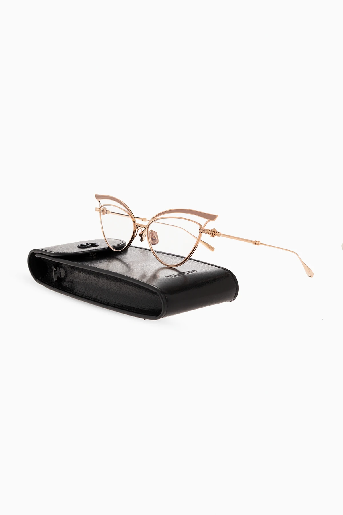 Rose gold-tone optical glasses from Valentino Eyewear. This cat-eye pair features side inserts with a logo and clear lenses. Case included.