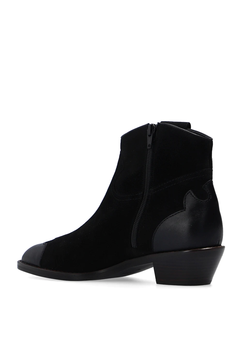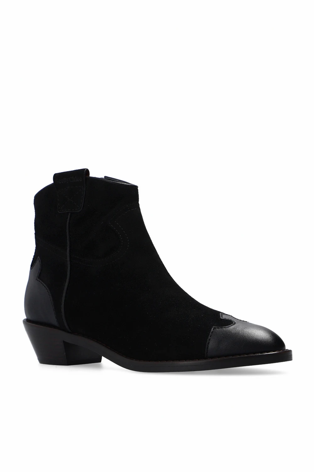 Black heeled ankle boots from See By Chloé. Made of suede, this pair sits on a black rubber sole and showcases exposed stitching details and an embossed logo.