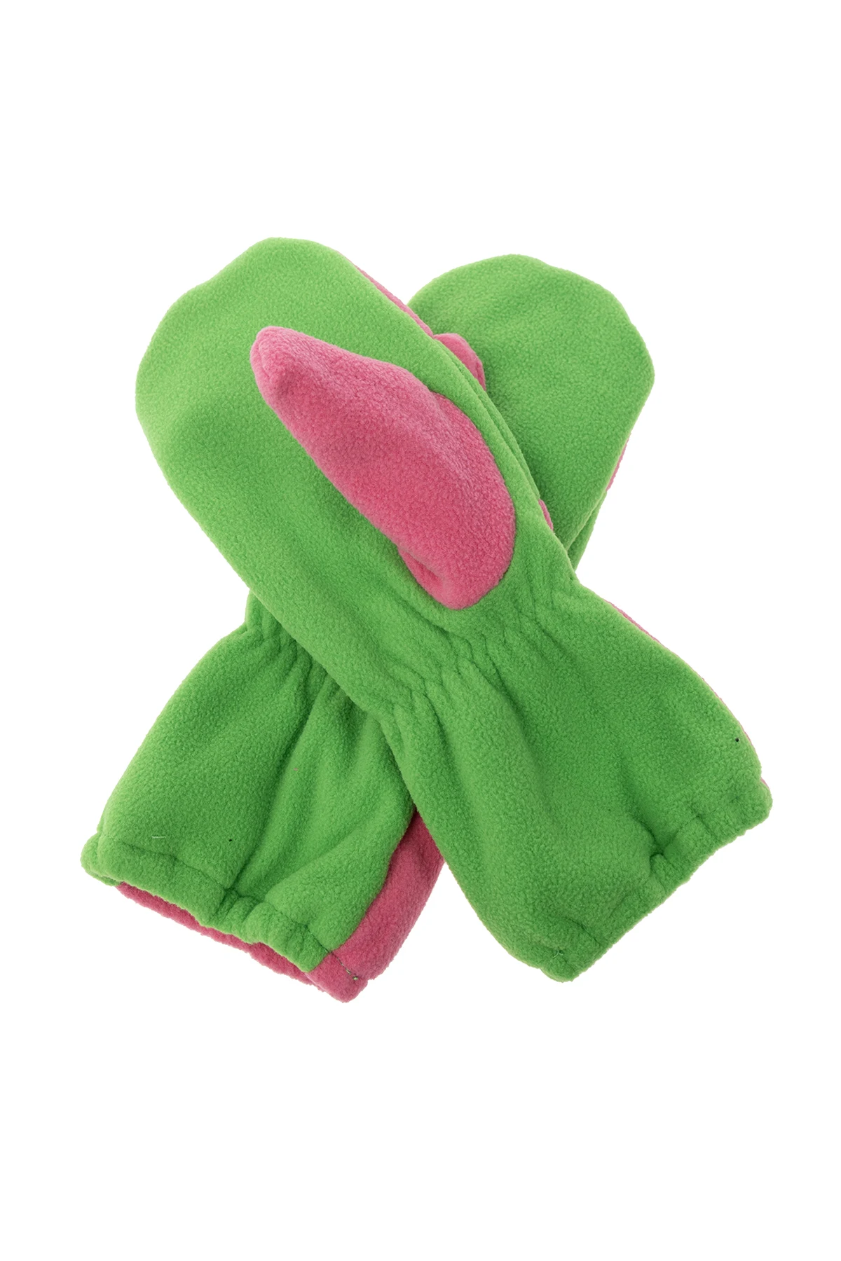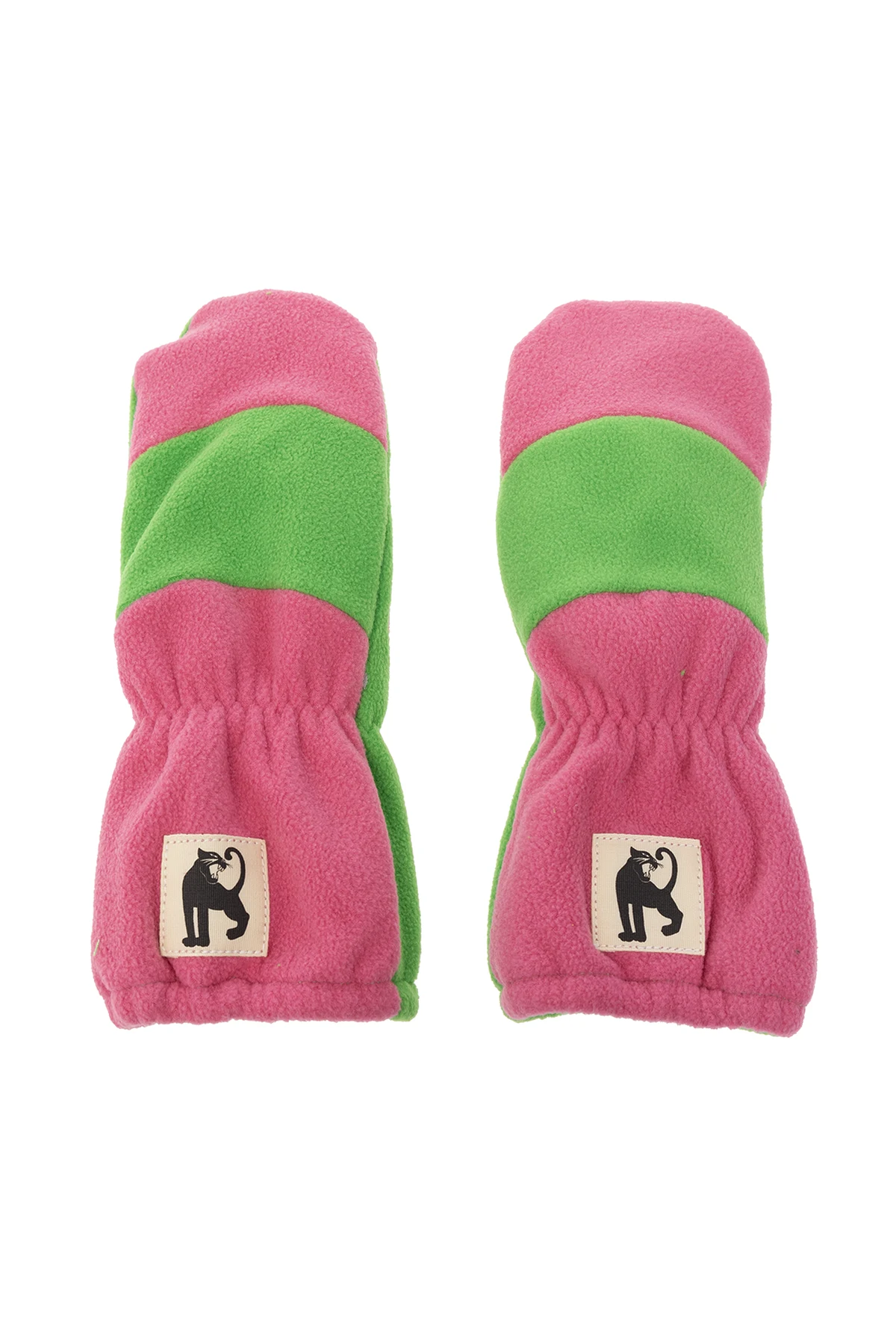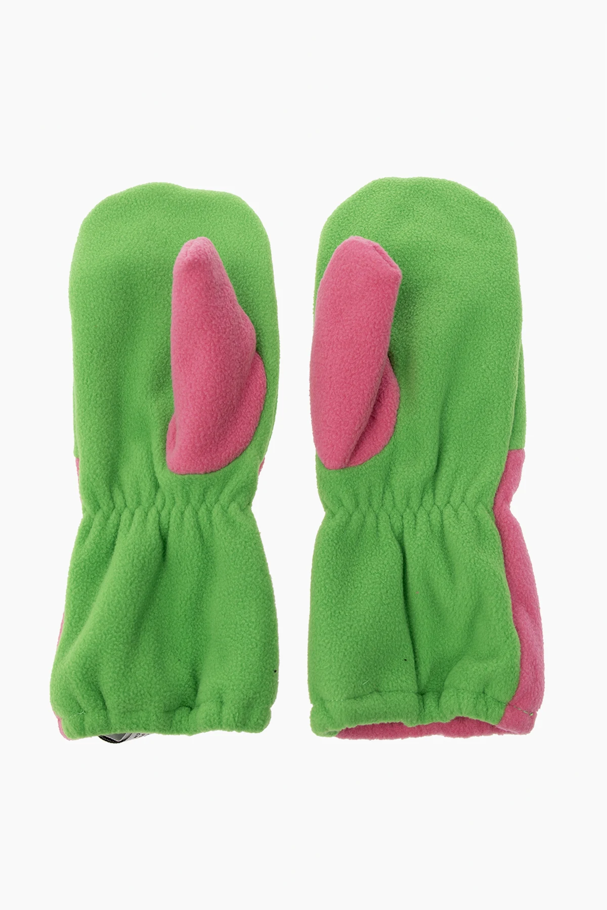 Pink and green gloves from Mini Rodini. Crafted from recycled fleece, this pair features a logo patch and ribbed cuffs.