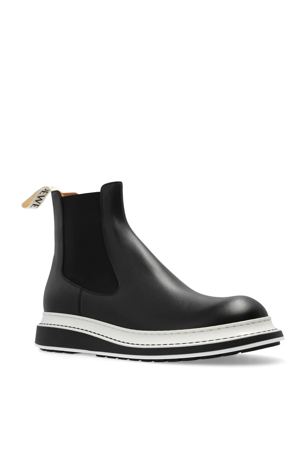 Black ankle boots from Loewe. Crafted from leather, this model sits on a white and black rubber sole and features a slip-on silhouette and a cream grosgrain pull tab printed with a black logo at the back.