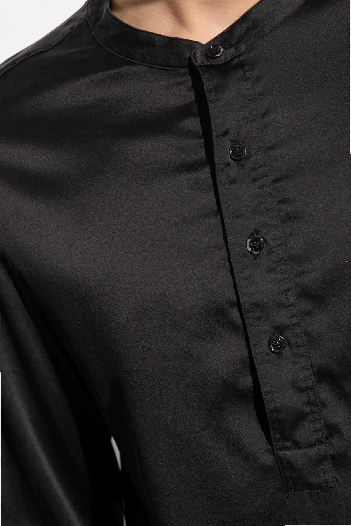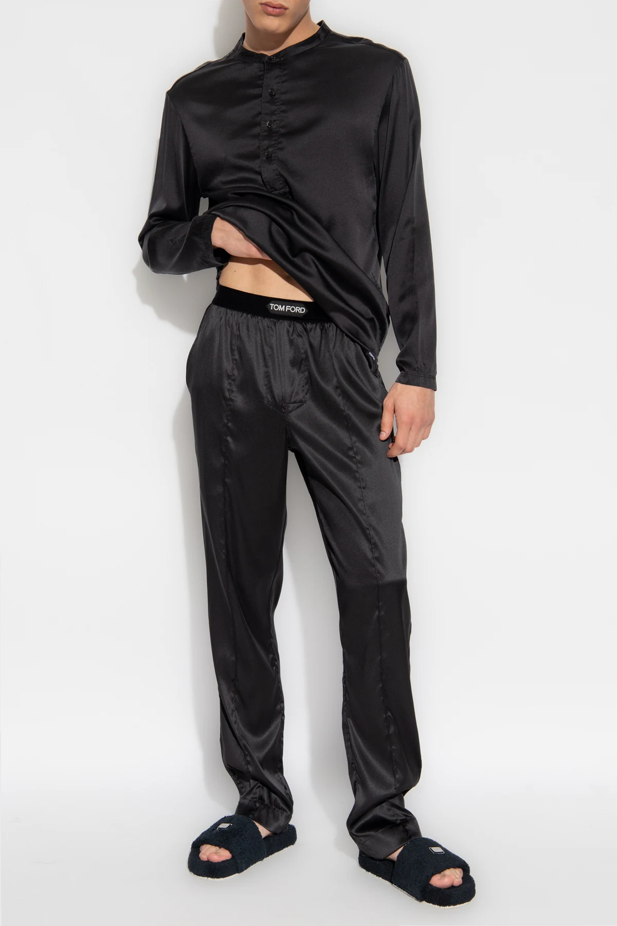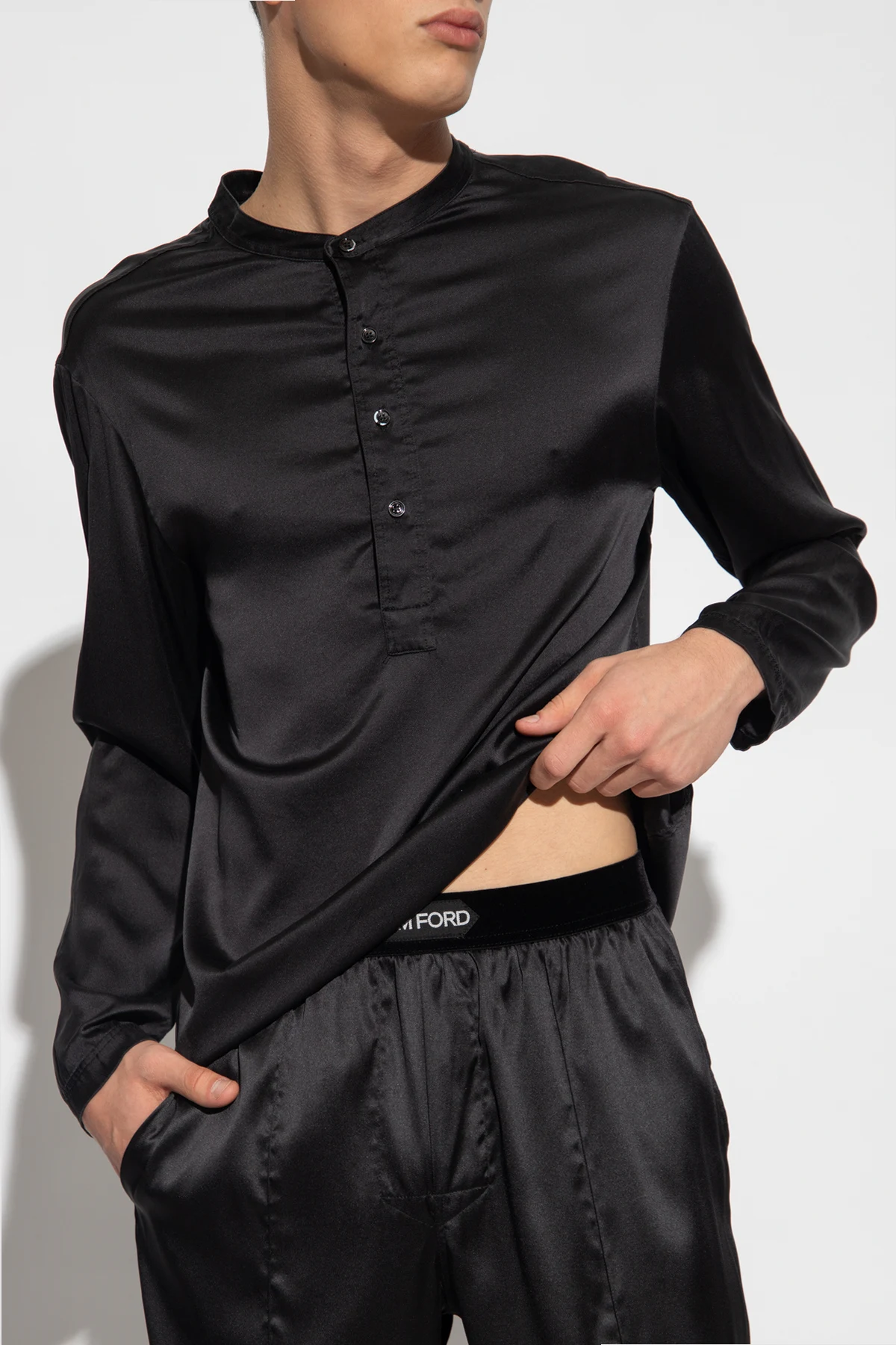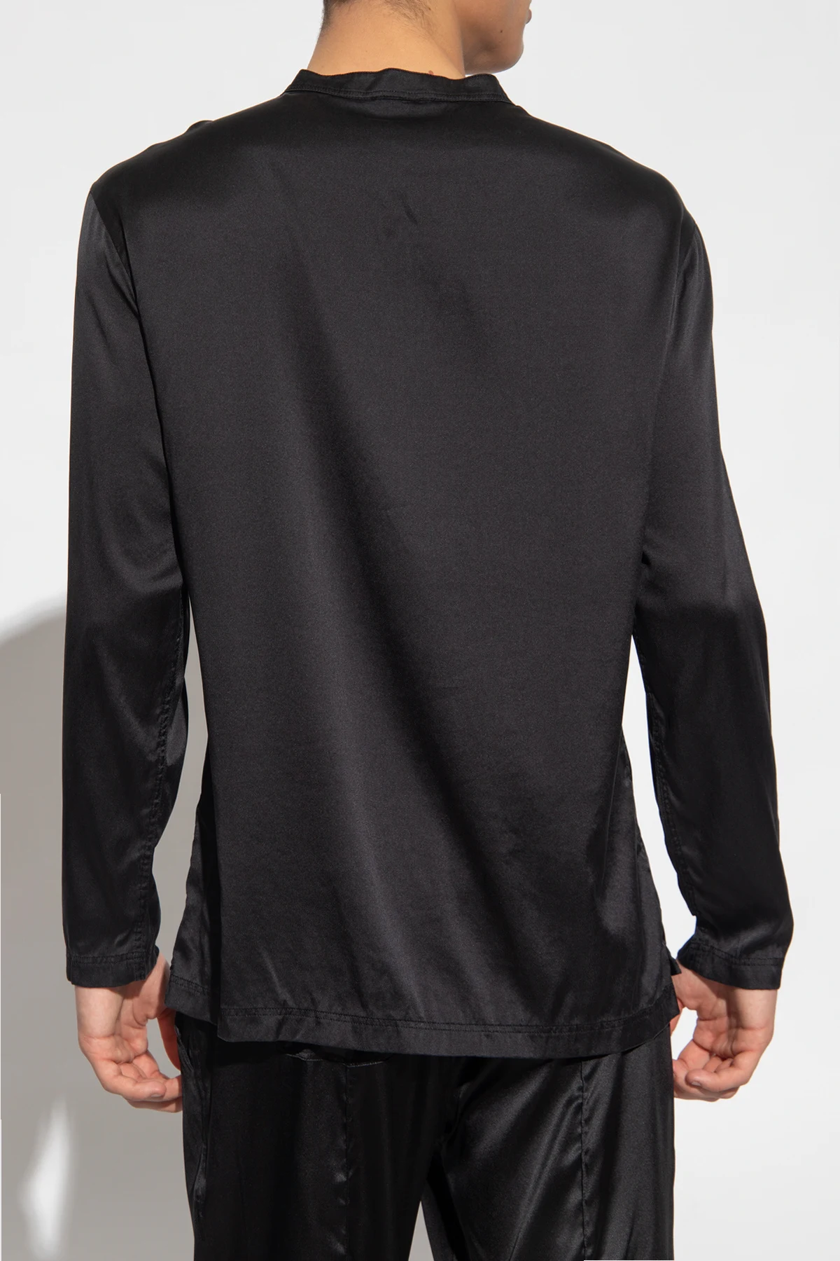 Black pyjama top from Tom Ford. Made of silk, this style features a round neck, long sleeves, button fastenings and a logo patch on the bottom.