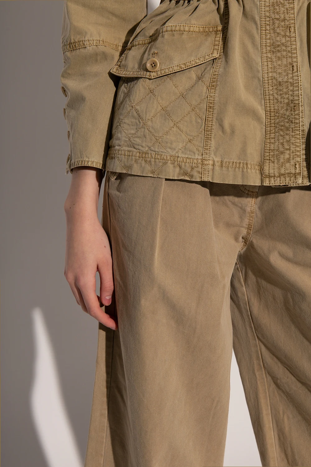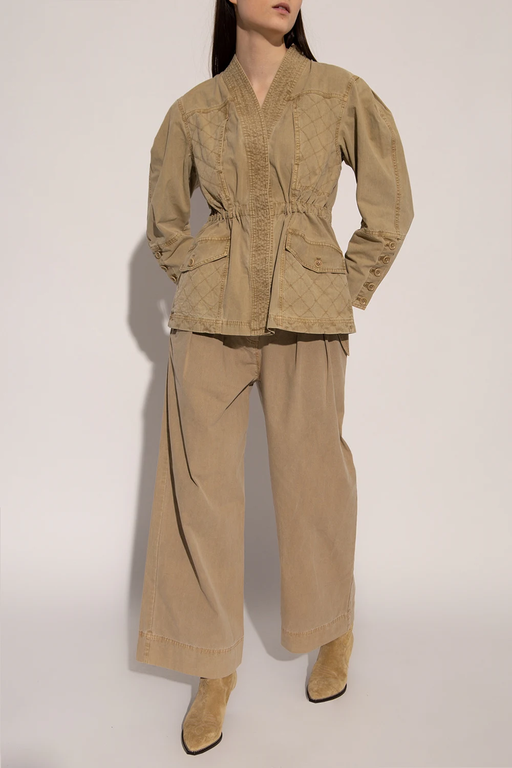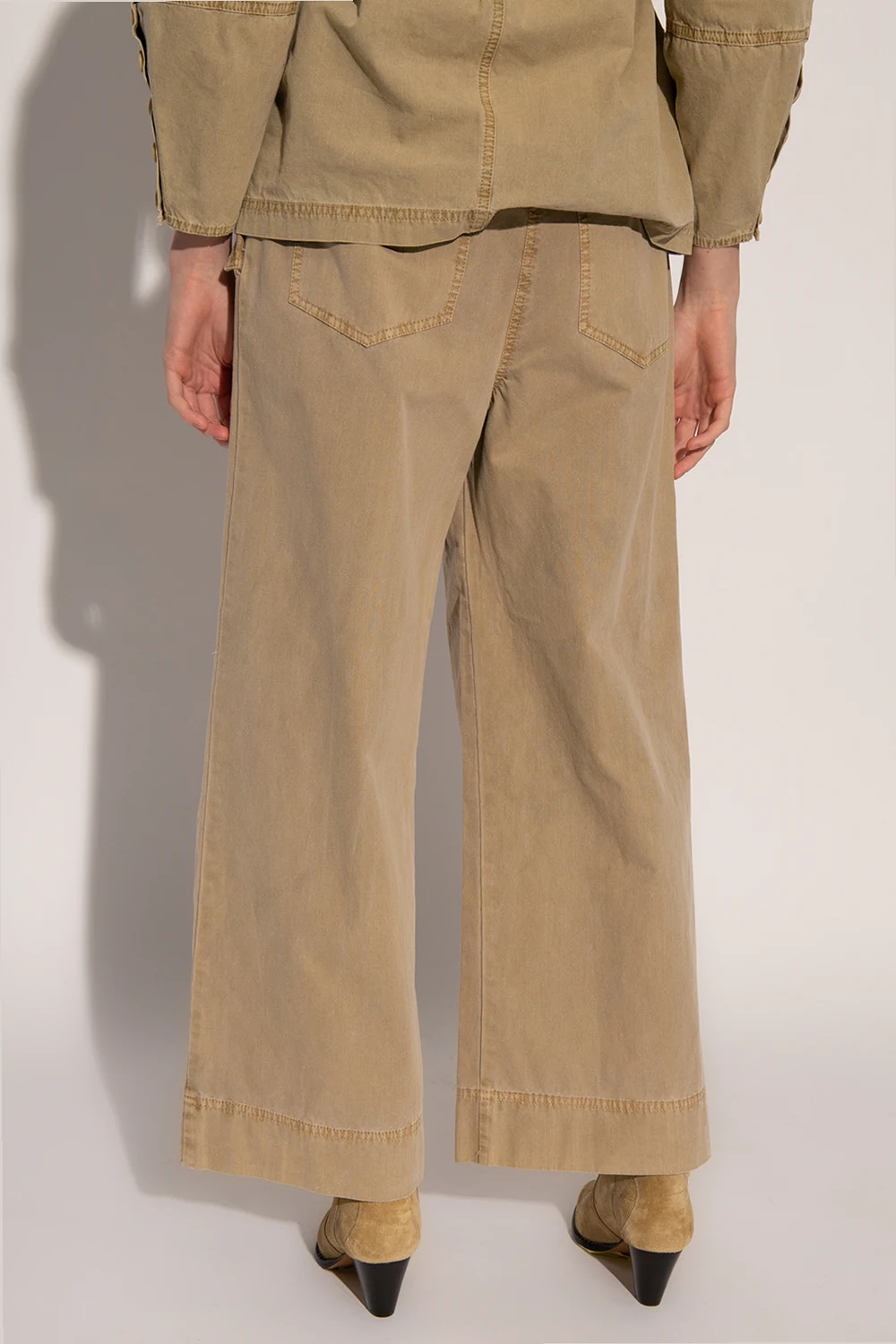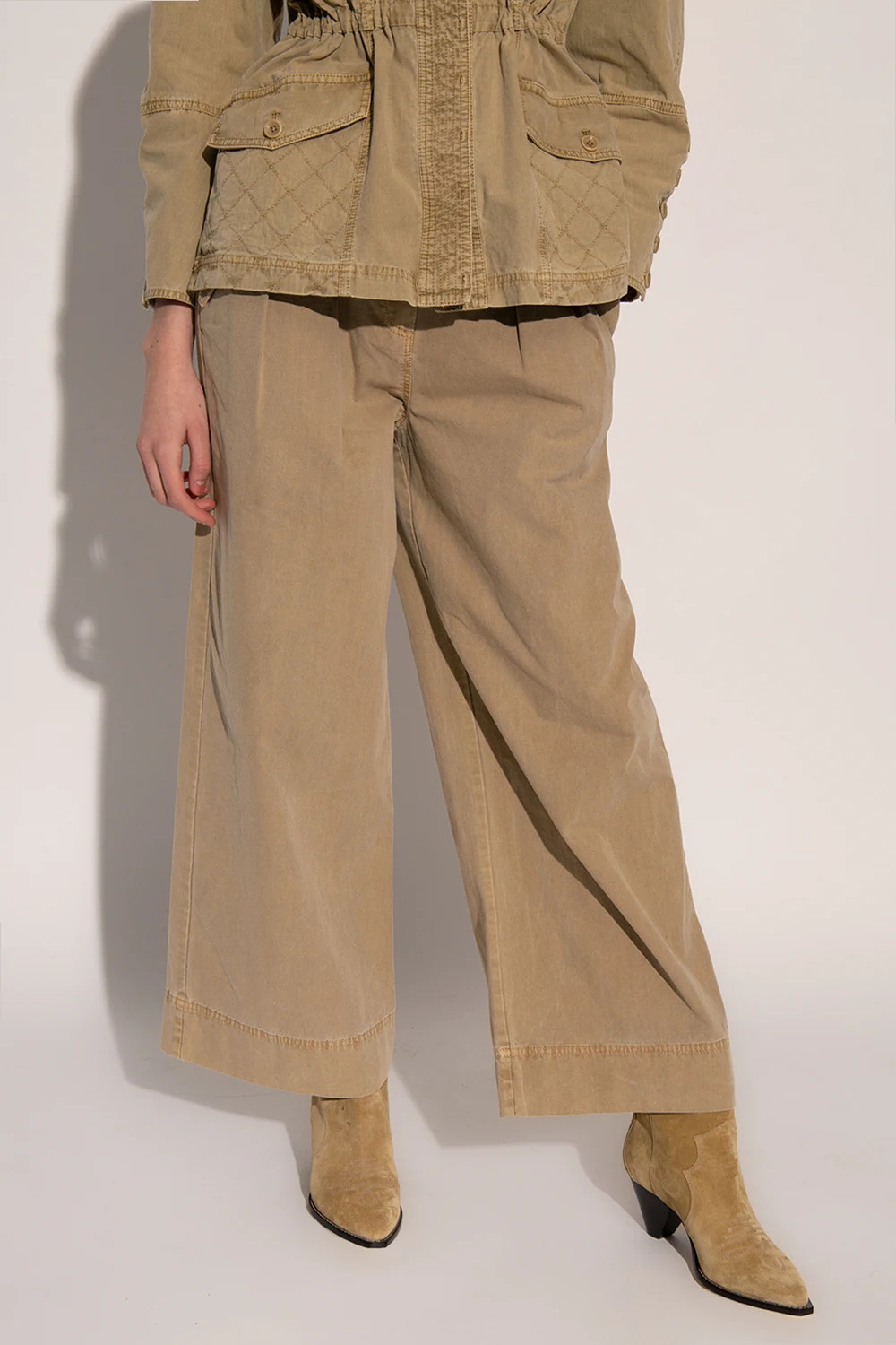 Beige 'Cedar' trousers from Ulla Johnosn. Made of cotton. Fastened with a zipper and a button. Decorative pleats on the front. Four slip pockets, two with a decorative flap fastened with a button. Wide legs with a straight cut.