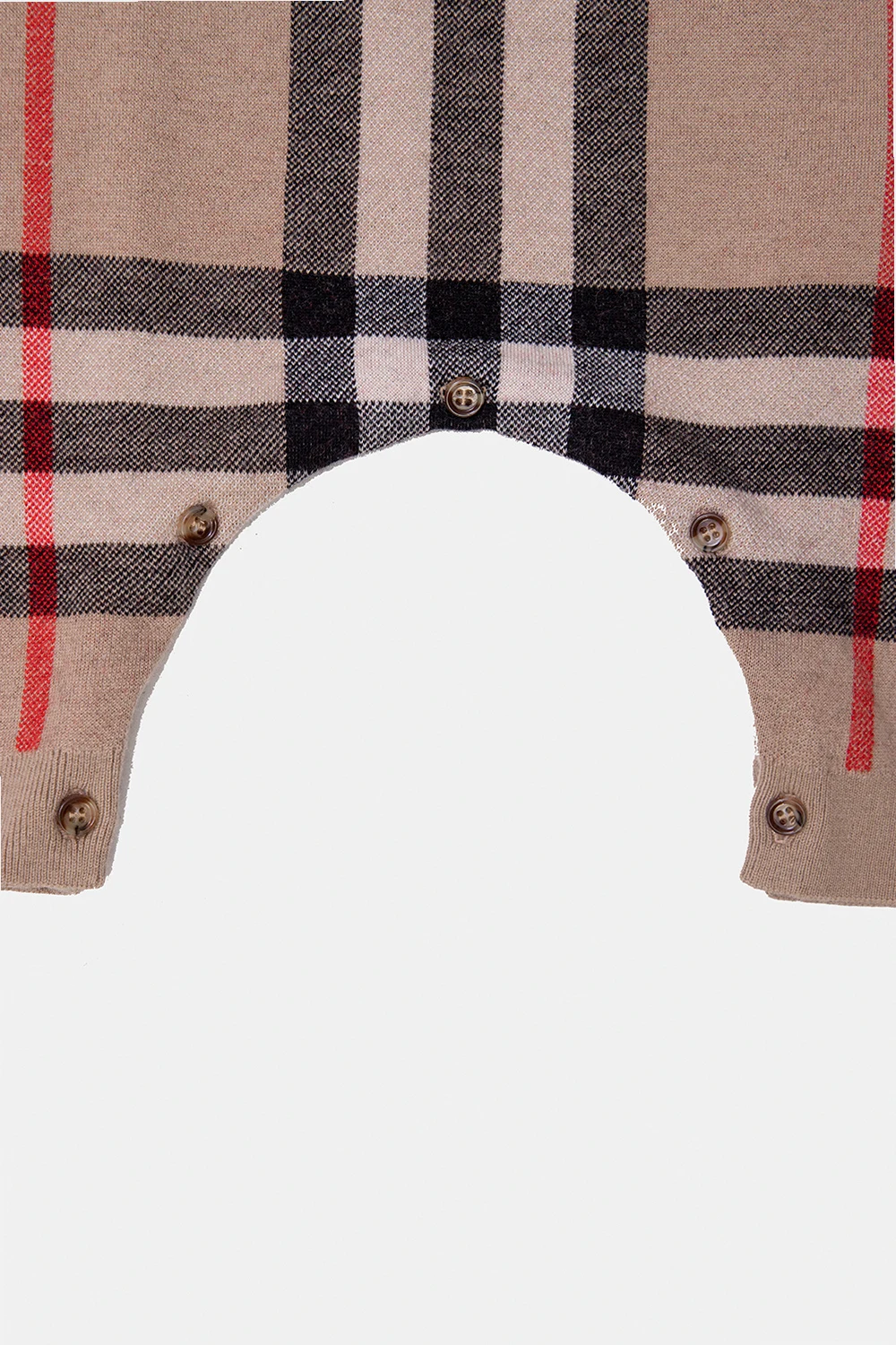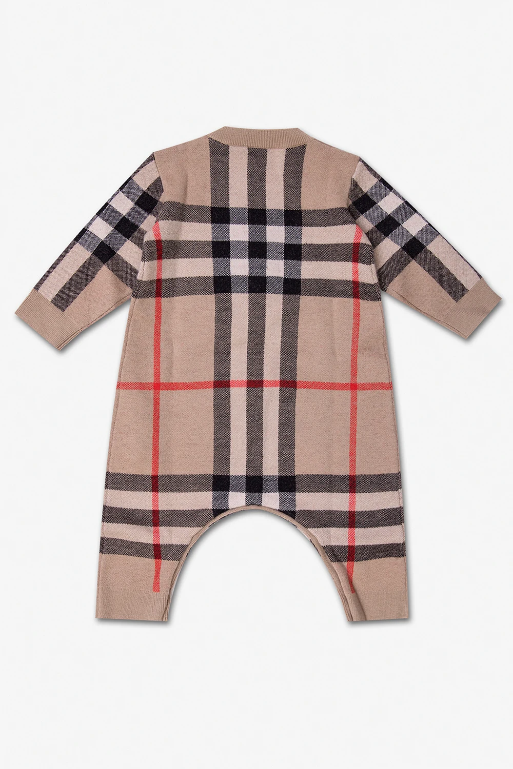 Beige baby jumpsuit from Burberry Kids. Crafted from a wool and cashmere blend, this design features button fastenings, multicolored check pattern and long sleeves.