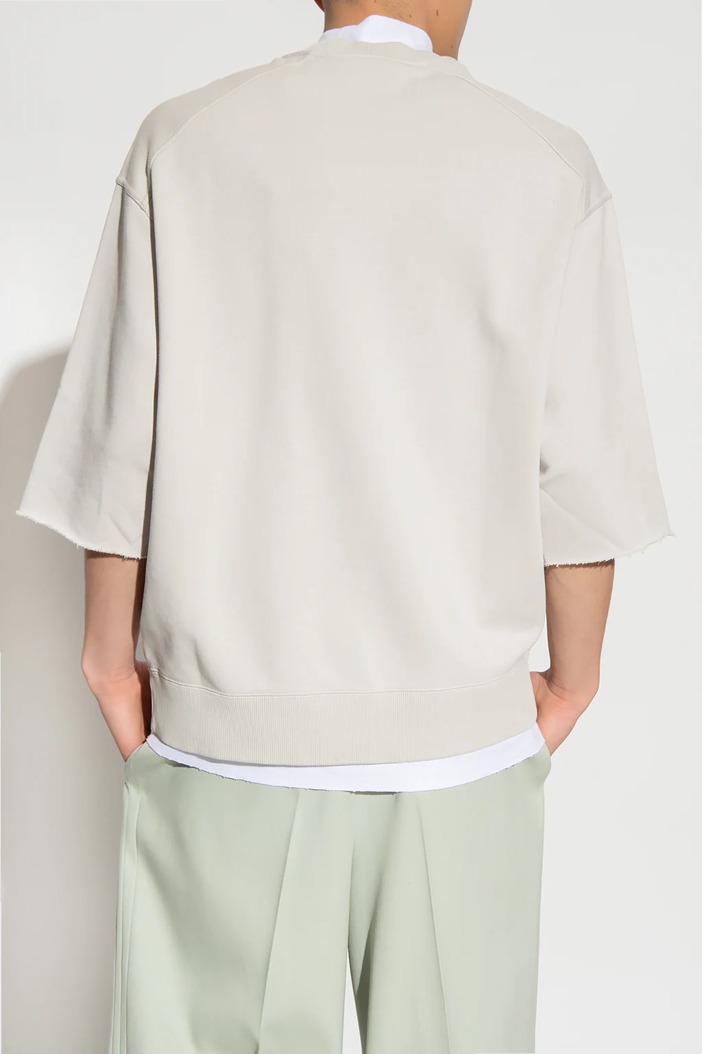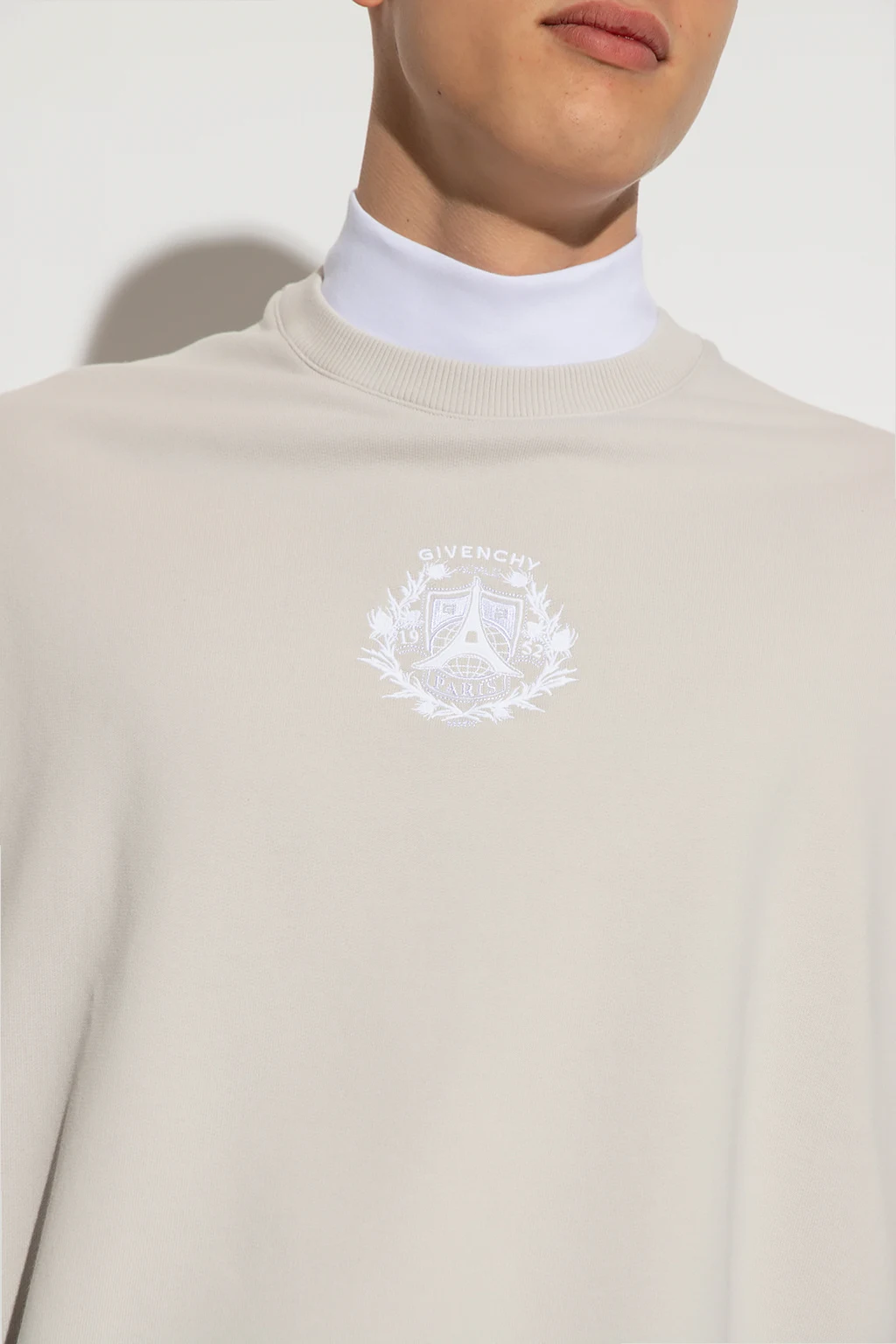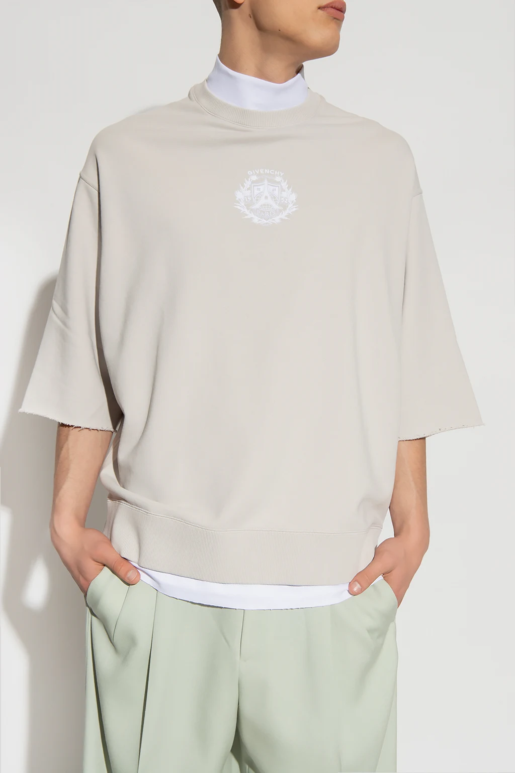 Light grey and white two-layer sweatshirt from Givenchy. Made of cotton with an oversize fit, this style features an embroidered logo pattern, an elasticized standing collar, short sleeves with raw edges and a double-trimmed hem.
