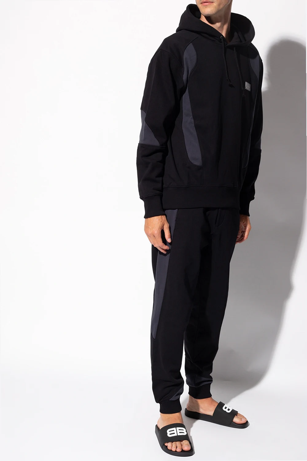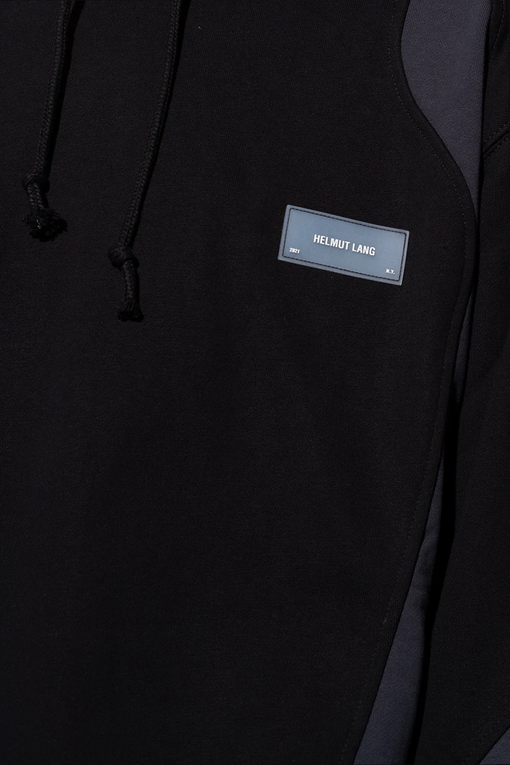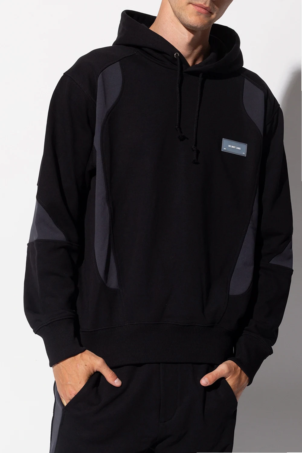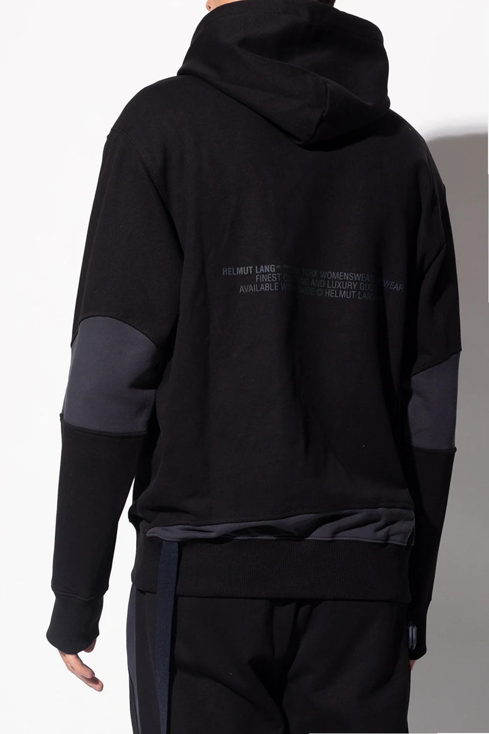 Black and grey sweatshirt with a drawcord-adjustable hood from Helmut Lang. Crafted from cotton jersey, this hoodie showcases a logo appliqué on the front and rib detailing on the bottom hem and cuffs.
