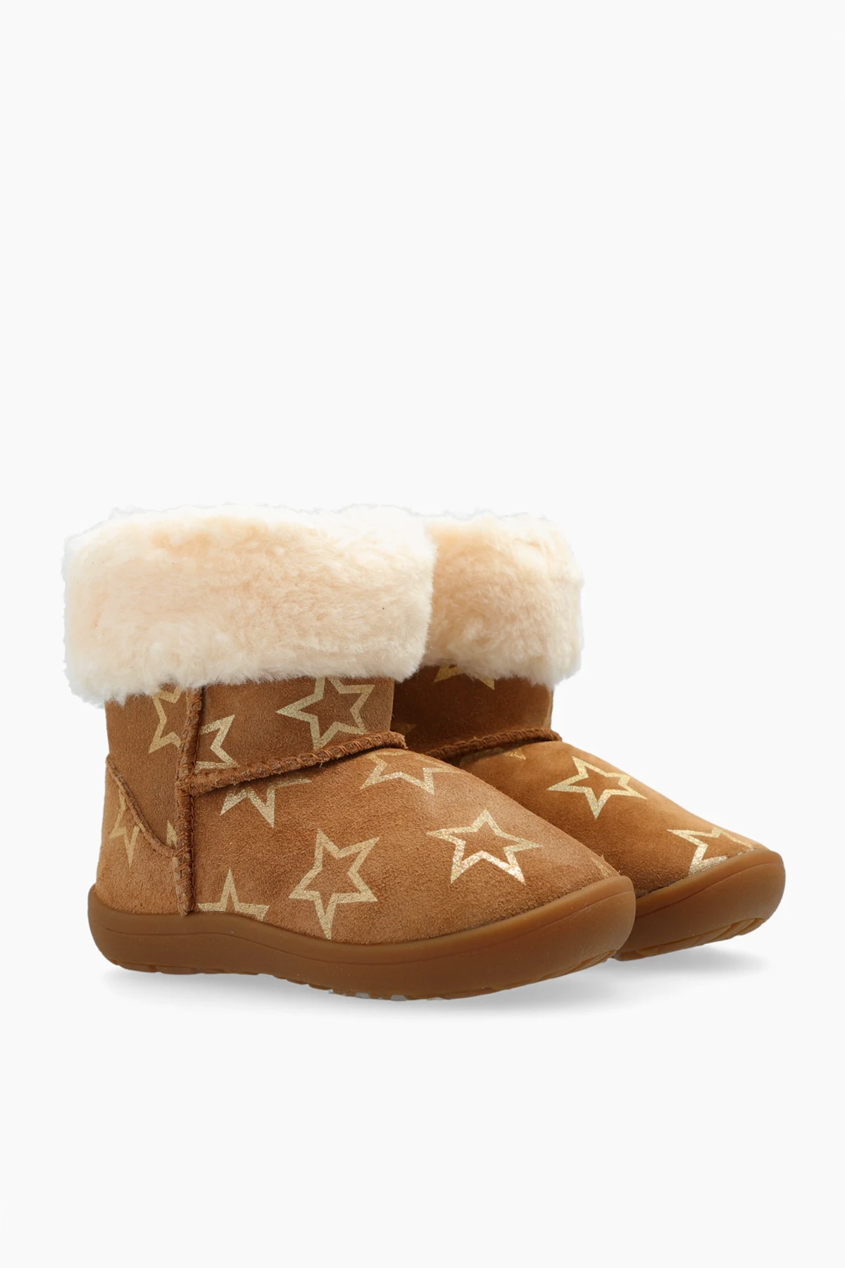 Das Obermaterial der Schuhe besteht aus braunem, wildlederähnlichem Material, das ihnen ein elegantes Aussehen verleiht. Das Innere ist mit weichem, flauschigem Fell in Cremefarbe gefüttert, das Wärme und Komfort auch an den kältesten Tagen bietet.