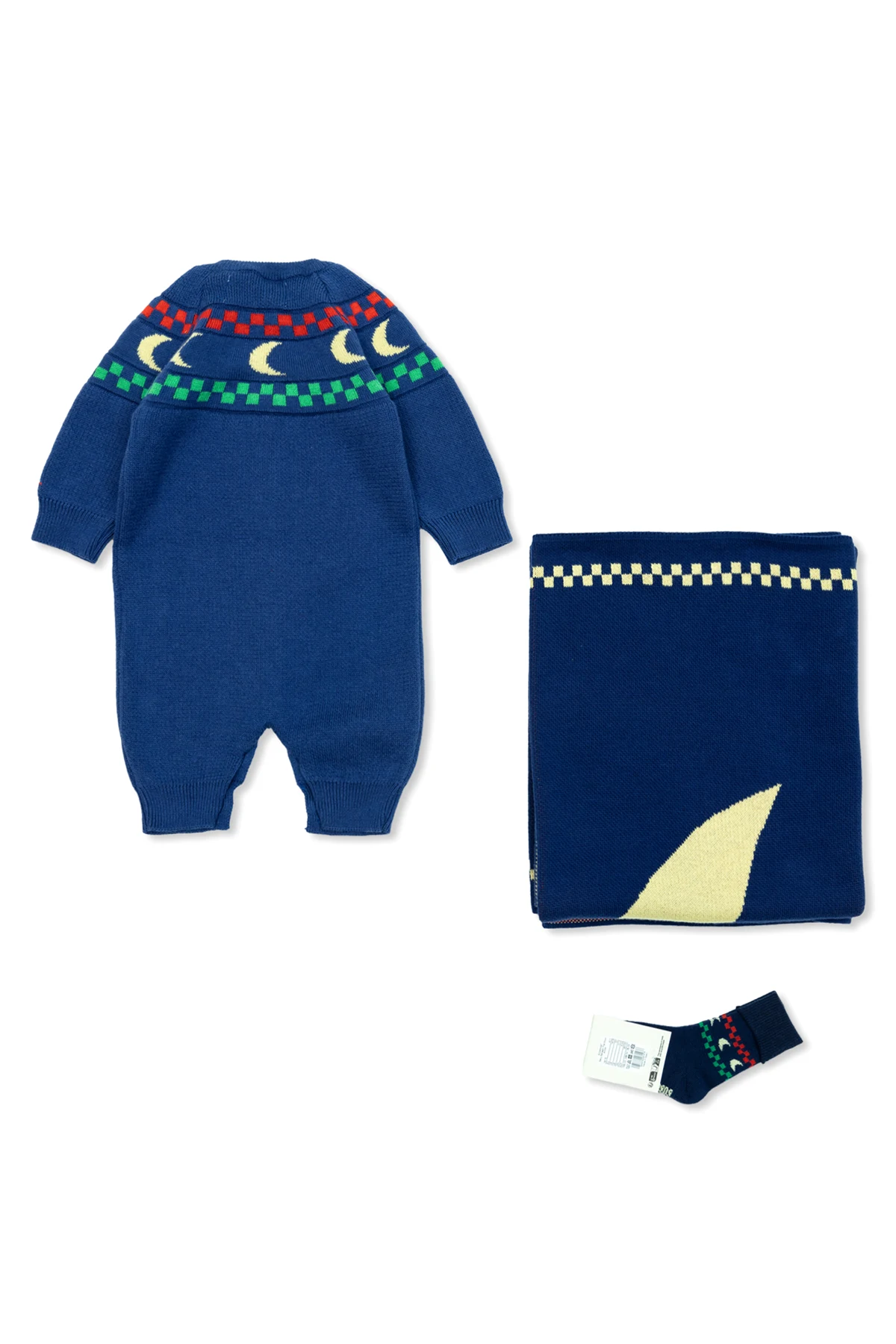 Wir präsentieren ein exklusives Babykleidungsset der renommierten Marke Bobo Choses . Dieses außergewöhnliche Set besteht aus einer Decke, einem Overall und Socken, die Eleganz, Komfort und einzigartigen Stil vereinen.