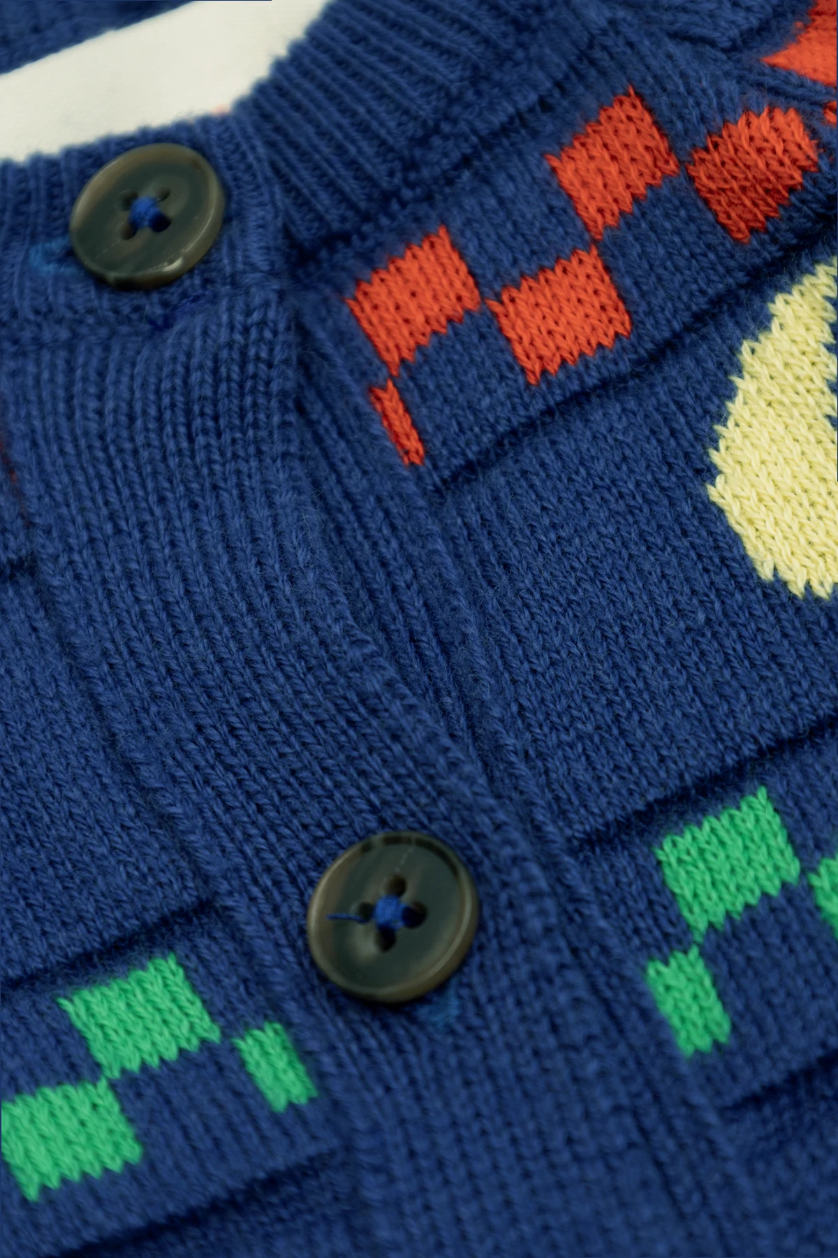 Der Overall in dominierendem Dunkelblau ist aus hochwertigem Strick gefertigt, einer Mischung aus Bio-Baumwolle, Wolle und recycelter Baumwolle. Ein skandinavisches Muster mit grünen, roten, gelben und weißen Elementen verleiht ihm Charme. Die Knopfleiste erleichtert das An- und Ausziehen.