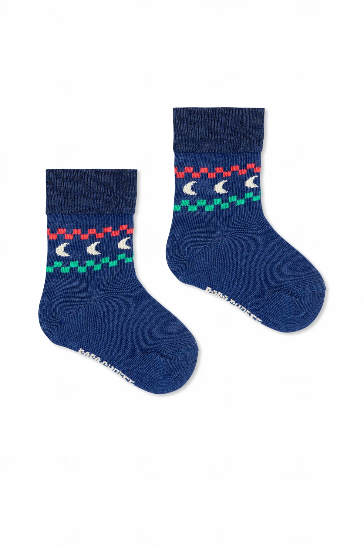 Die Socken in Dunkelblau, mit einem zum Overall passenden Muster, sind aus weichem, elastischem Strick gefertigt und bieten Tragekomfort und Wärme.
