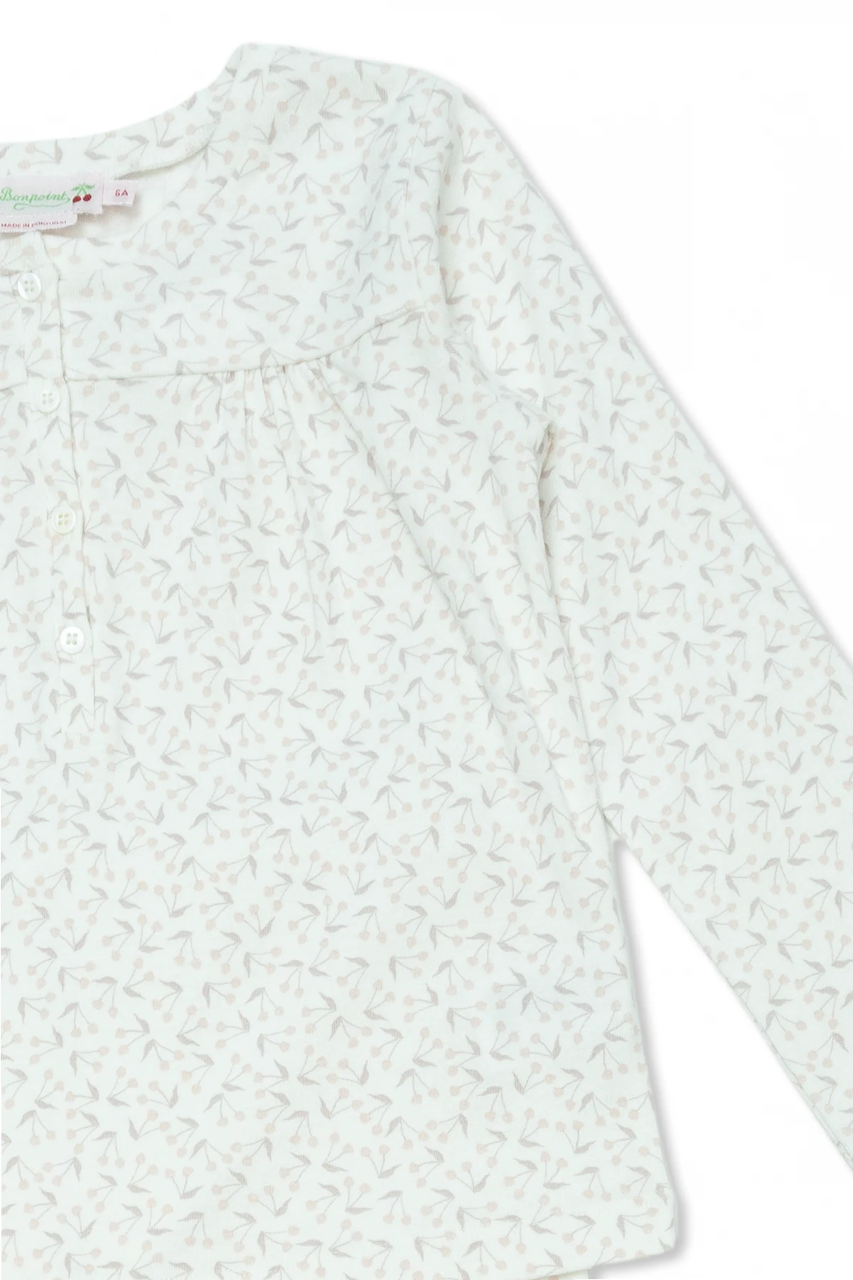 White ‘Bellina’ two-piece pyjama from Bonpoint. Made from cotton, this style showcases a light pink logo pattern. It includes a buttoned top with long sleeves and bottoms featuring an elasticated waistband.