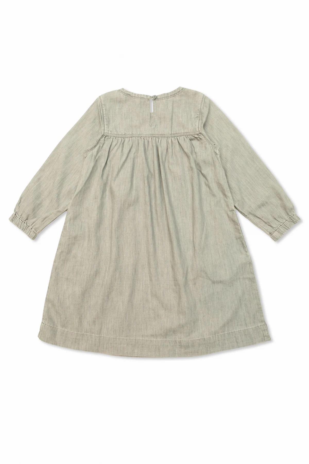 Das angebotene Produkt zeichnet sich durch einen lockeren, lässigen Schnitt und lange Ärmel aus, die mit einem zarten Bündchen enden. Das Oberteil des Kleides ist leicht gerafft, was im Brustbereich dezent Volumen verleiht. Hinten befindet sich ein kleiner Schlitz, der mit einem eleganten, grauen Knopf geschlossen wird.