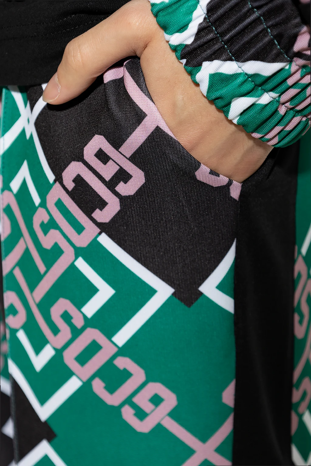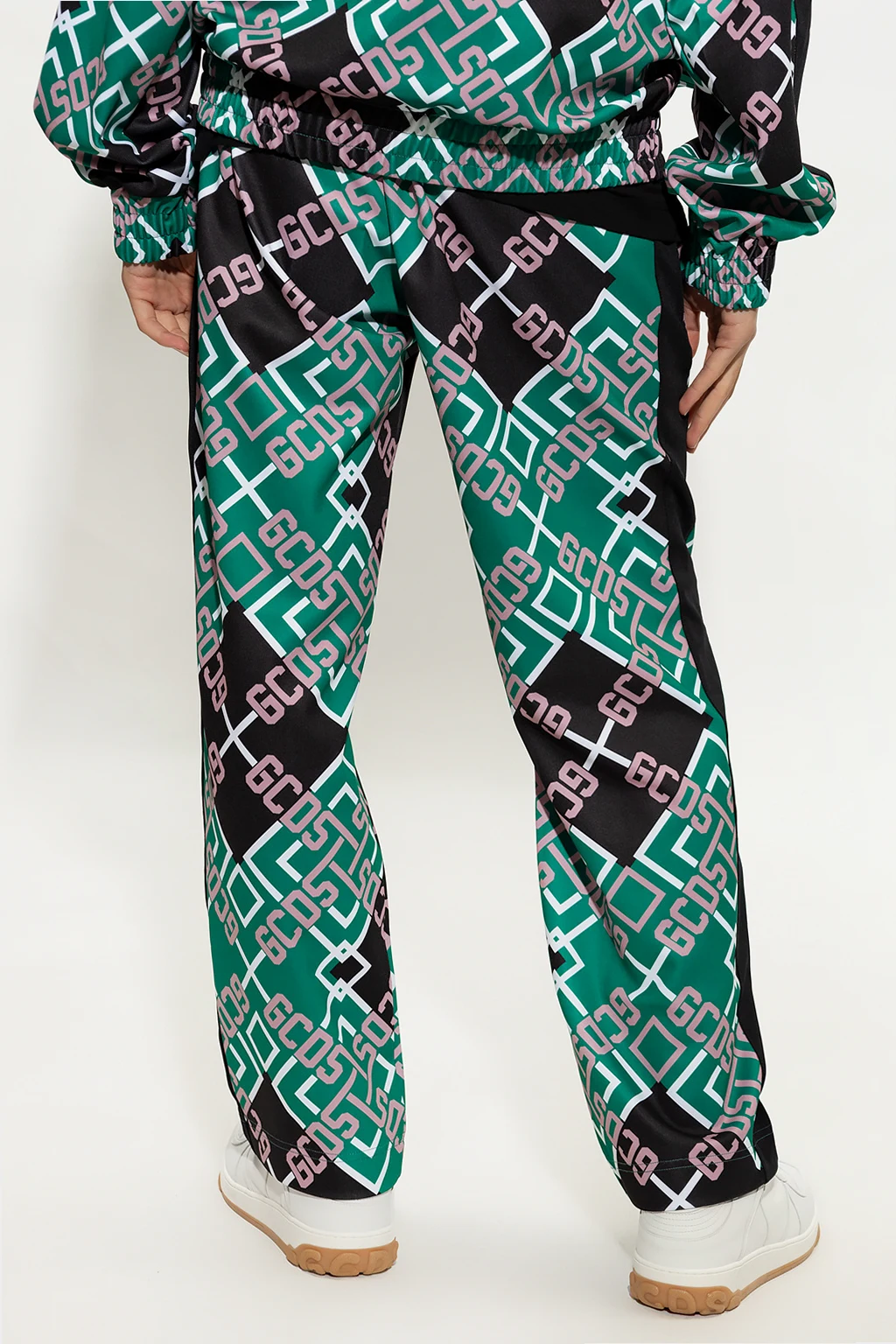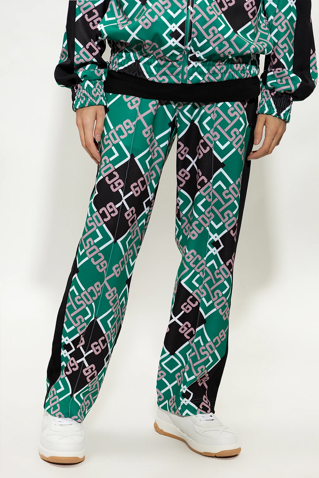 Green and black sweatpants from GCDS. Fastened with drawstrings, this pair features an elastic waistband, pink monogram pattern, white geometric pattern, three slip pockets and straight legs.