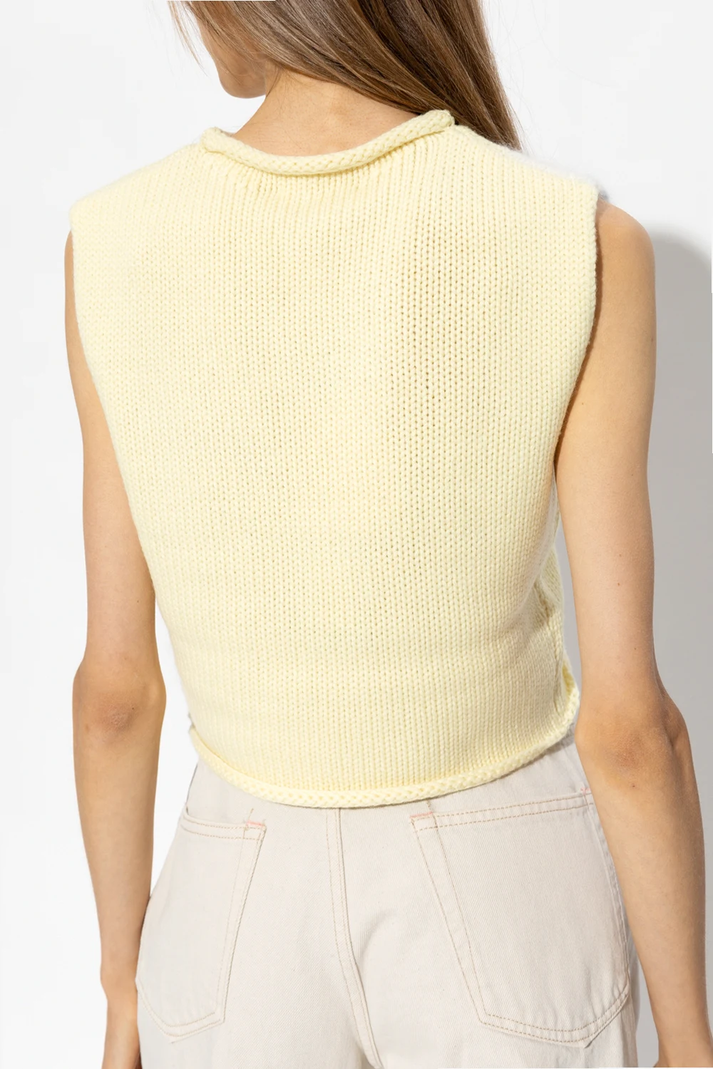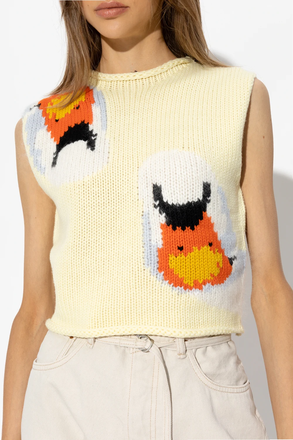Yellow ‘Graphic’ vest from JW Anderson. Embellished with an animal motif, this style features raw trims.