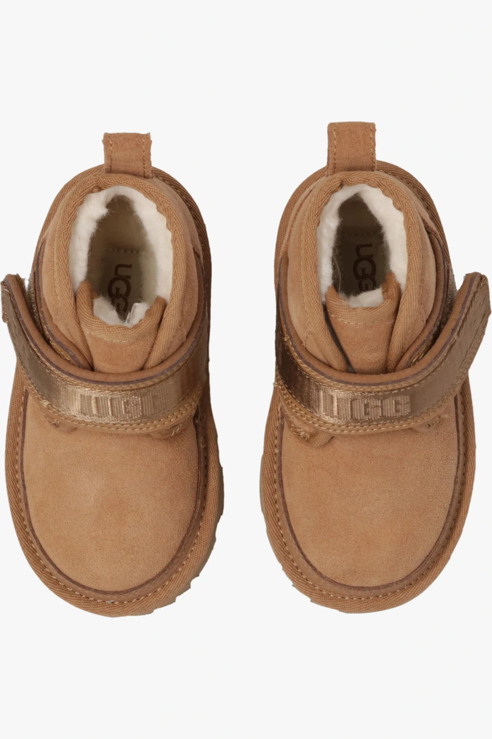 Brown ‘Neumel’ ankle boots from UGG Kids. Crafted from suede, this model is lined with UGGplush™ - a blend of wool and recycled material, and features a branded velcro fastener and a brown Treadlite by UGG™ sole.