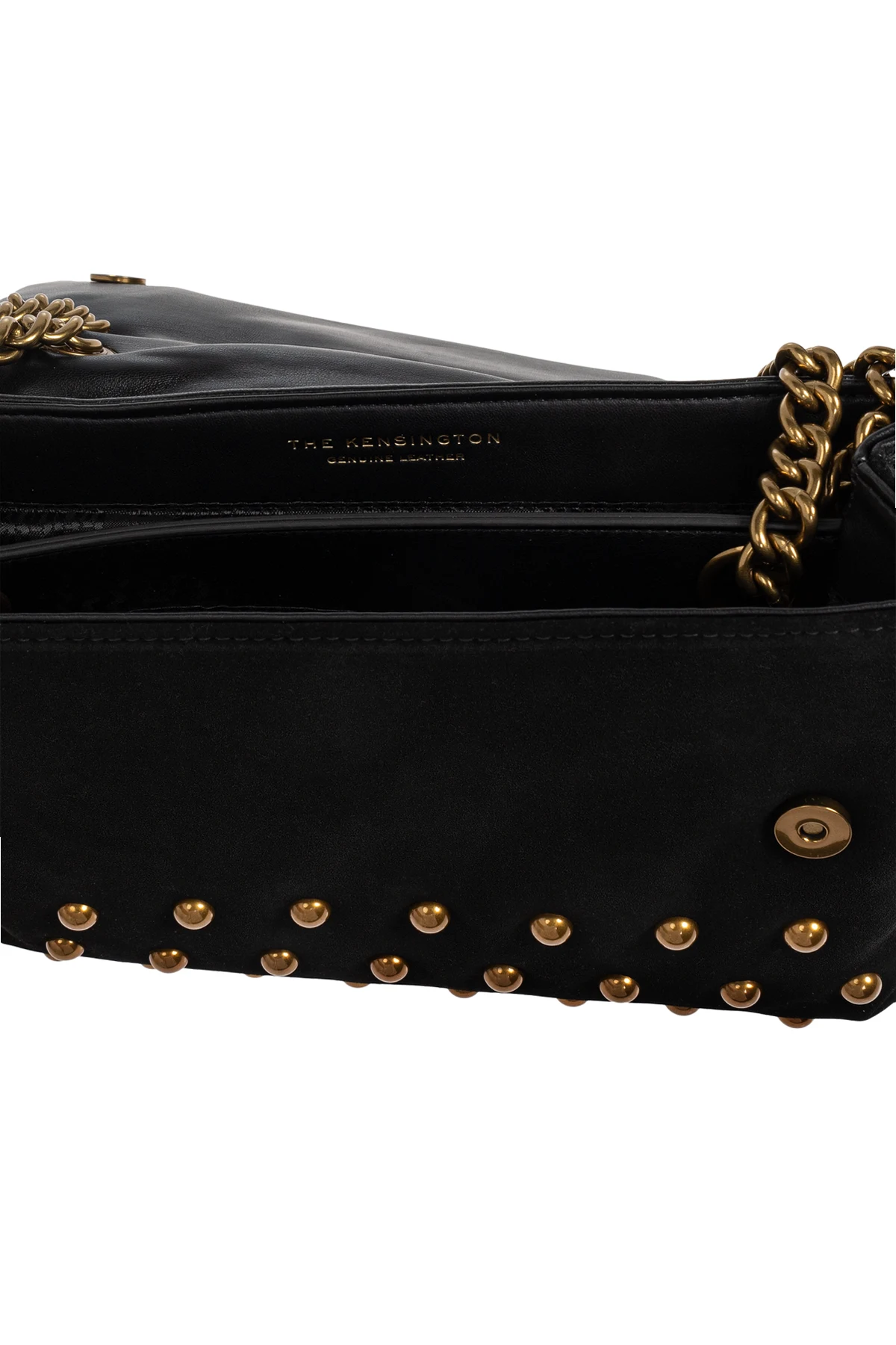 Die Vorderseite zieren gleichmäßig platzierte runde goldene Nieten , die einen perfekten Kontrast zum Schwarz bilden und den einzigartigen Charakter des Designs unterstreichen. Der schwere goldene Kettenhenkel ermöglicht es, die Tasche komfortabel über der Schulter zu tragen oder als schmückendes Accessoire zu präsentieren. Der auffällige Verschluss in Form eines Tierkopfes ist ein originelles Detail, das die Marke unverwechselbar macht.