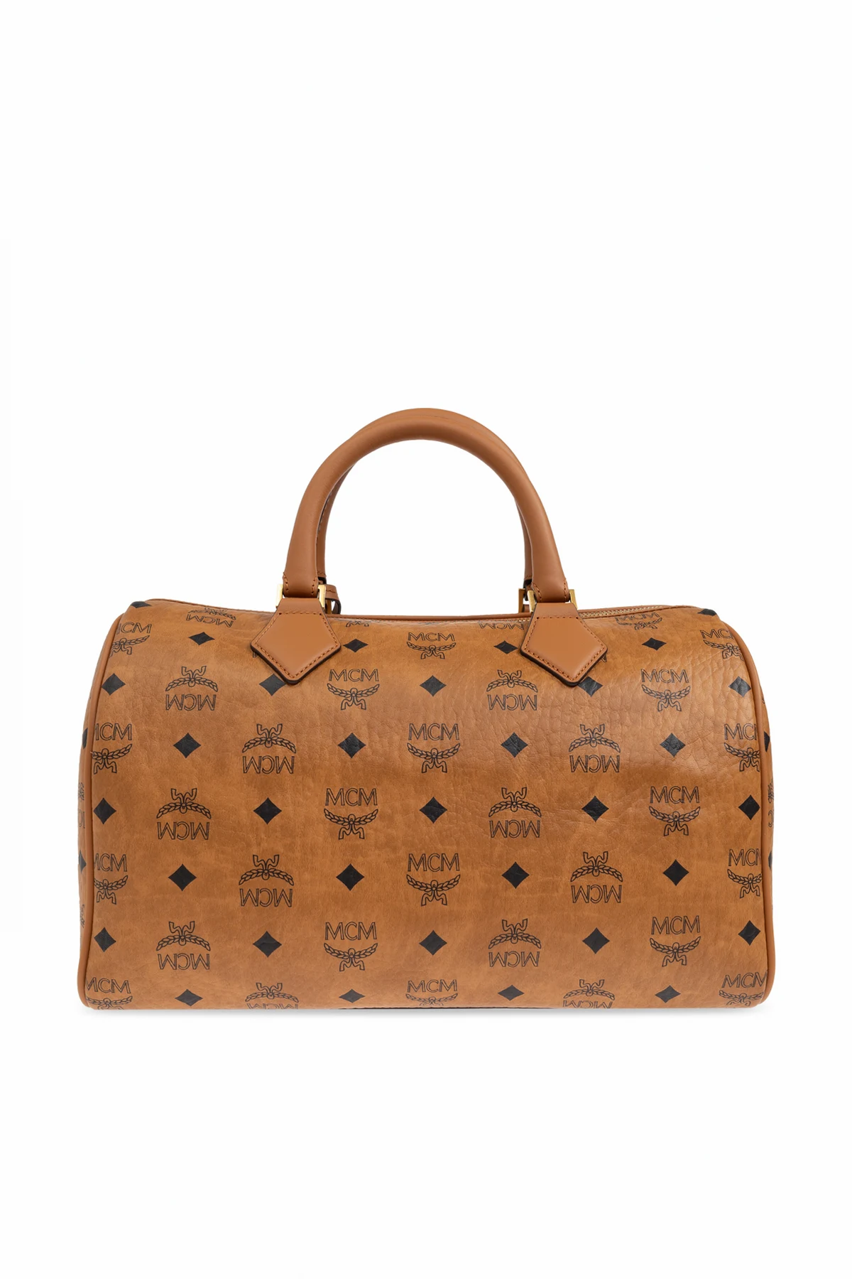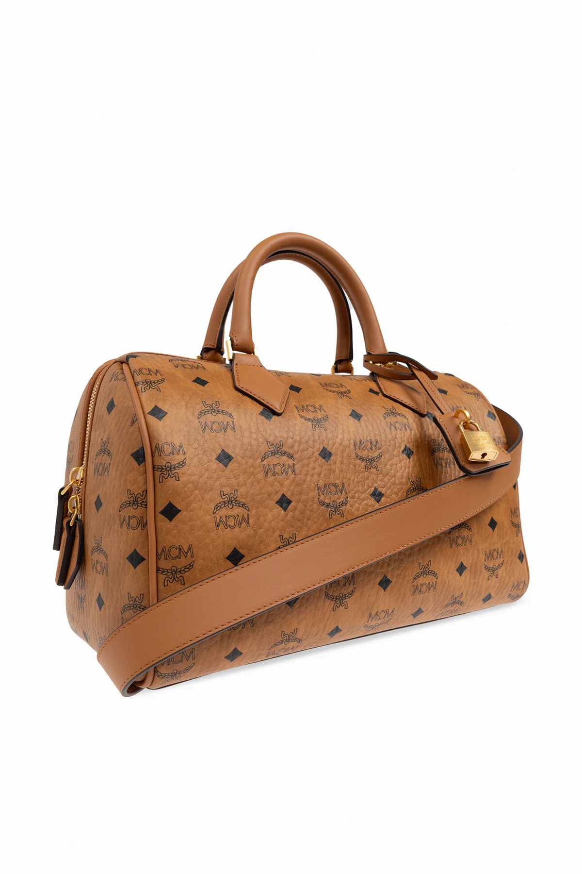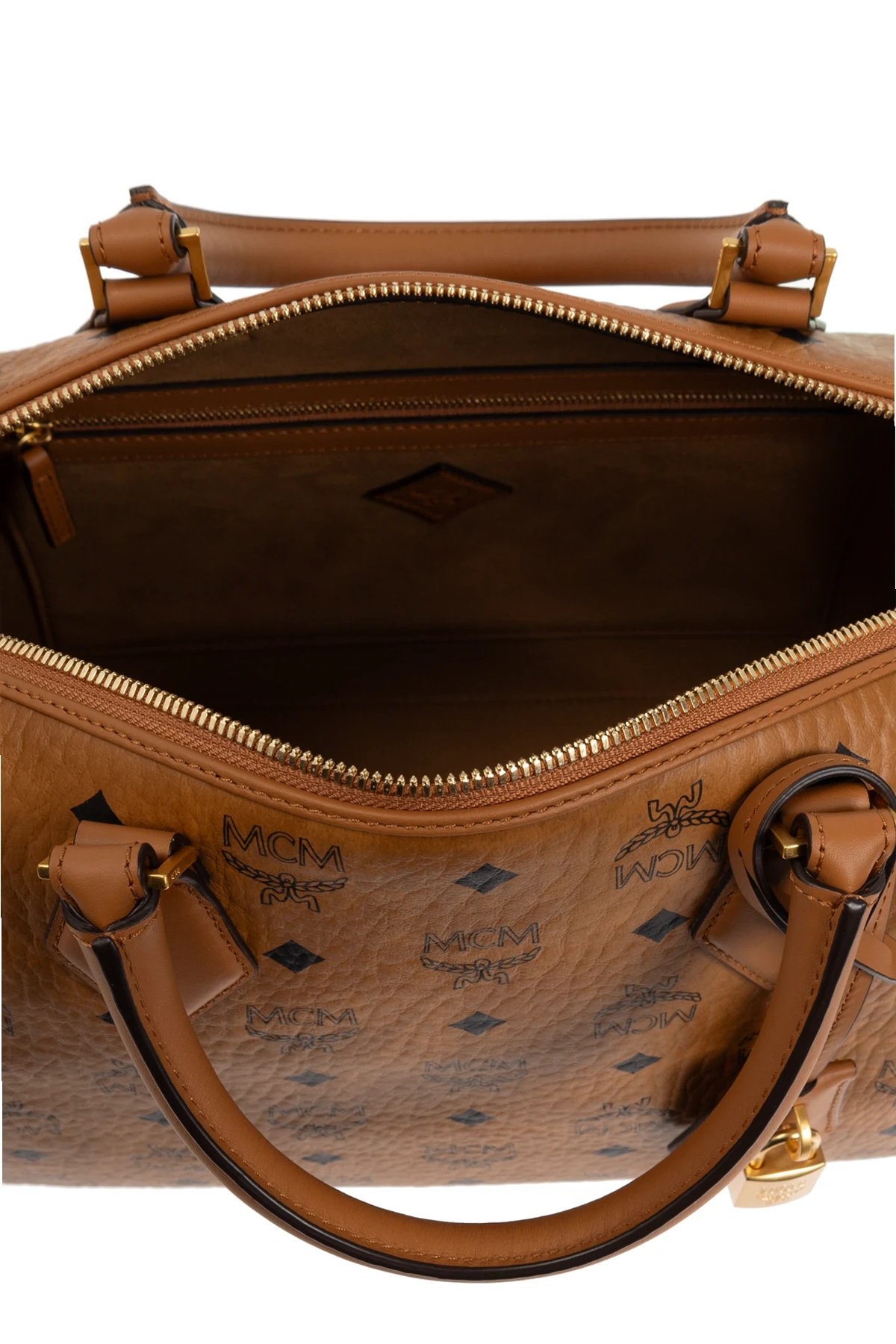 Die Tasche besticht durch ihre klassische, abgerundete Form im Stil einer "Boston Bag". Sie ist aus hochwertigem braunem Leder und Canvas gefertigt und mit dem charakteristischen Monogramm der Marke MCM sowie Rautenmuster verziert. Goldene Details wie ein Reißverschluss und ein dekoratives Schloss verleihen ihr einen außergewöhnlichen Charme.