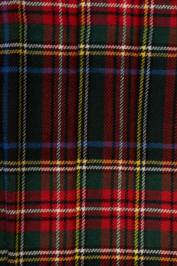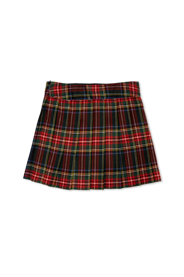 Der Rock zeichnet sich durch einen klassischen, einfachen Mini-Schnitt aus, der leicht plissiert ist und ihm eine zarte Volumen verleiht. Das mehrfarbige Tartan-Muster, bestehend aus Rot-, Grün-, Gelb-, Weiß- und Blautönen, macht ihn zu einem besonders lebendigen und auffälligen Kleidungsstück.