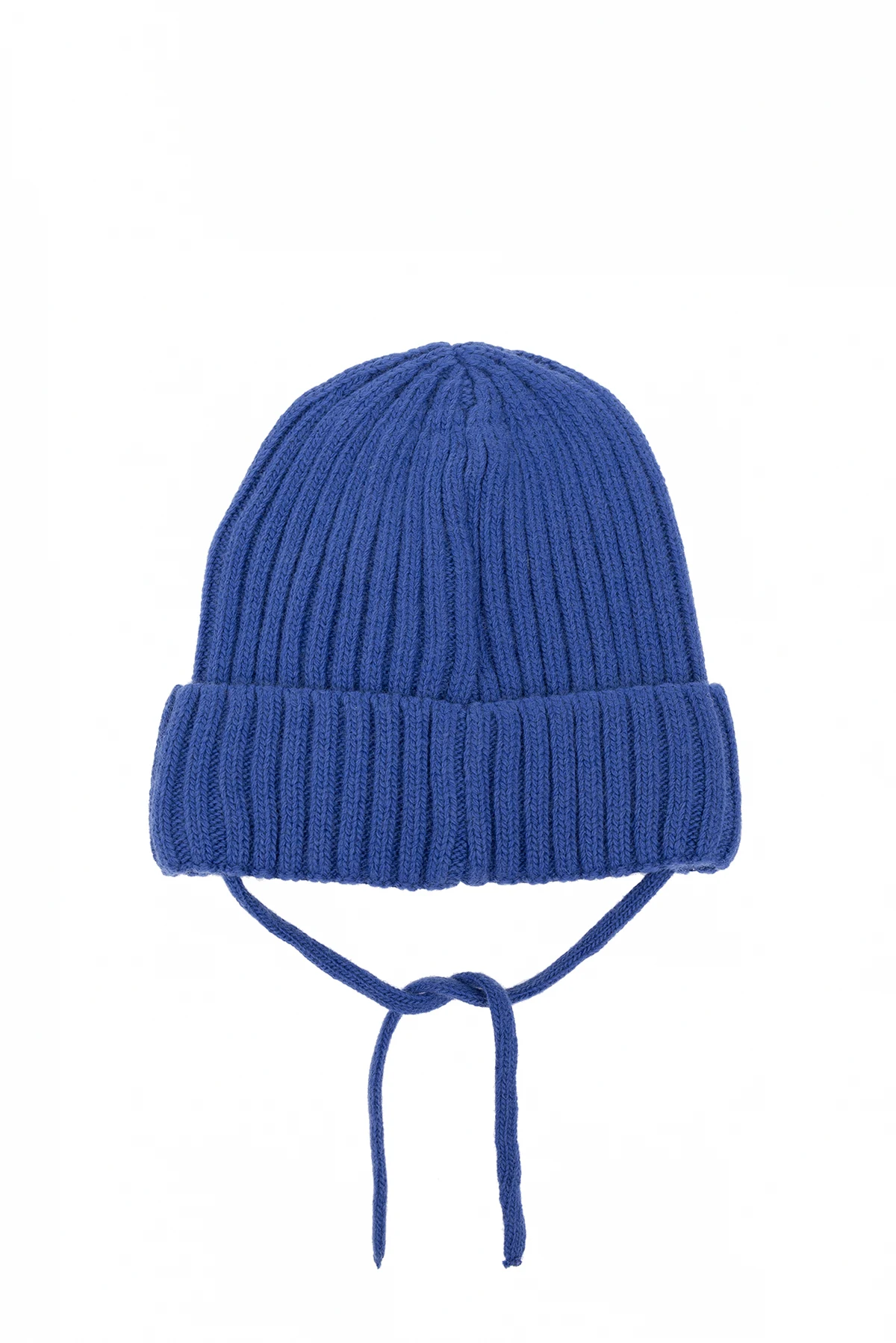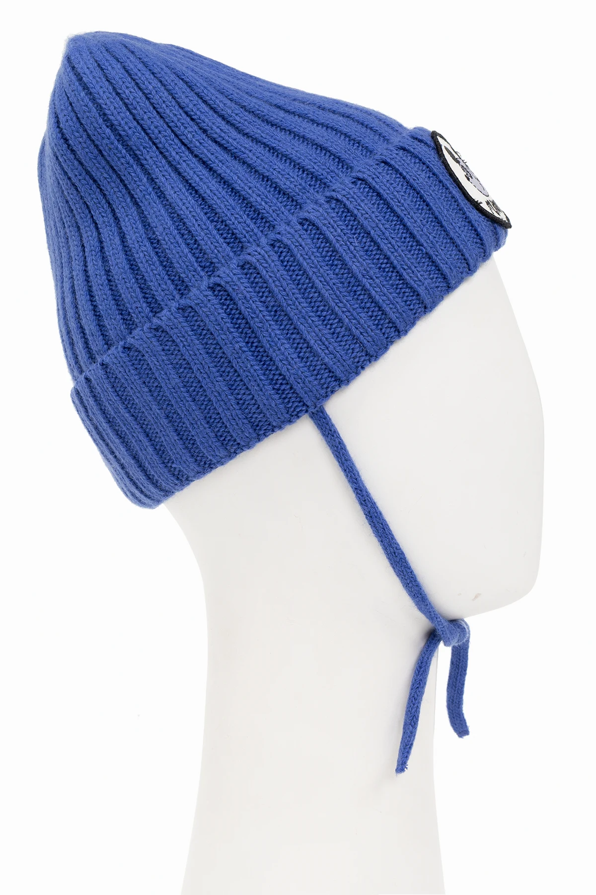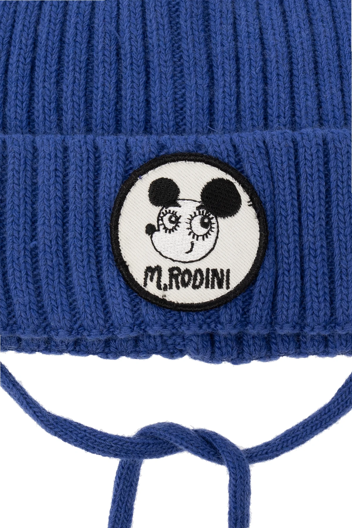 Blue beanie from Mini Rodini. Crafted from a cotton and organic wool blend with the GOTS certificate, this item ties with drawstrings and showcases a logo patch and white and black