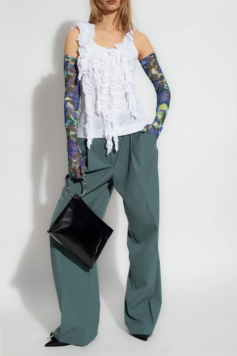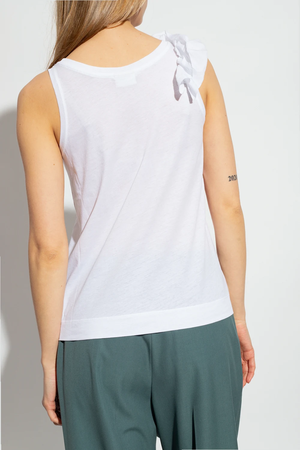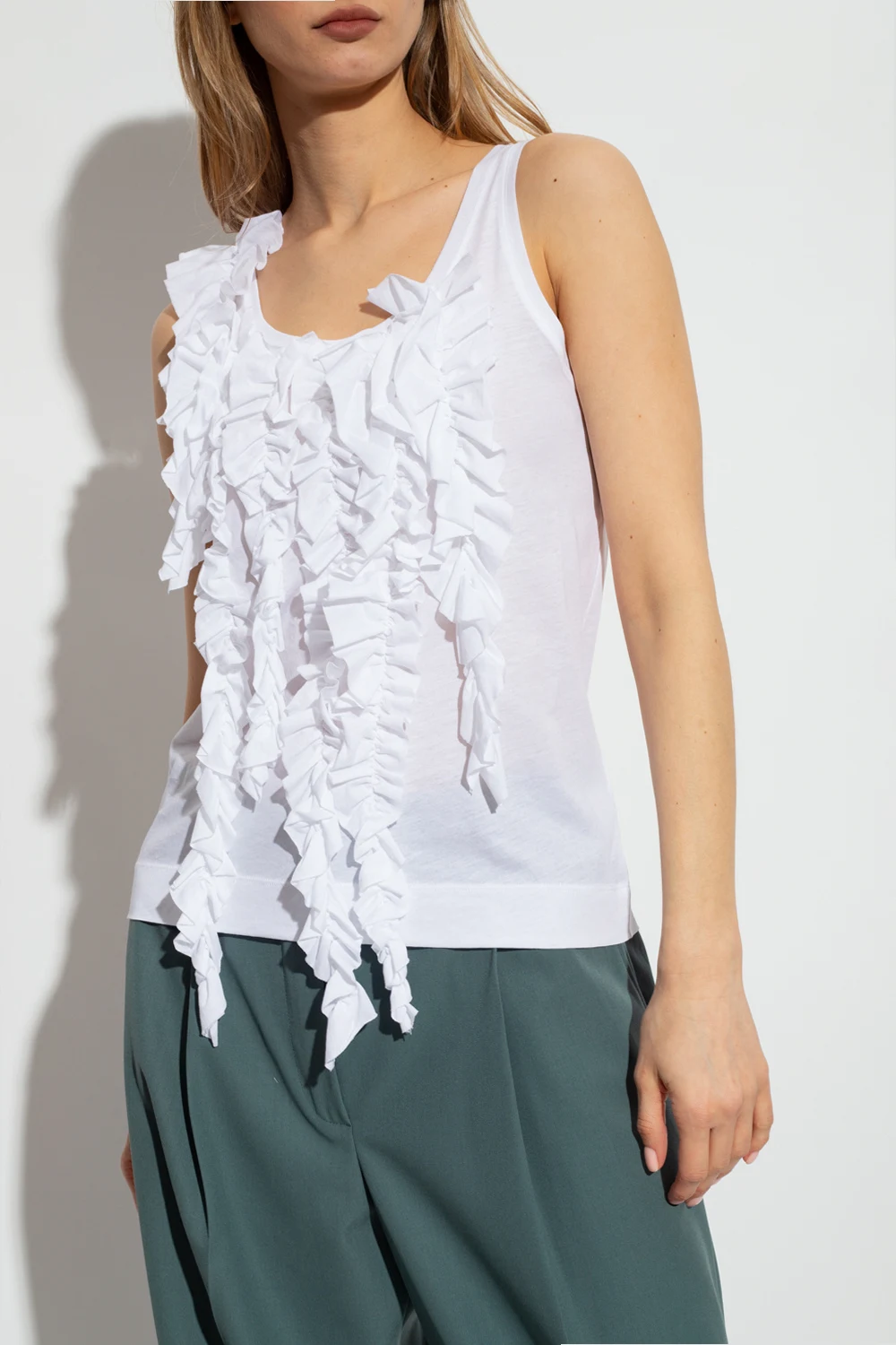 White sleeveless top from Dries Van Noten. Made of cotton, this style features a round neck and ruffle detailing.