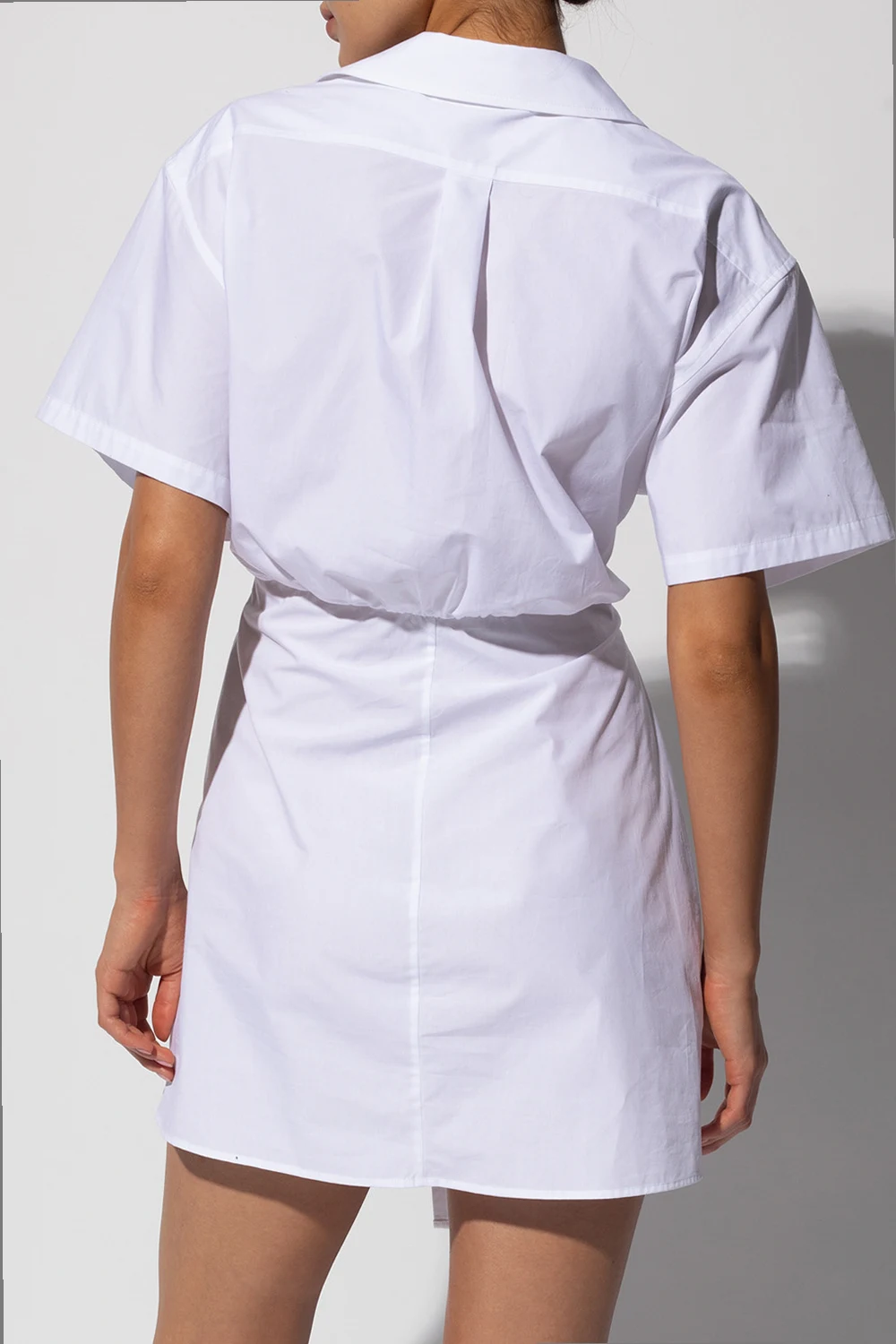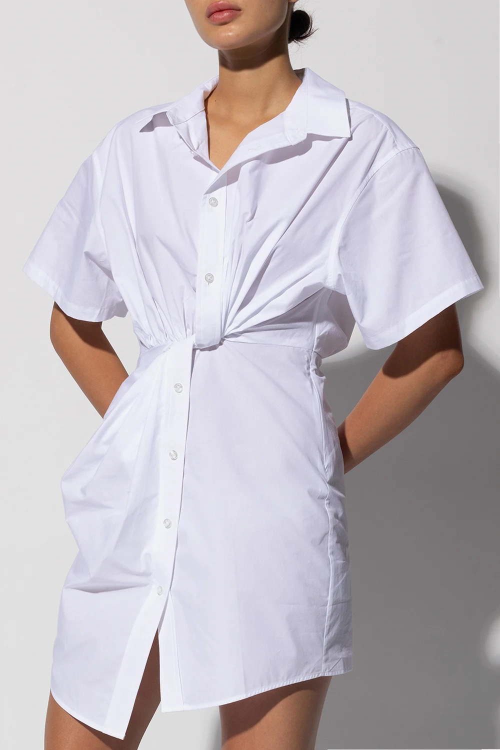 White mini dress from Alexander Wang. Crafted from cotton with an asymmetrical hem, this style features a button placket to the neck, a side zip fastening, long sleeves and gathered details.