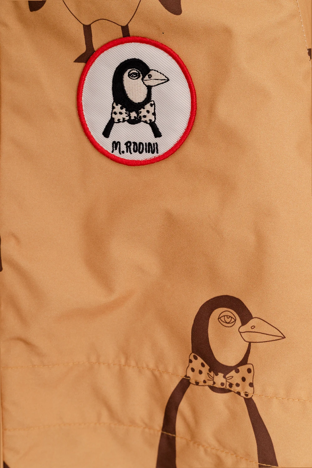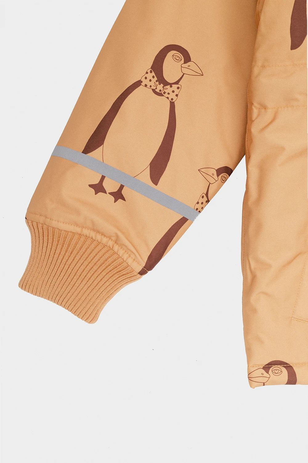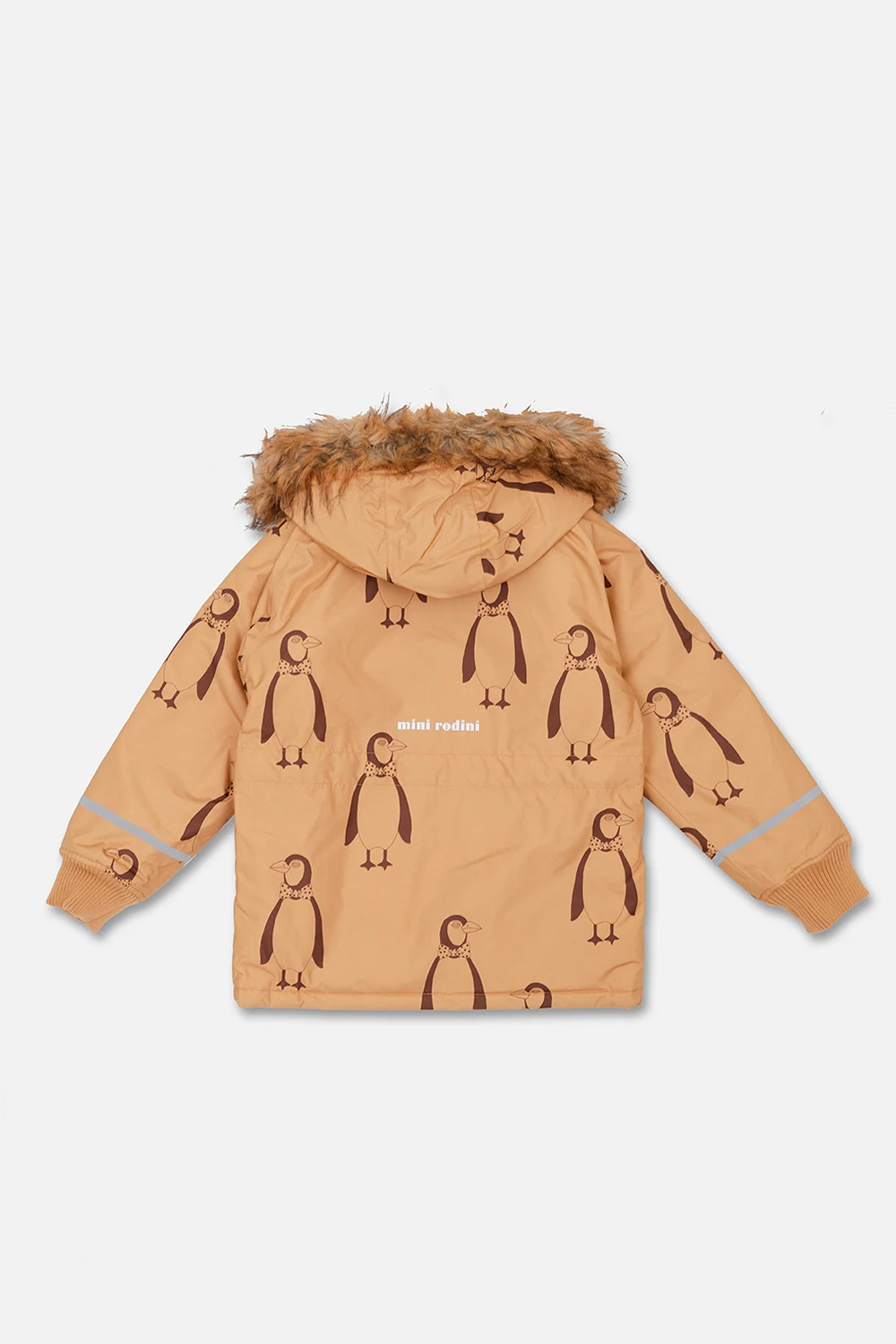 Beige water- and windproof jacket from Mini Rodini. Crafted from 100% recycled polyester made of a functional and heavy-duty shell fabric with taped seams and water repellent BIONIC-FINISH® ECO coating. Fastened with a zip and snaps, this garment features a brown penguin motif, multicolored logo path, removable hood with faux fur, reflective details, two zipped front pockets and long sleeves with ribbed cuffs.