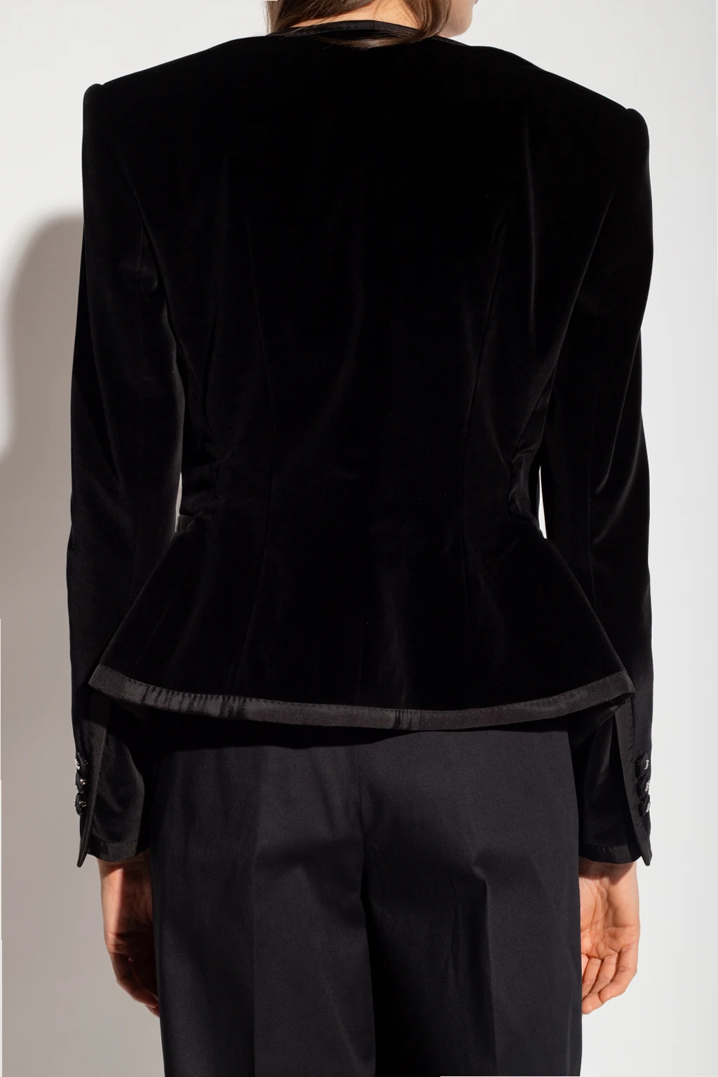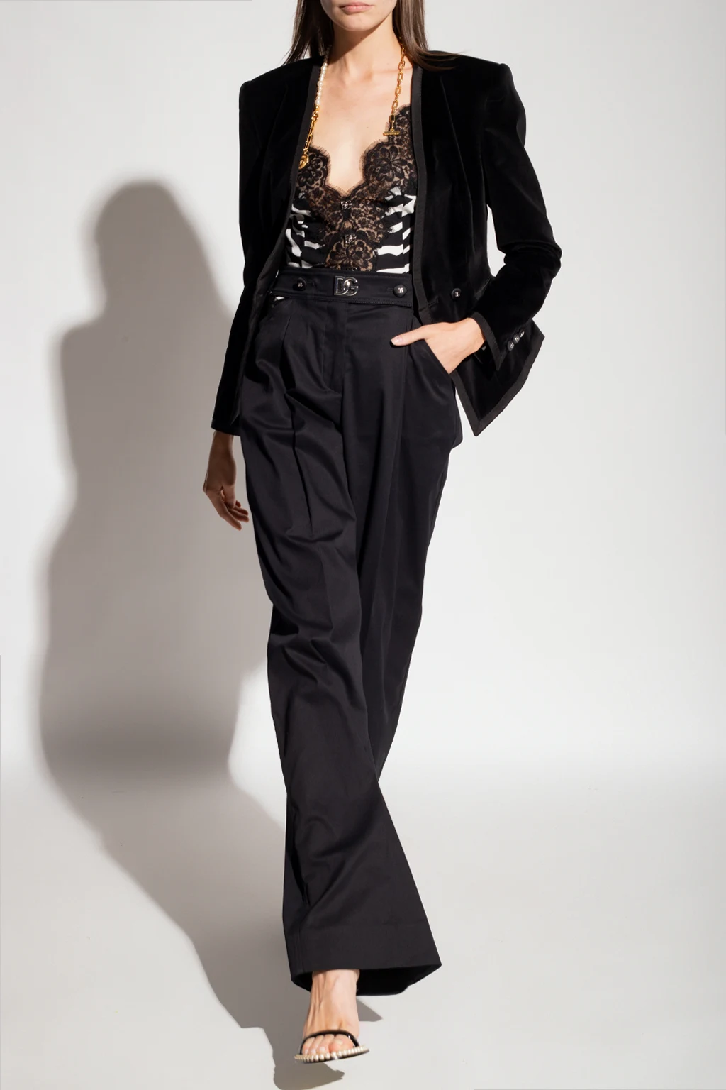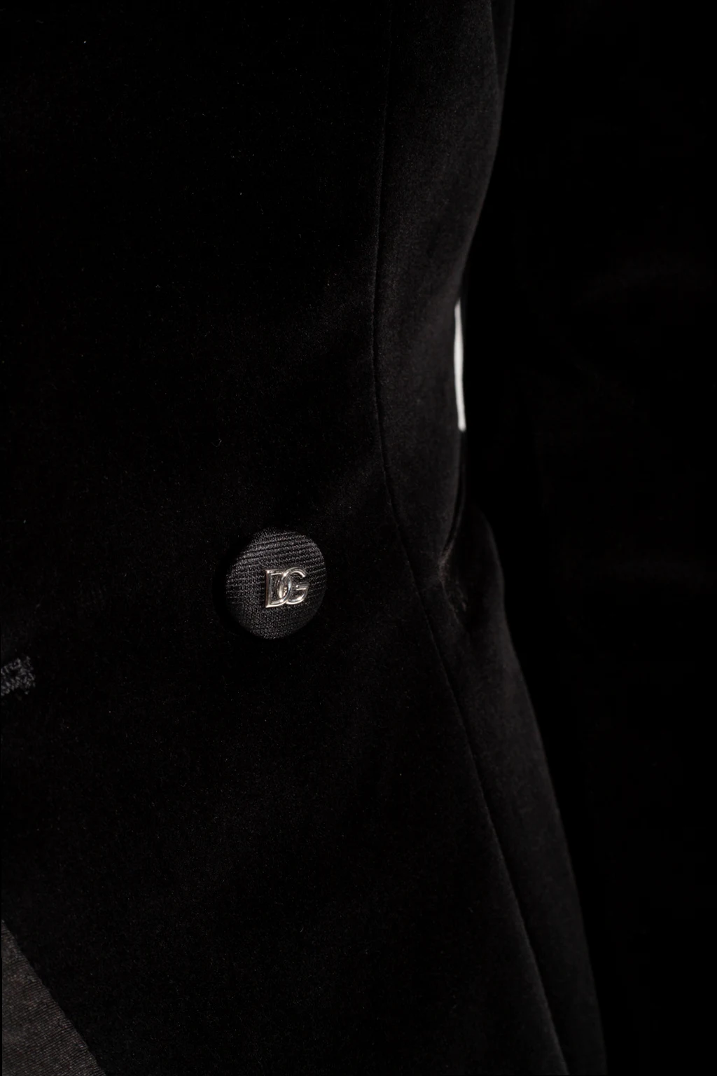 Black double-breasted fitted blazer from Dolce & Gabbana. Made of velvet, this model is complete with buttons with a metal logo appliqué, fitted silhouette, two slip pockets, long sleeves with buttoned cuffs, silk trimming and lining in black and white decorated with an animal pattern.