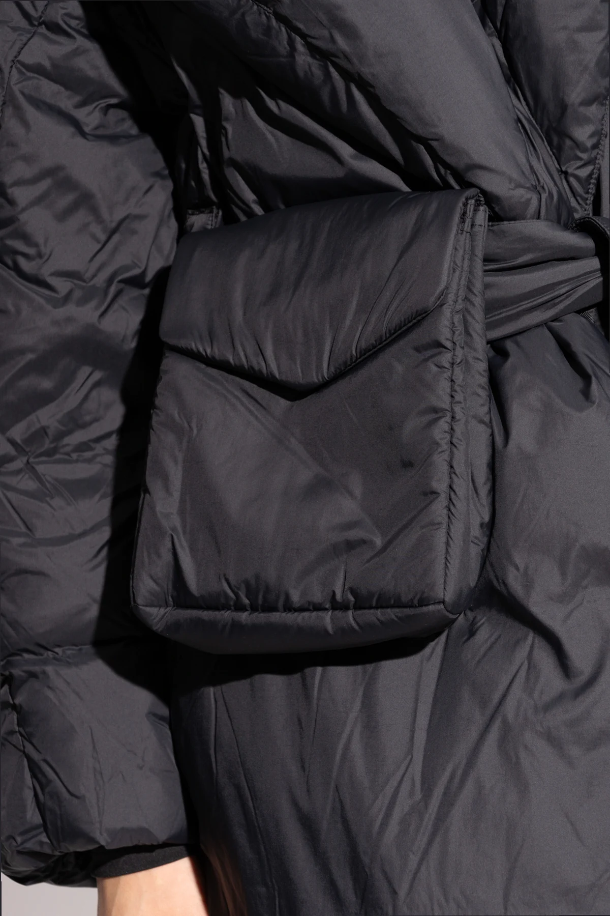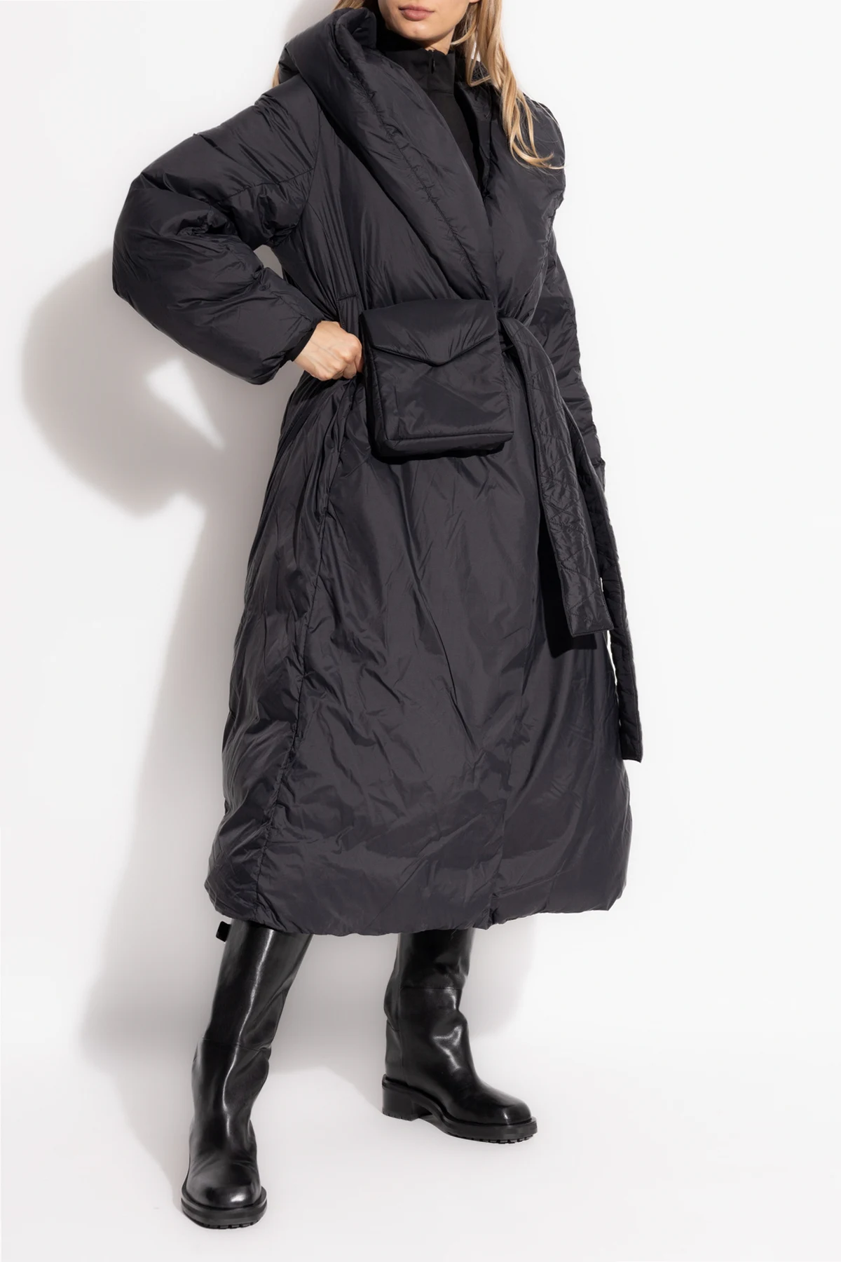 Das minimalistische Design des Mantels wird durch das breite, in der Taille gebundene Band betont, das eine perfekte Passform ermöglicht. Zwei Taschen mit Reißverschluss sowie eine zusätzliche Tasche am Gürtel sorgen für Praktikabilität und Funktionalität.