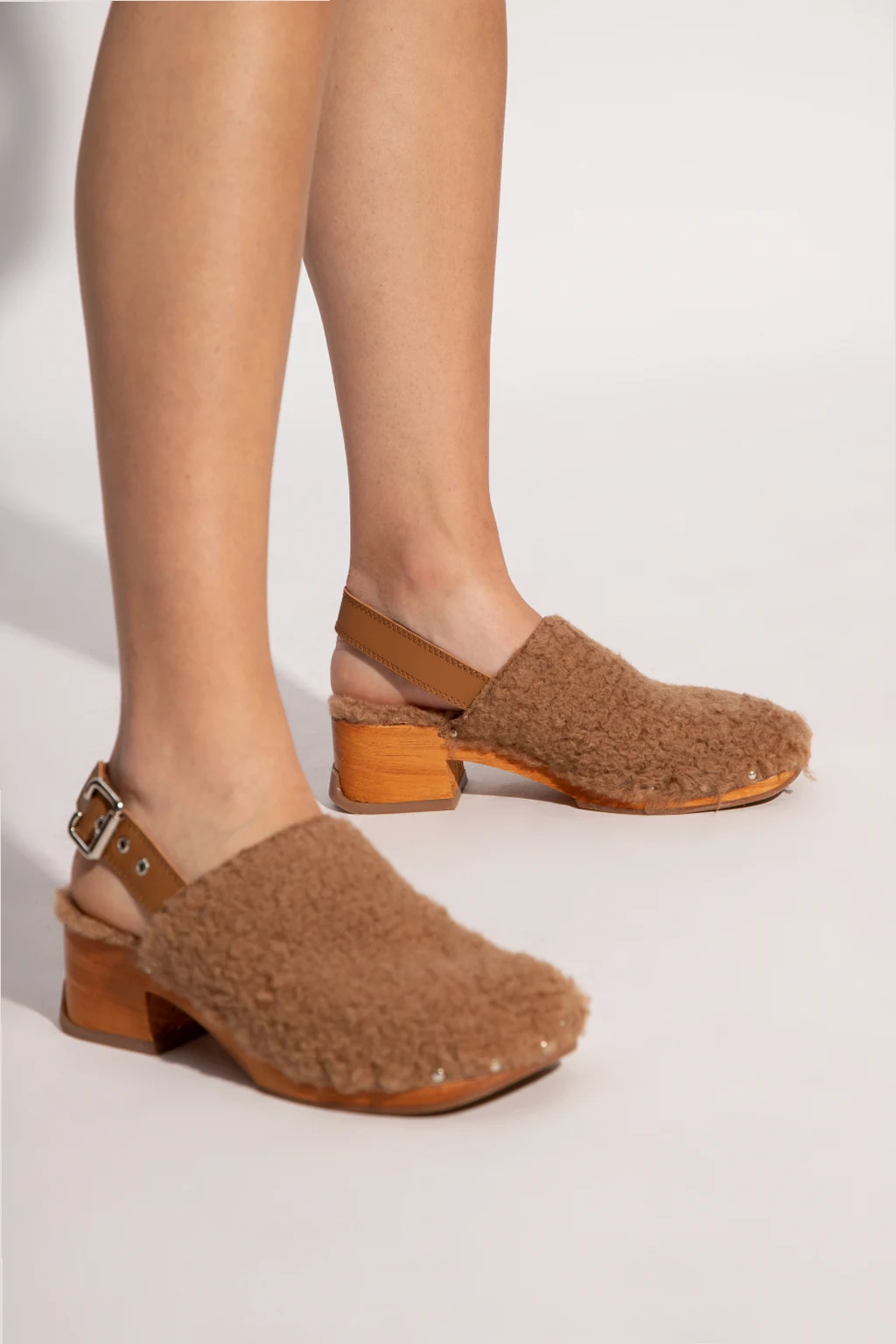 Brown ‘Lana’ pumps from Miista. Set on a brown rubber sole, this pair features faux fur trims and buckled ankle straps.