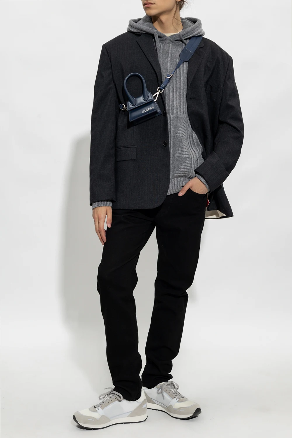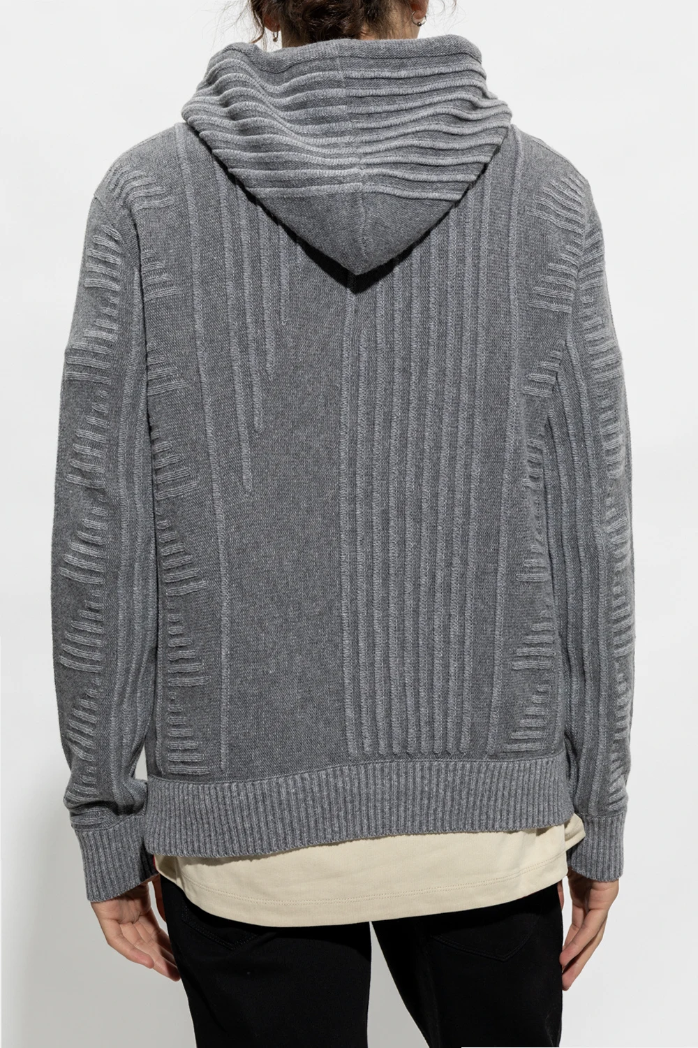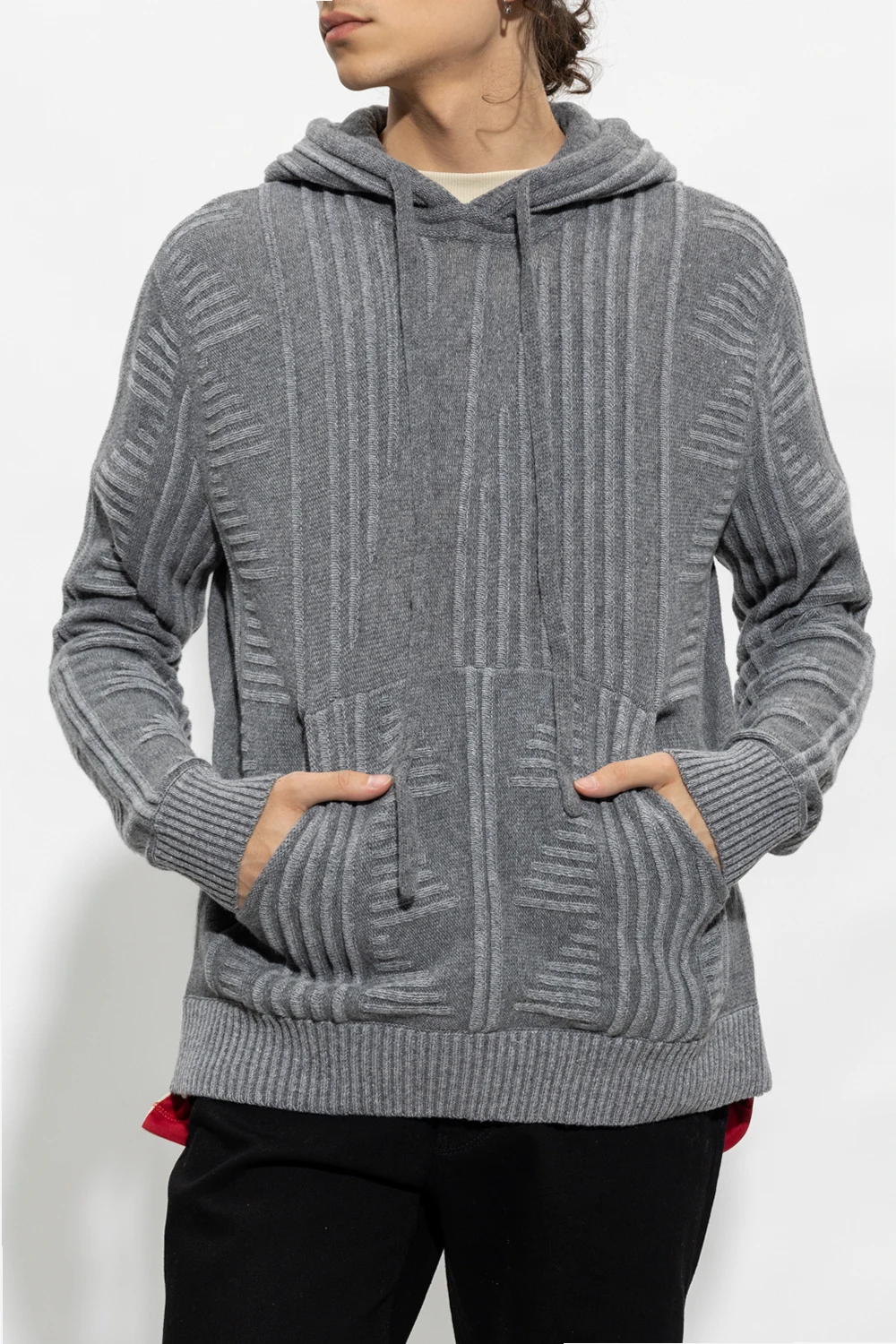 Grey sweatshirt with a drawstring hood from Emporio Armani. Crafted from wool, this item features an embroidered logo pattern, a kangaroo pocket and ribbed trims on the bottom hem and cuffs.