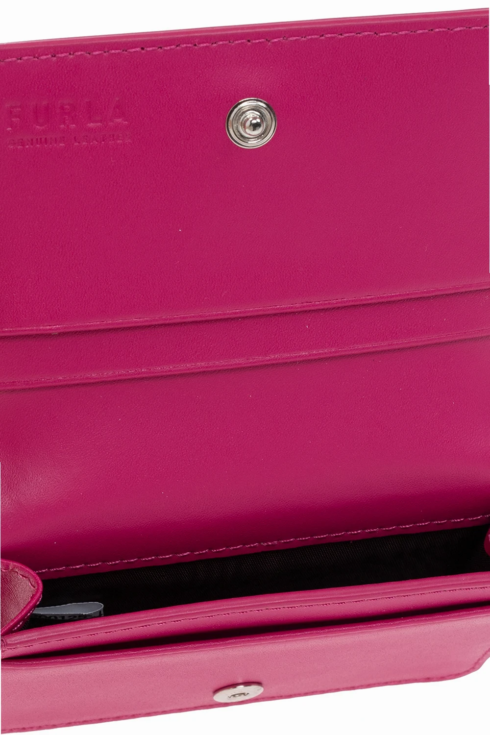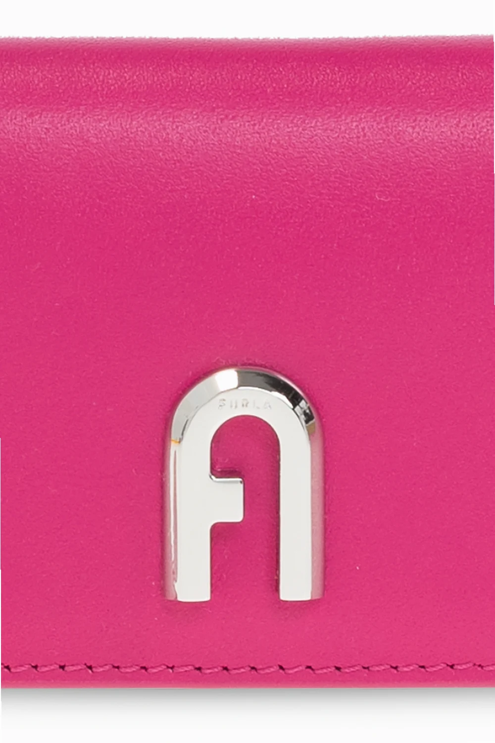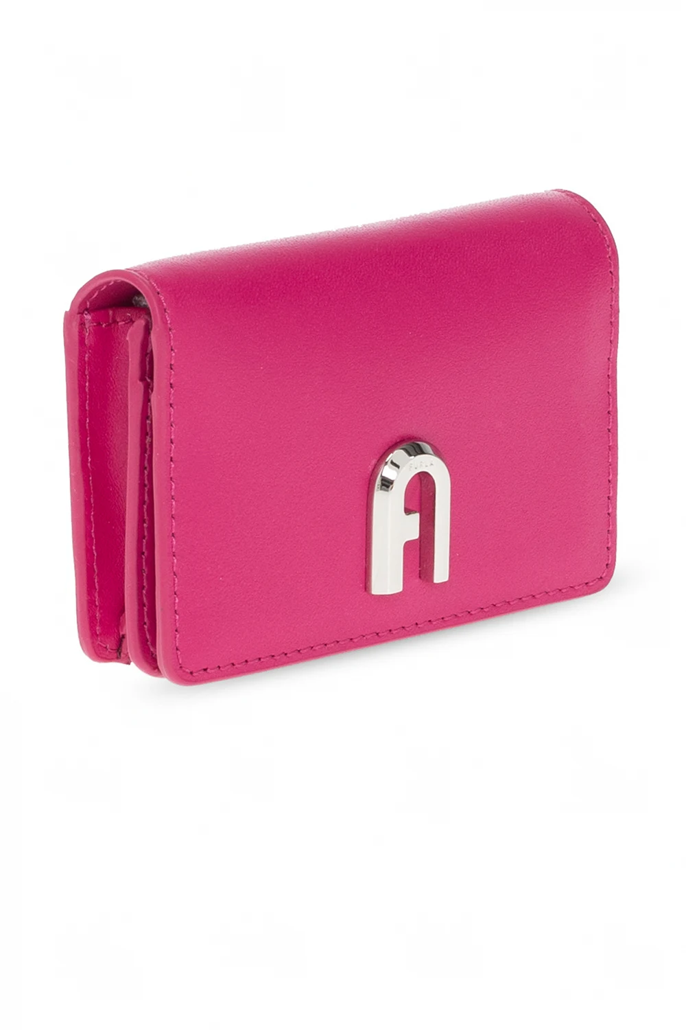 Pink ‘Moon’ card holder from Furla. Made of leather, this item features a snap closure, silver-tone metal logo and hardware as well as one internal compartment with three card slots.