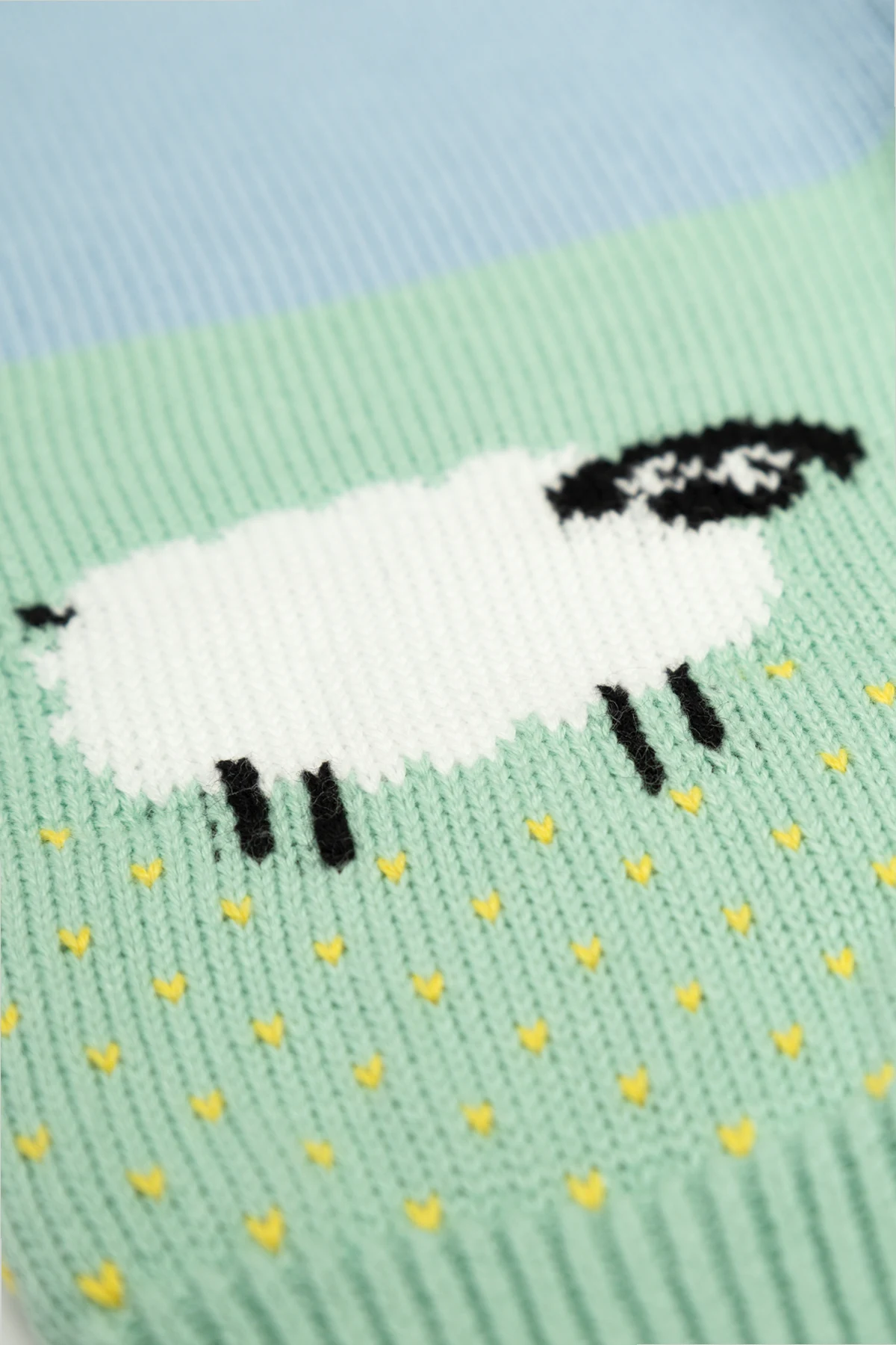 Sie stechen aus der Masse heraus dank ihrer lebhaften Farben, vom dominierenden Blau bis hin zu Streifen in Grüntönen mit gelben Akzenten. Der untere Teil der Beine ist mit einem helleren Grünton dekoriert, auf dem sich graziös platzierte Schafsmotive sowie subtile gelbe Akzente, die an Blumen oder Punkte erinnern, befinden. Das präsentierte Muster verleiht den Hosen Charme und betont ihre Einzigartigkeit.