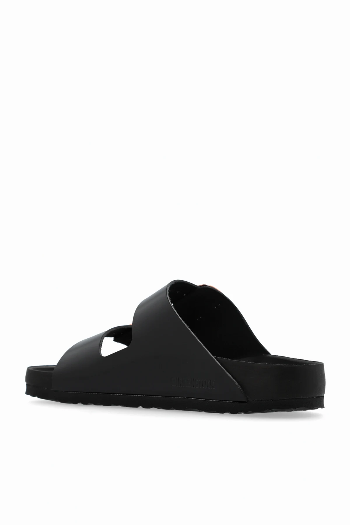 Die klassische Form dieser Sandalen, mit zwei breiten Riemen, die über den Mittelfuß verlaufen, sorgt für eine perfekte Passform und Stabilität. Die Riemen, gefertigt aus glattem, hochwertigem Lederimitat, bieten ein elegantes, mattes Finish in tiefem Schwarz. Verstellbar durch beeindruckende, kupferne Schnallen, fügen sie eine Note von Exklusivität hinzu und sind ein erkennbares Merkmal dieser Sandalen.