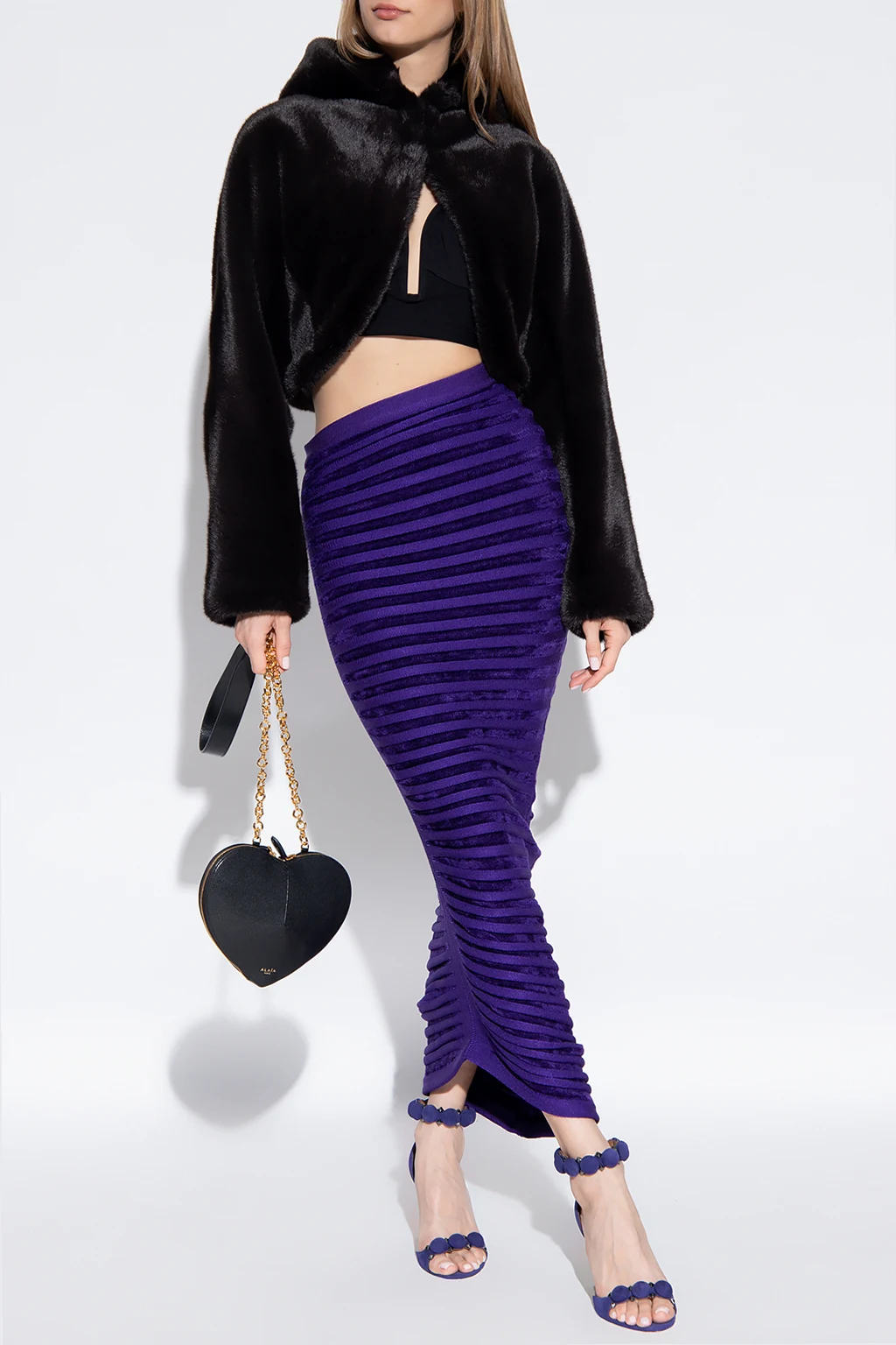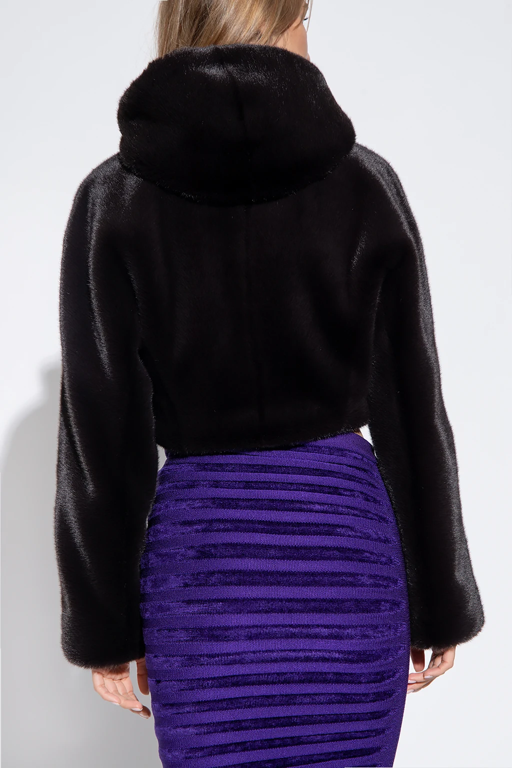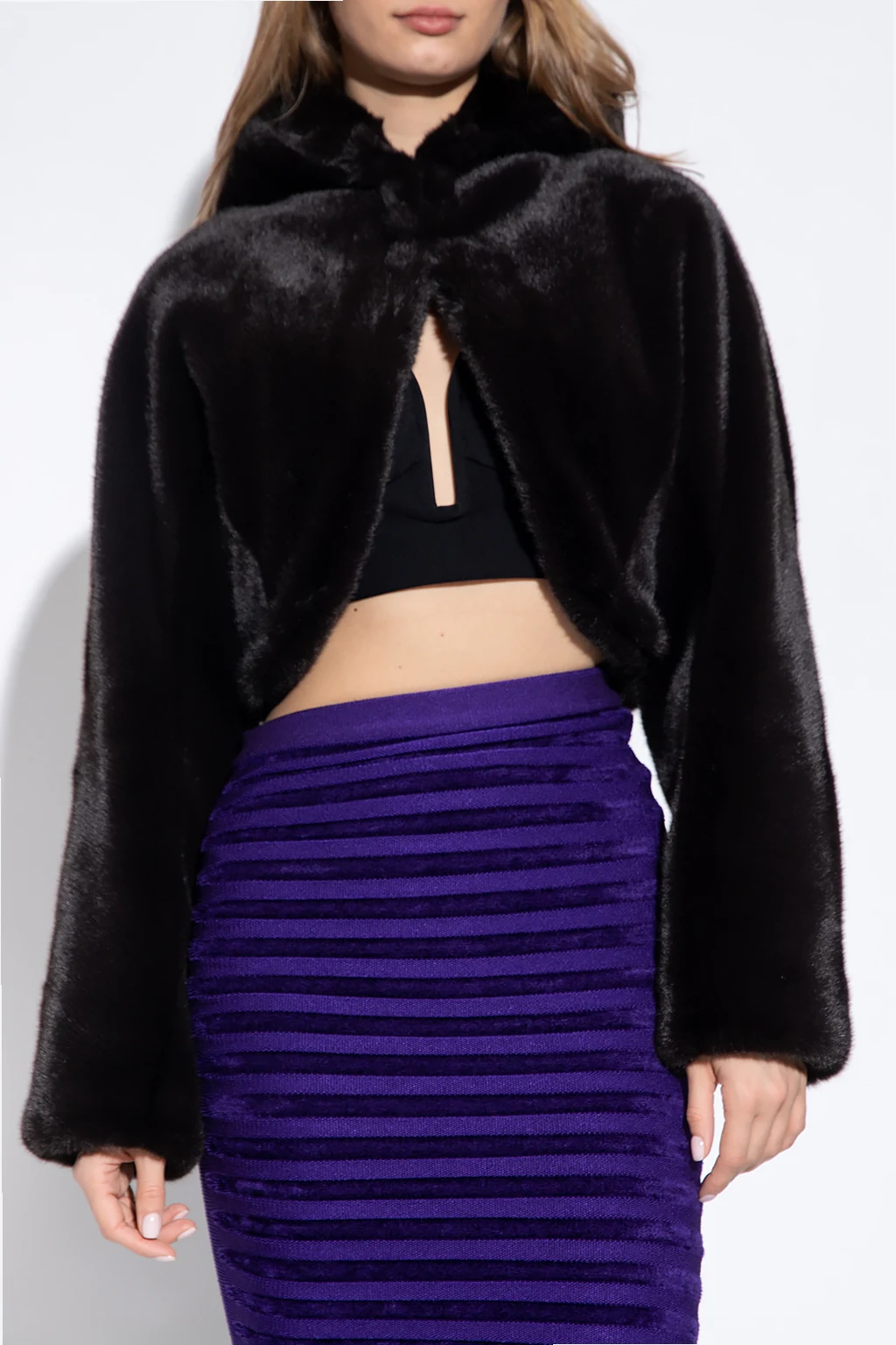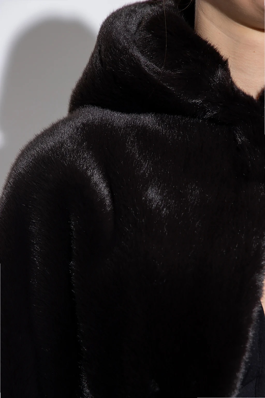 Black cropped hooded jacket from Alaia. Made of faux fur, this garment fastens with hooks.
