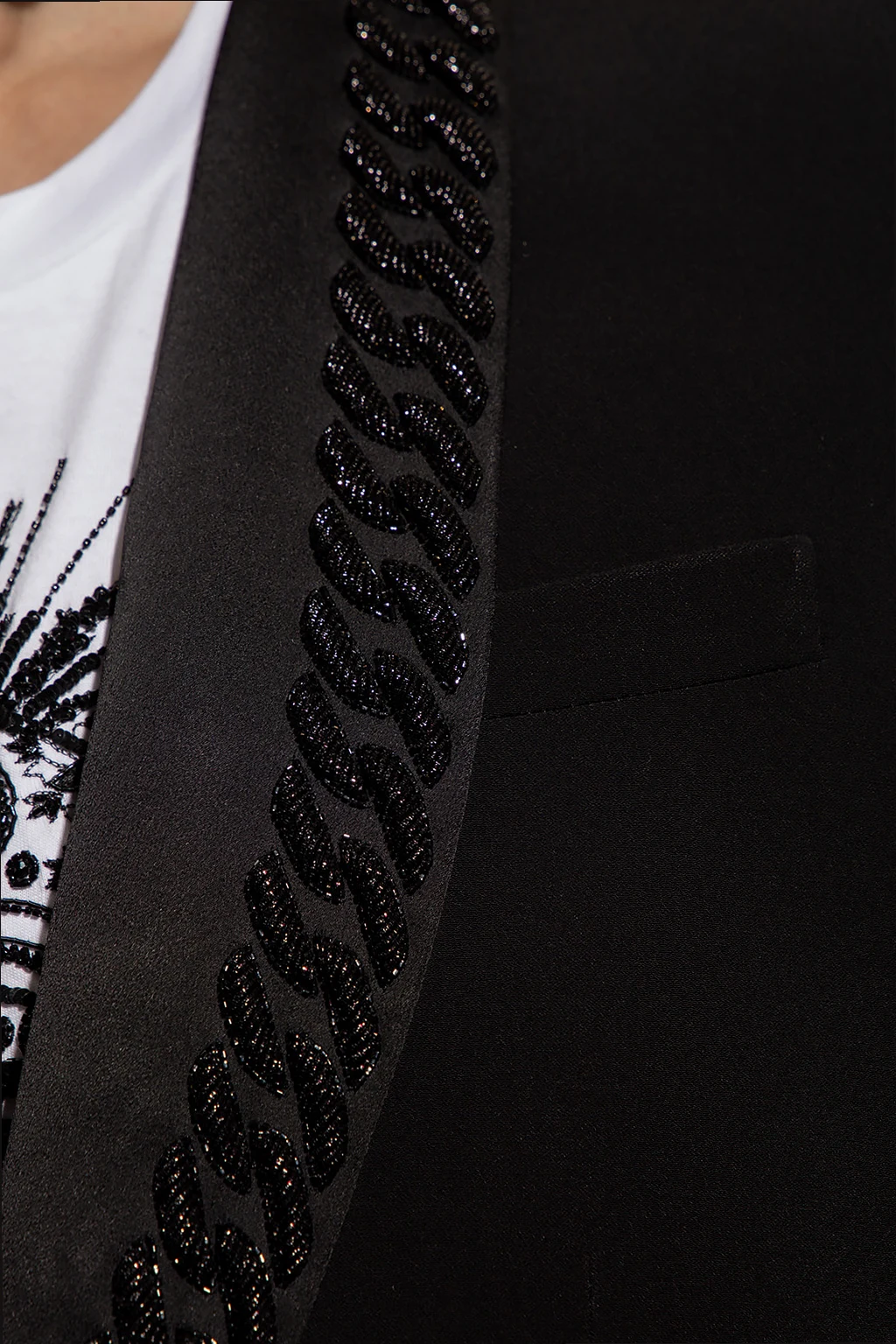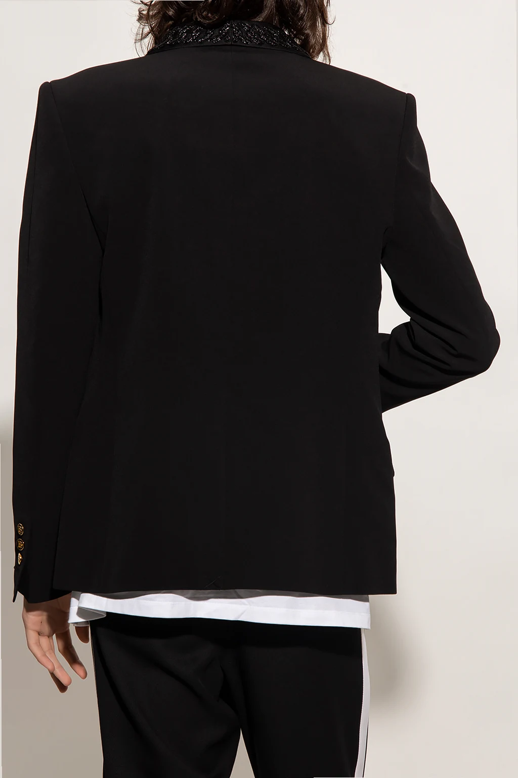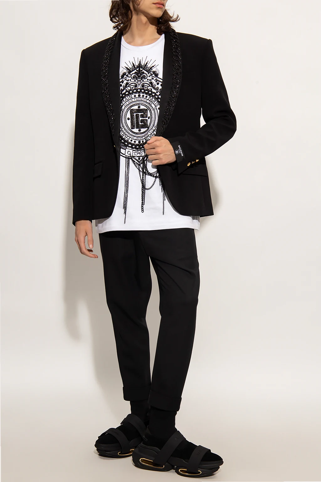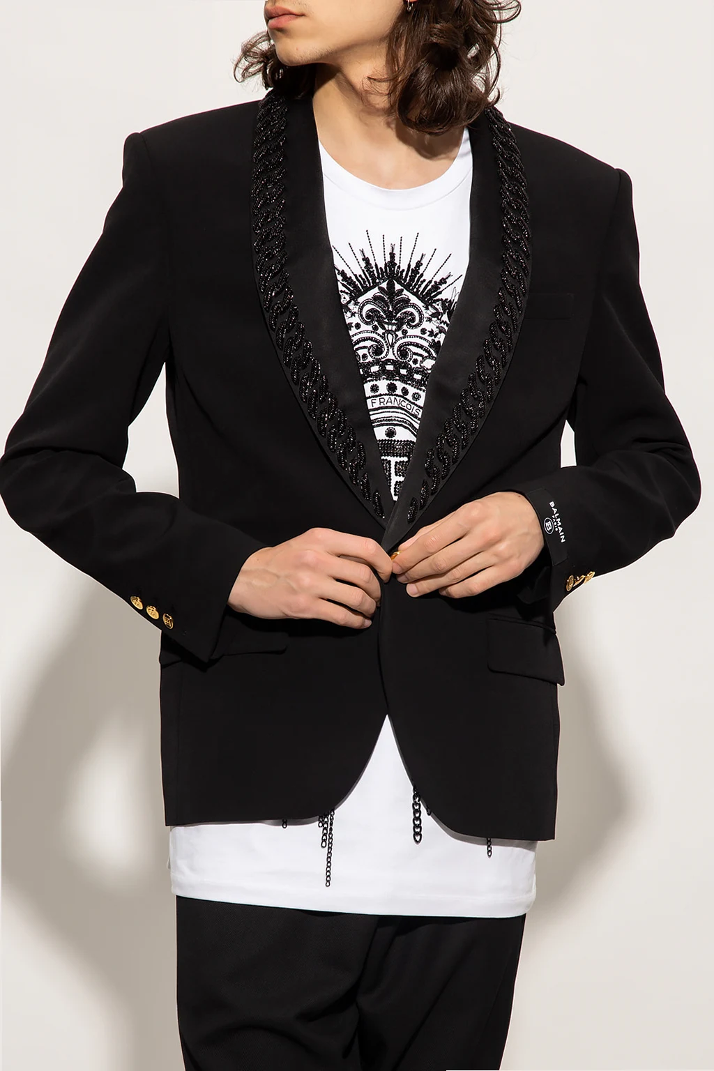 Black single-breasted blazer from Balmain. Fastened with a decorative gold-tone button, this style features a satin shawl collar accentuated with glistening chain applications, two flapped pockets, one slip pocket and long sleeves with button cuffs.