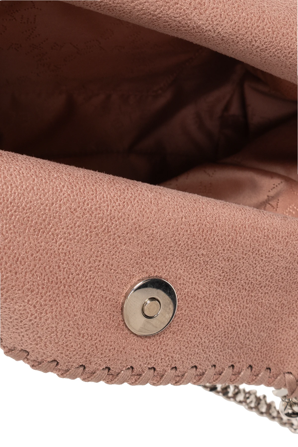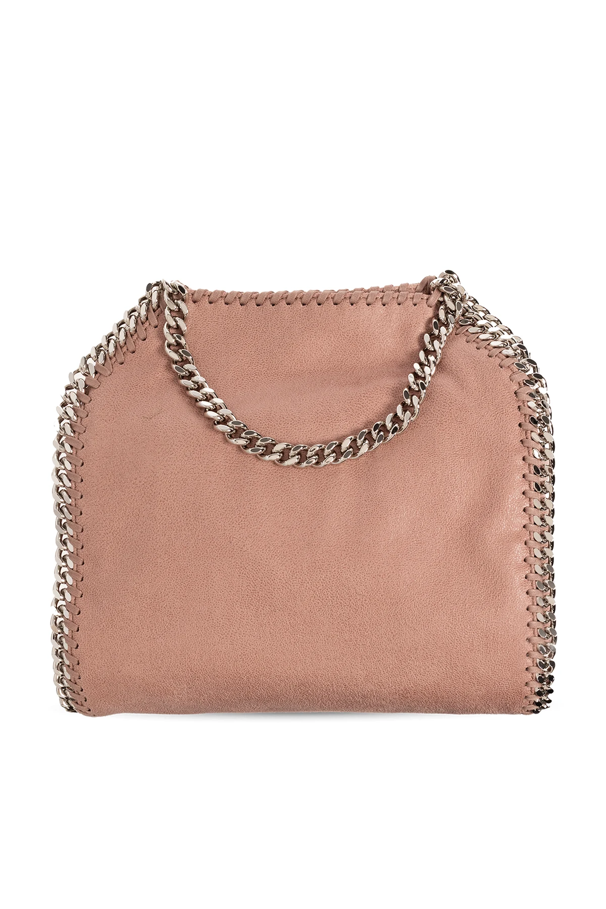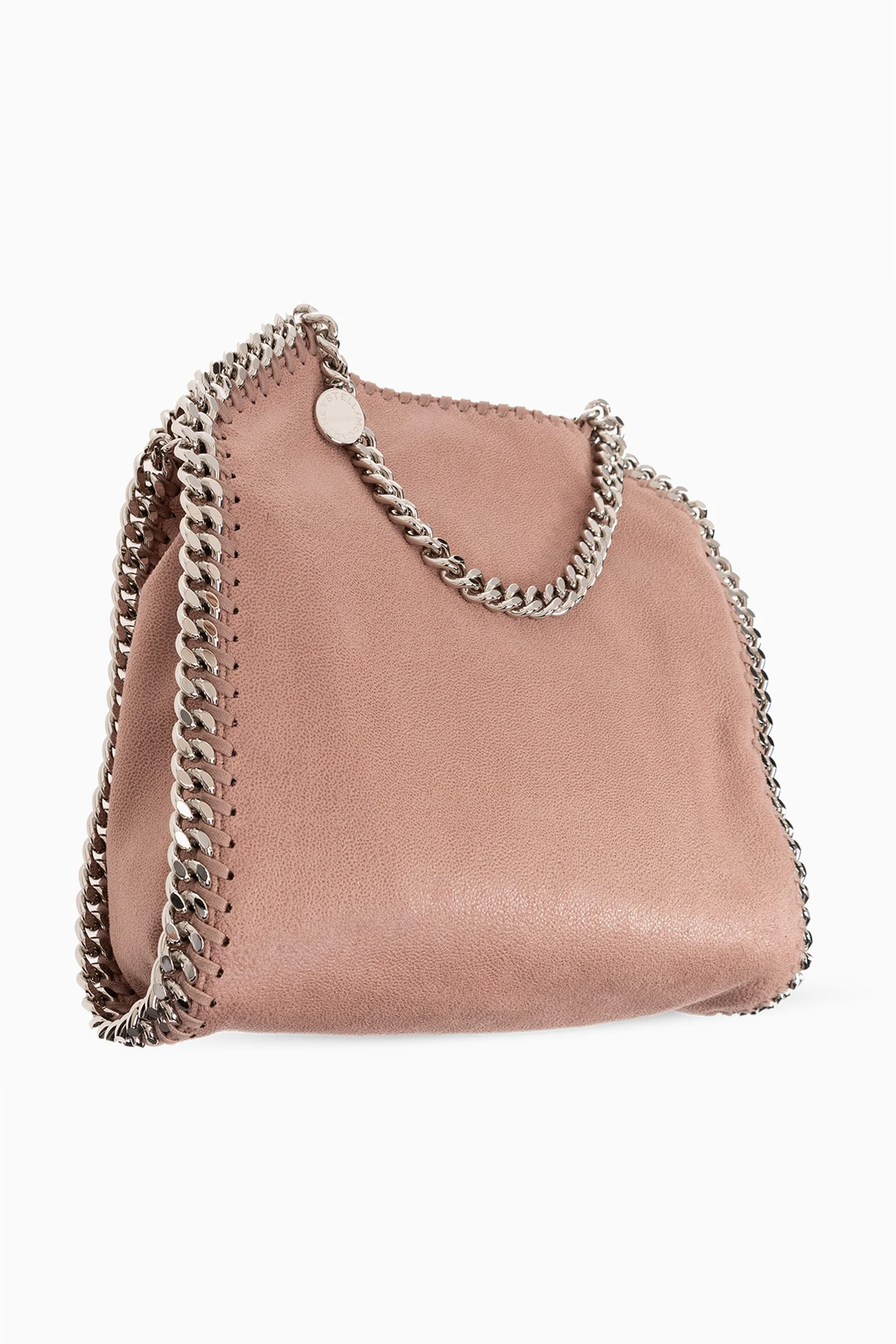 Pink ‘Fallabella Mini’ shoulder bag from Stella McCartney. Made from faux leather with suede trim, this design showcases a logo pendant, woven chain detailing, silver-tone metal hardware as well as a long chain strap, two chain handles and one internal compartment with a slip pocket.