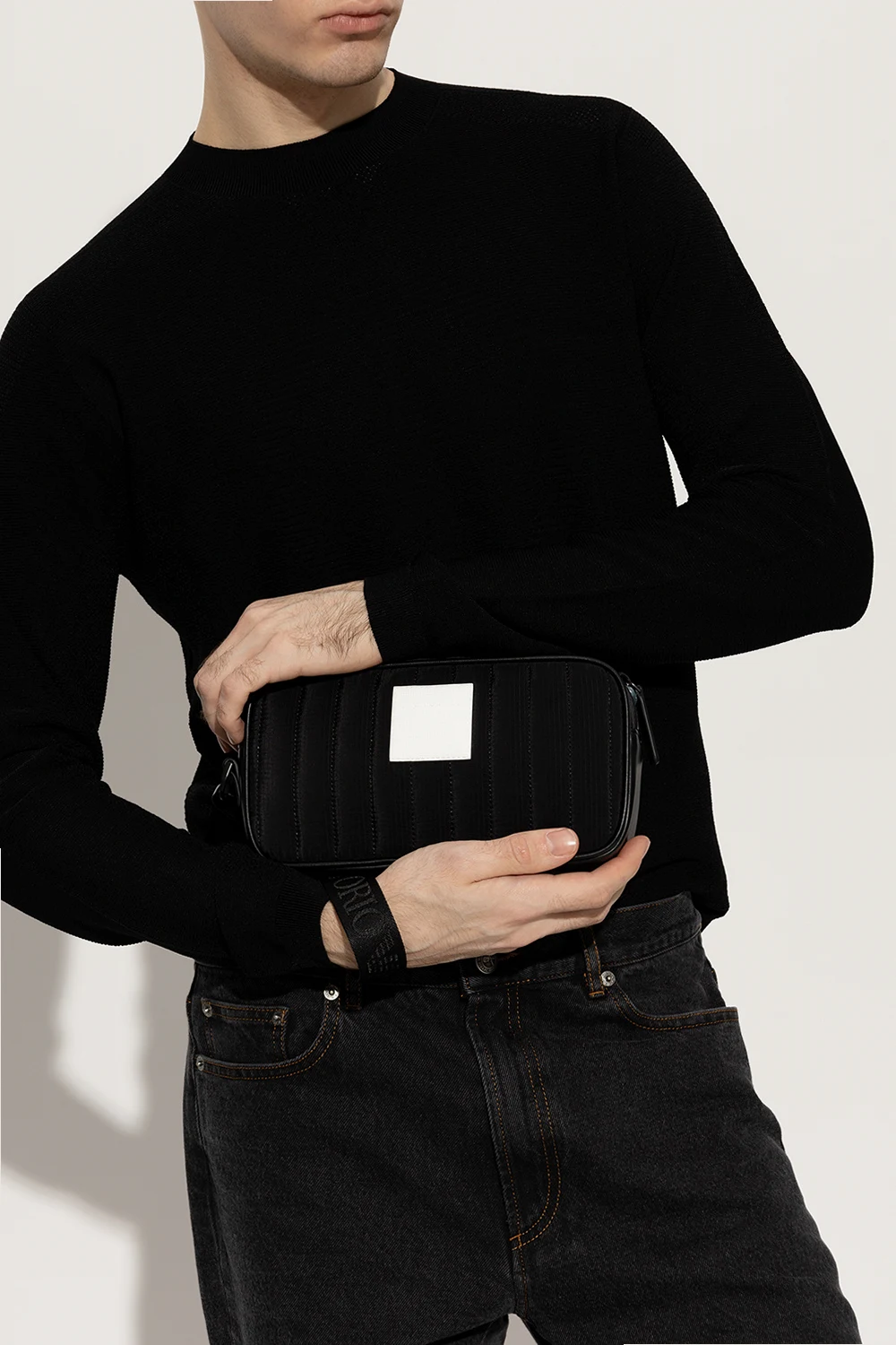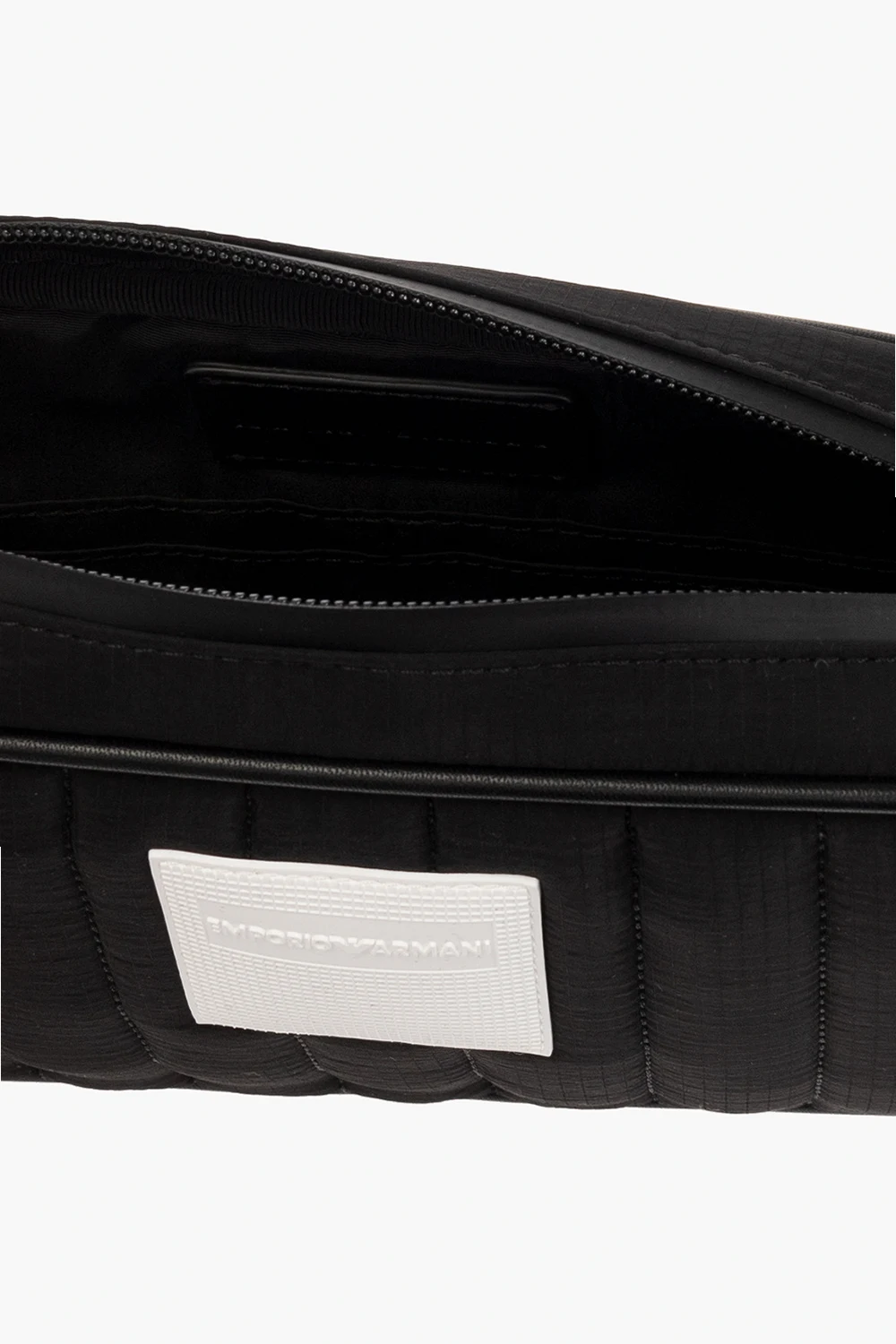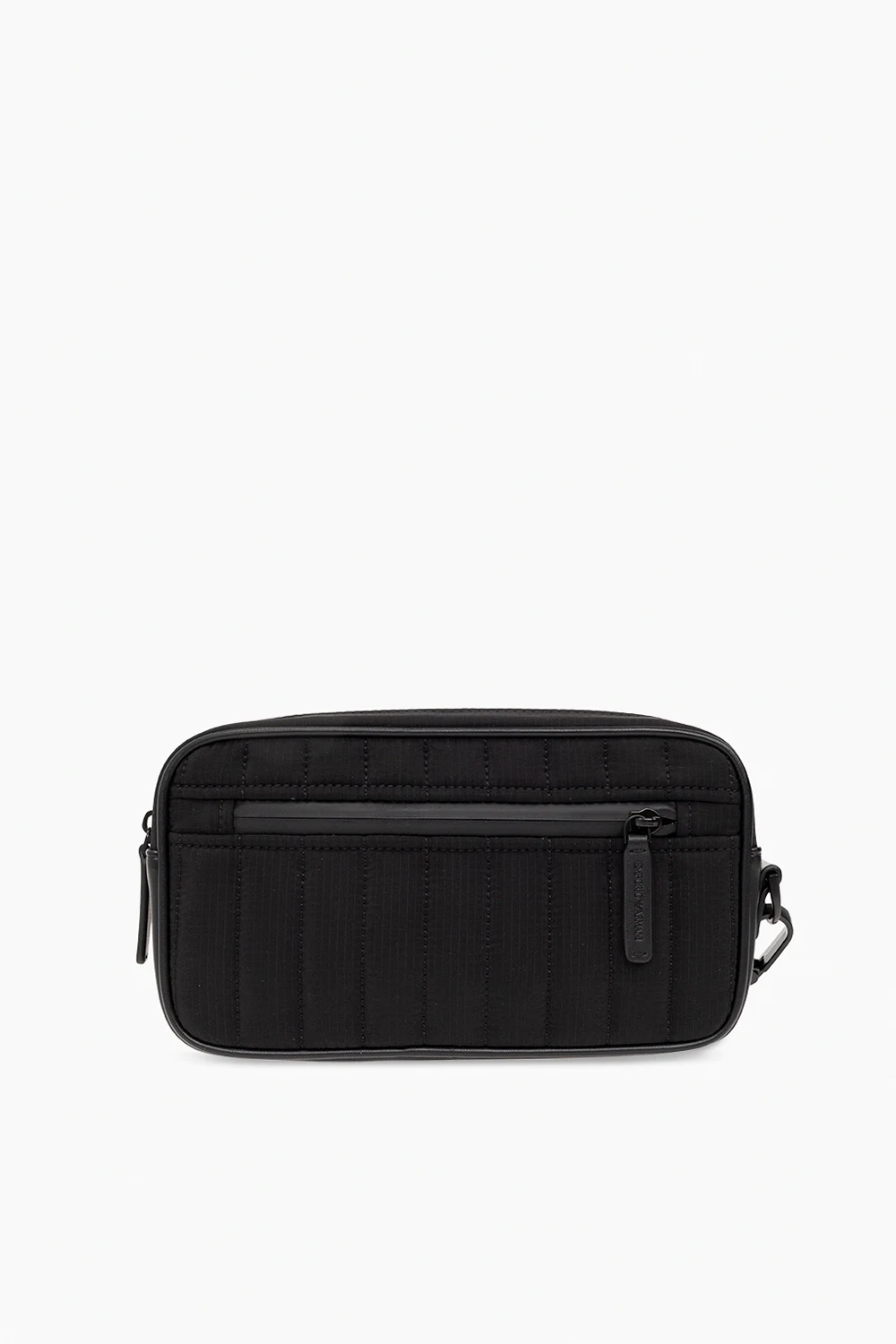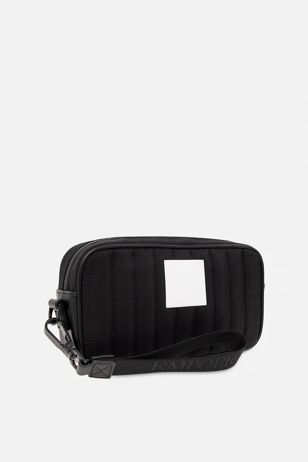 Black quilted wash bag from Emporio Armani. Crafted from recycled material, this design fastens with a zipper and showcases a white rubber logo patch on the front, a back zip pocket, a detachable wrist strap and one internal compartment with five slip pockets.