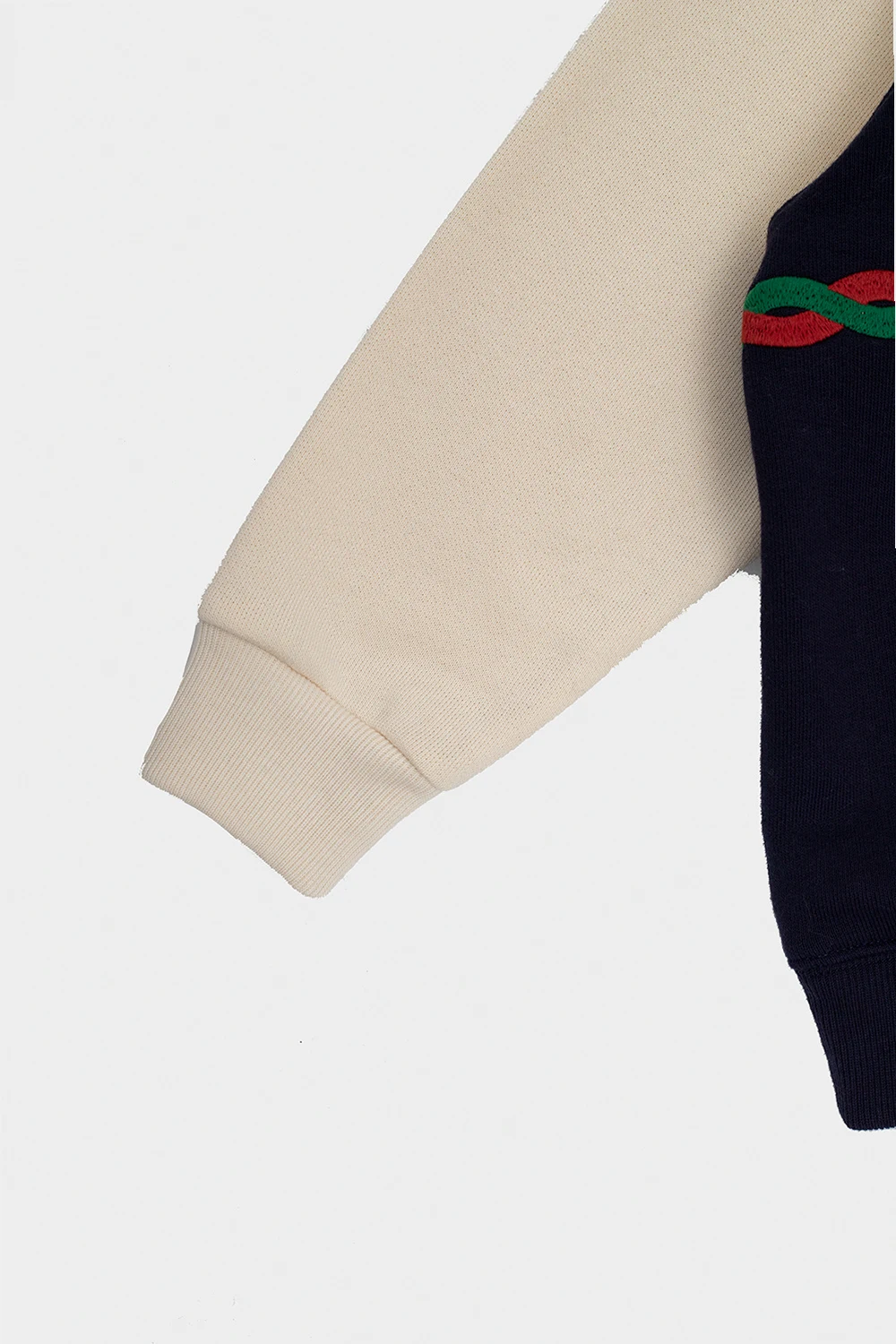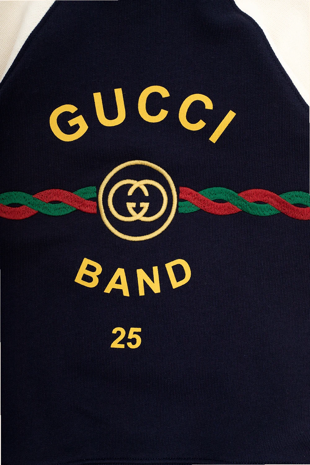 Navy blue and cream crewneck sweatshirt from Gucci Kids. Crafted from cotton, this style features colourful graphic embroidery accompanied by a logo print on the front, snap closures at the back, long sleeves and ribbed trims.