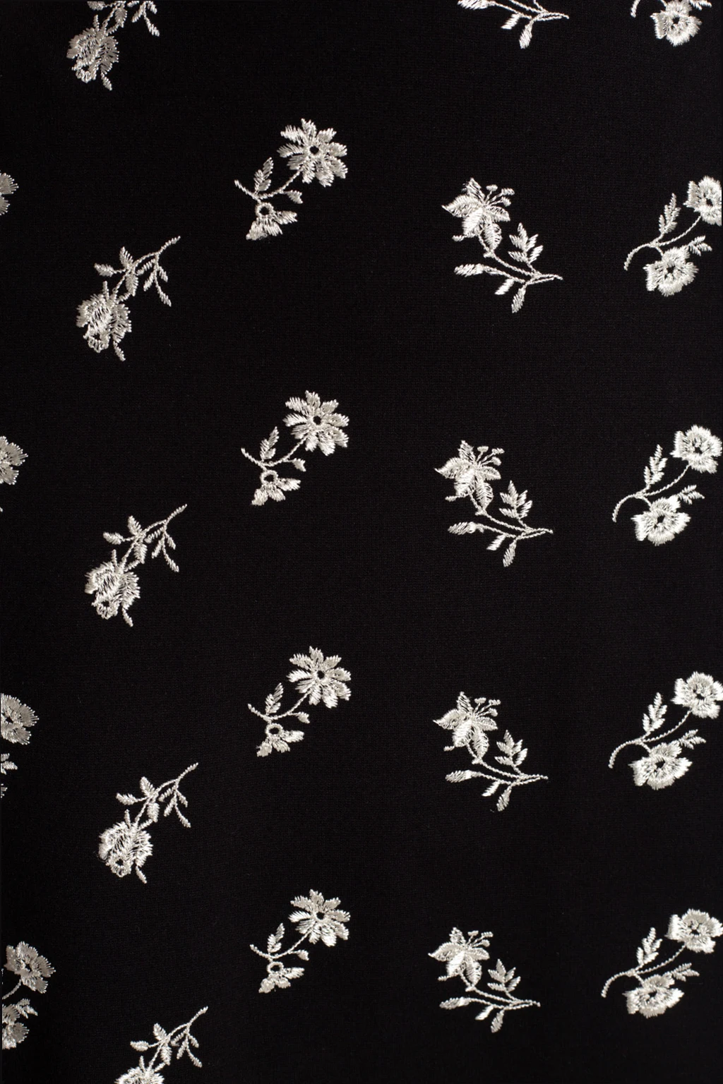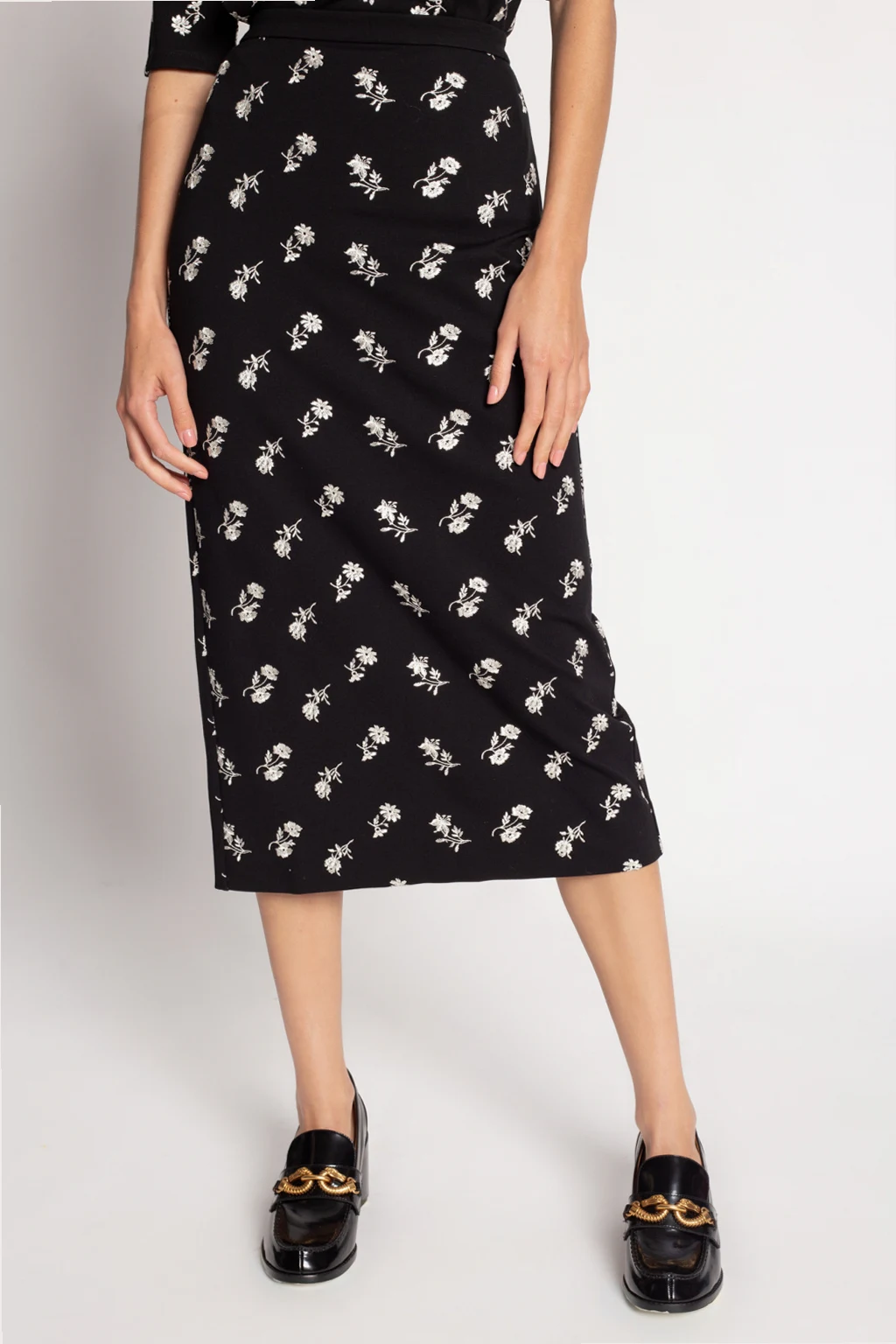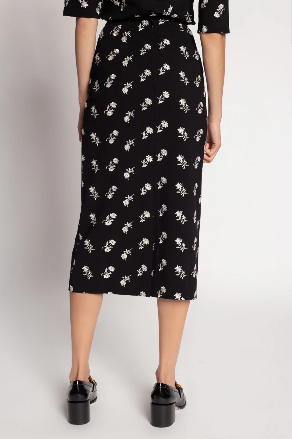 Black skirt from Erdem. Fastened with a back zip and hook, this design is enriched by slit at the back and embroidered floral motif in white.